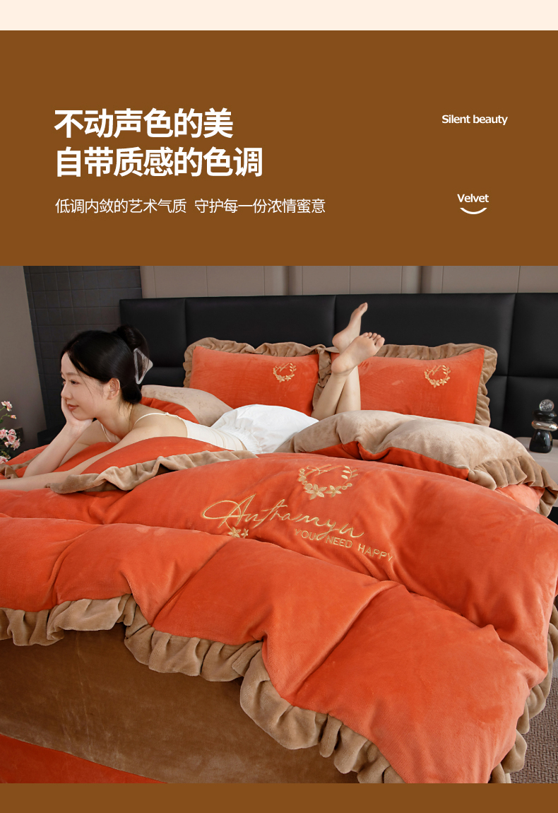 (总)找底底家纺 2022新款水晶绒蕾丝花边韩版四件套,大红,黛蓝,豆沙色,姜黄,墨绿,浅灰,玉女粉