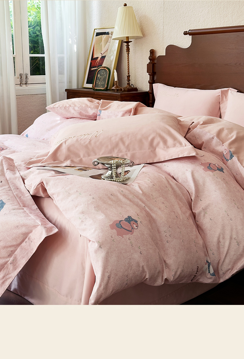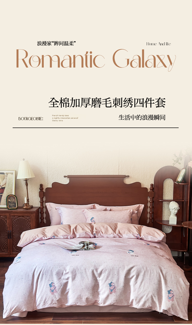 由丽家纺 2025新款亲肤全棉纯棉磨毛印加绣四件套 幸福熊-粉