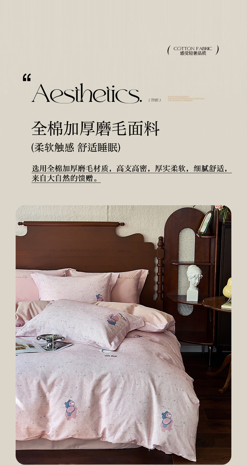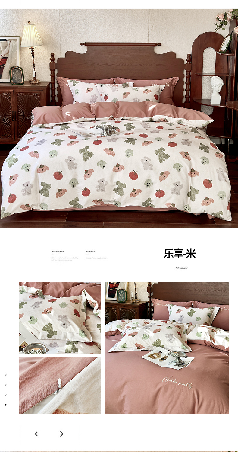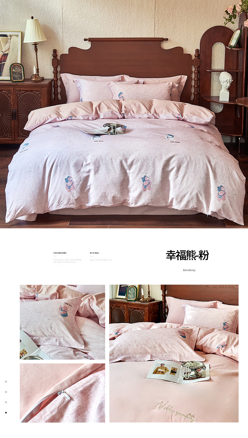 商品名称:由丽家纺 2025新款亲肤全棉纯棉磨毛印加绣四件套 幸福熊-粉