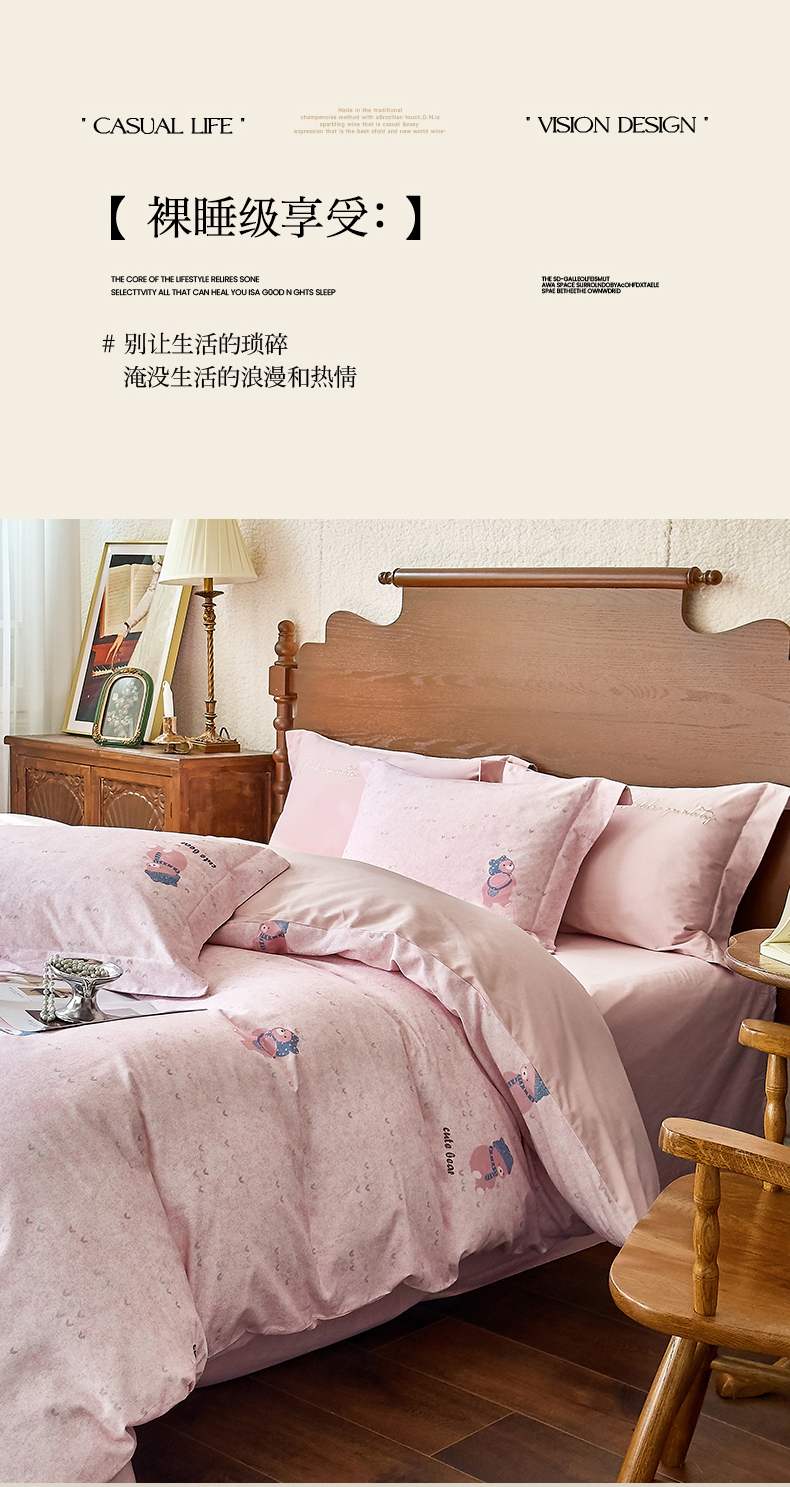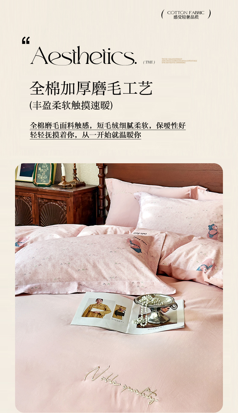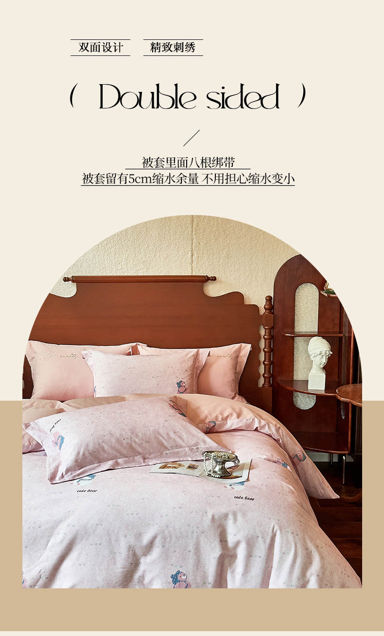 商品名称:由丽家纺 2025新款亲肤全棉纯棉磨毛印加绣四件套 幸福熊-粉