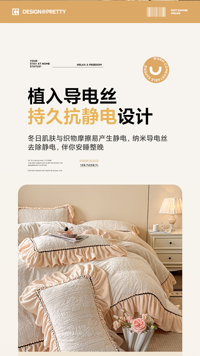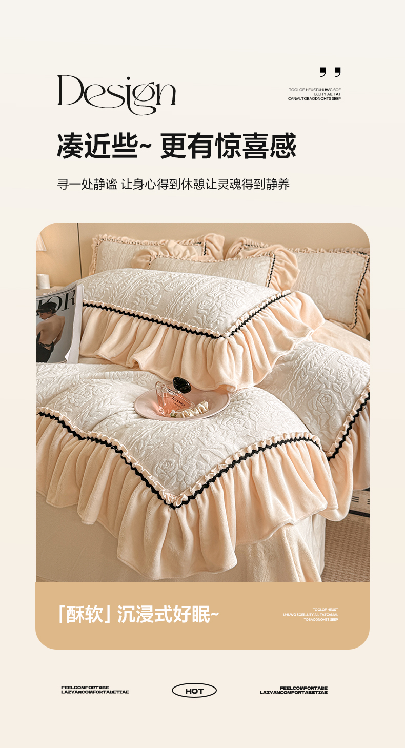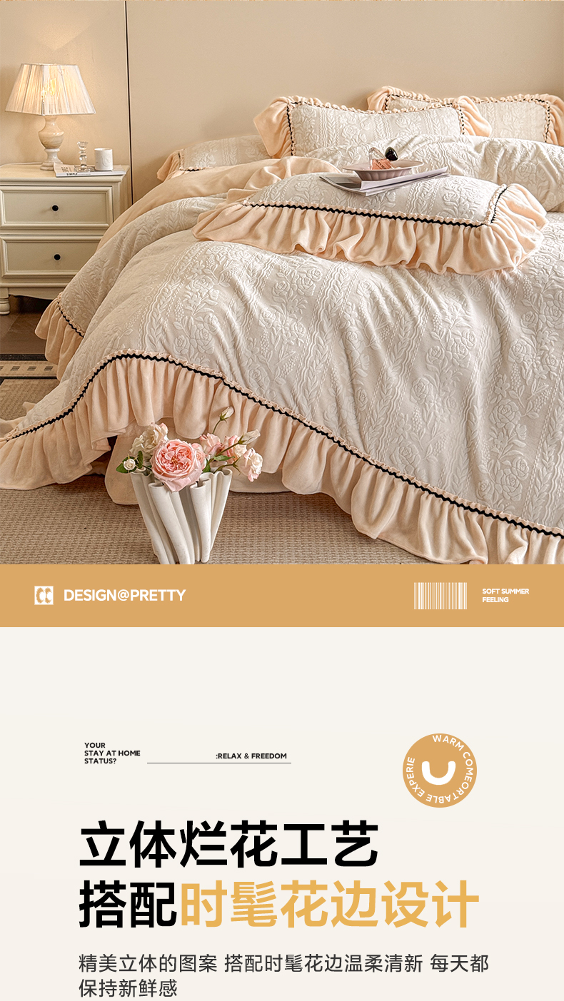 商品名称:民新家纺 2025新款牛奶绒烂花花边款四件套 臻爱花园 -米黄