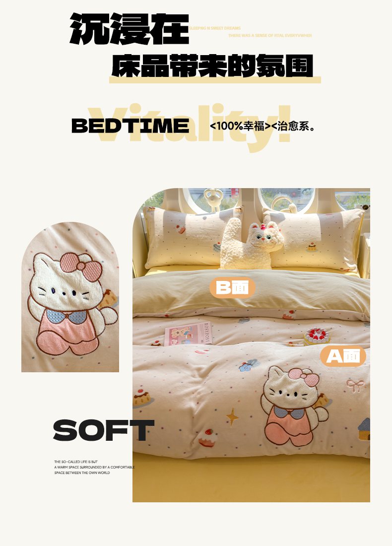 (总)摩妮卡 2025新款牛奶绒枕套混搭卡通复古床盖四件套,甜点凯蒂猫,傍晚凯蒂猫,幸运小猫,线条腊肠狗,生日小猫,粉帽小狗,豹纹小猫,庆祝凯蒂猫