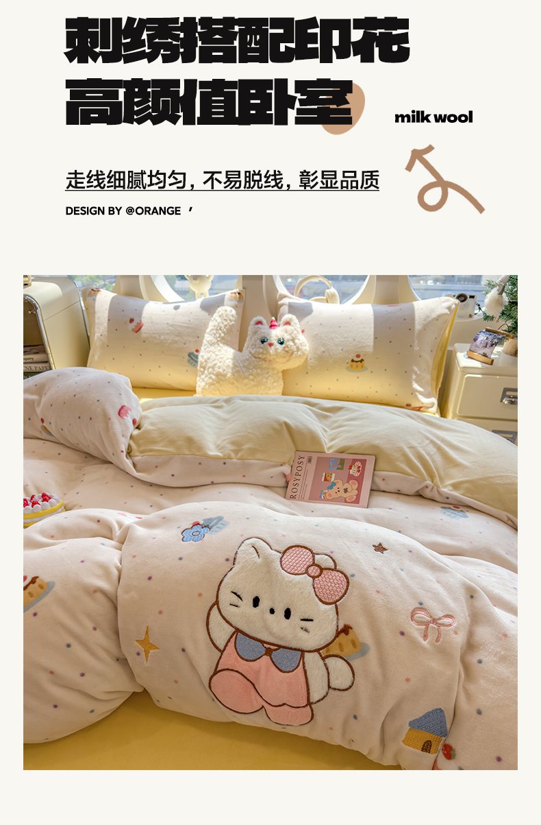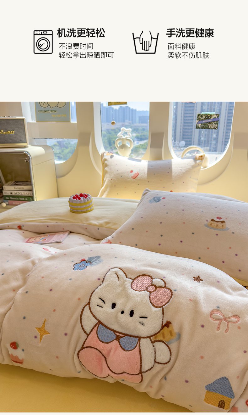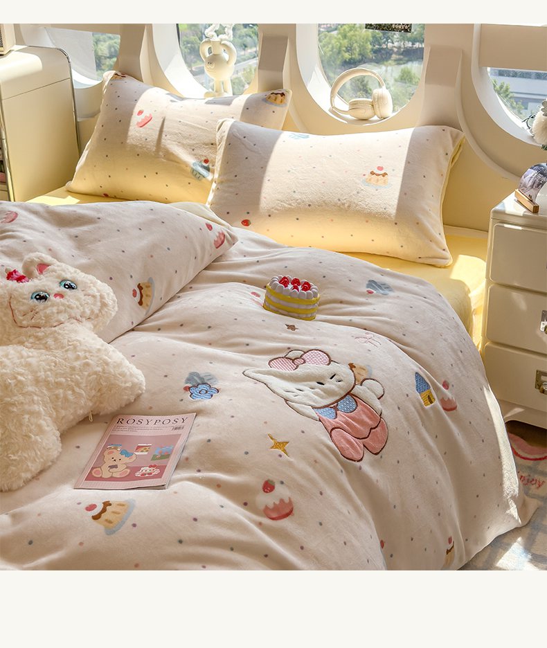 商品名称:摩妮卡 2025新款卡通牛奶绒刺绣四件套系列 甜点世界