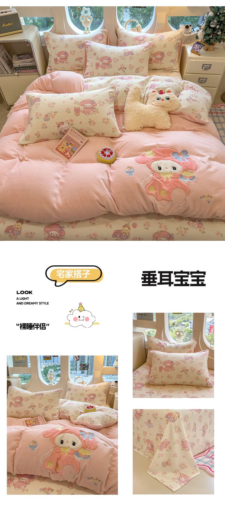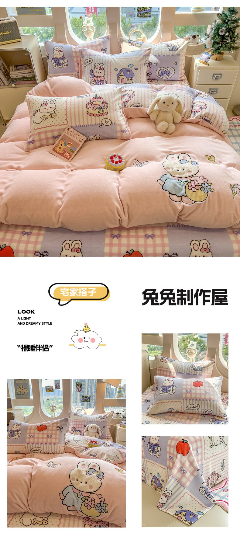 (总)摩妮卡 2025新款小清新加厚260克牛奶绒泡泡绒四件套,甜系兔兔,幽香恋曲,软萌萌小兔,洛丽兔,紫韵美乐蒂,萌兔时光,凯蒂小熊,软萌小猫,暮雅,快乐每一天,花园狗,奶蓝玉桂狗,小兔甜甜酱
