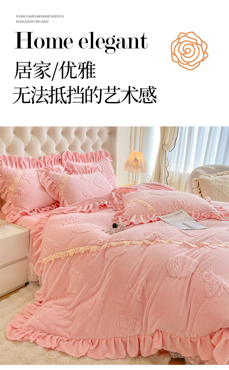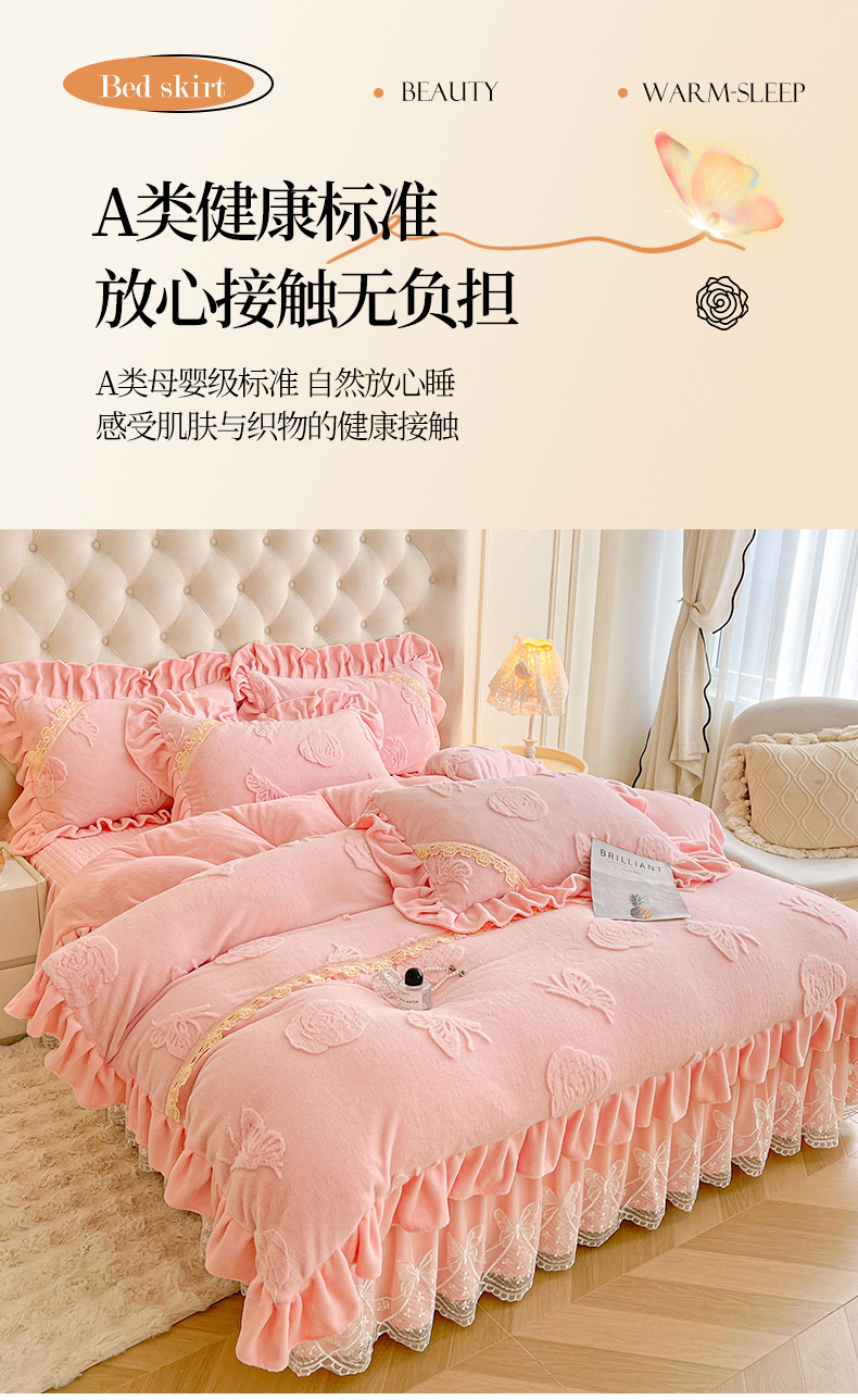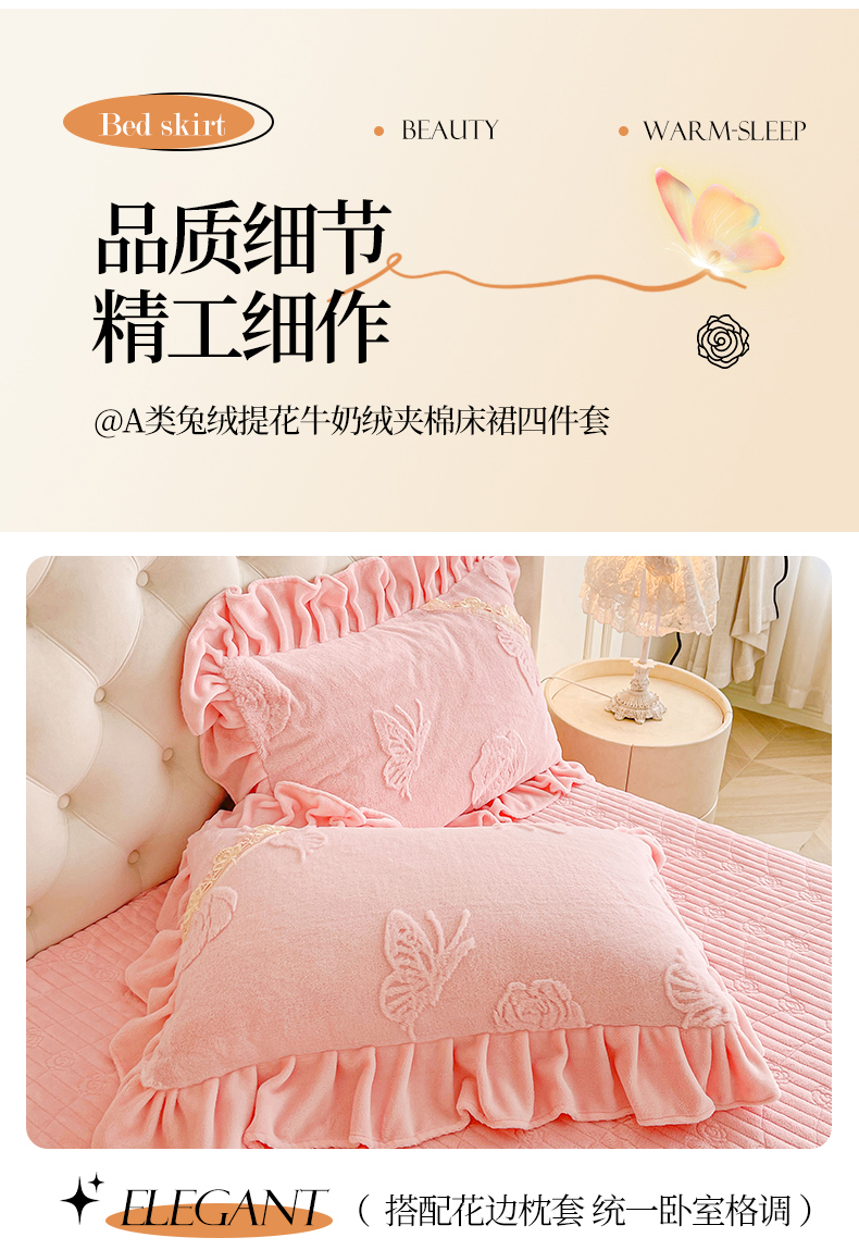 商品名称:宜凡家纺 2025新款A类兔绒提花花边牛奶绒夹棉床裙四件套 蝶恋花-仙女粉