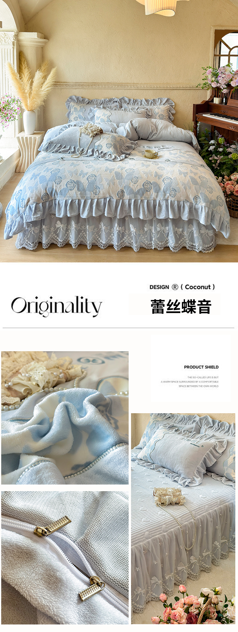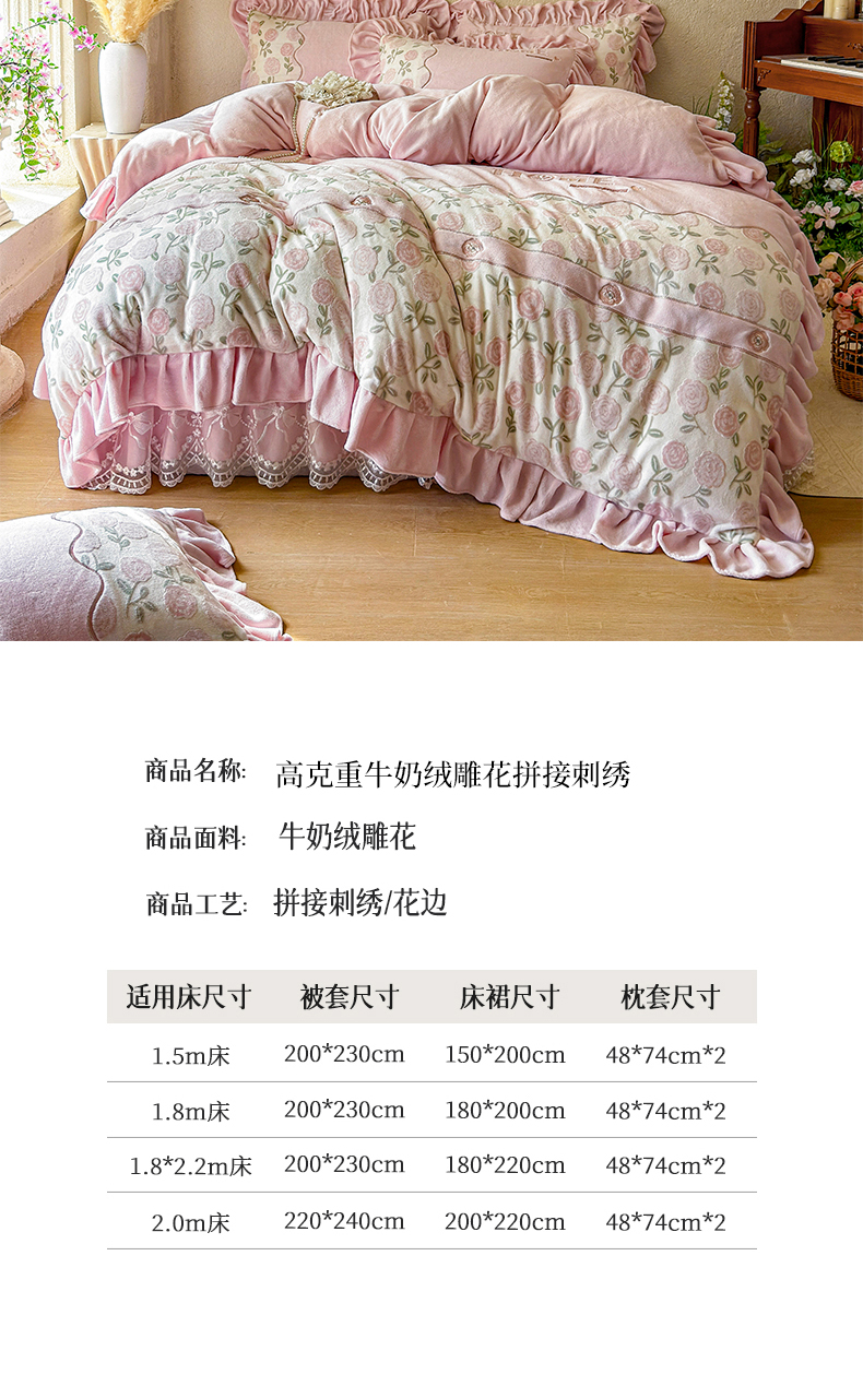 商品名称:宜凡家纺 2025新款牛奶绒雕花拼接刺绣床裙四件套 蝶恋花语