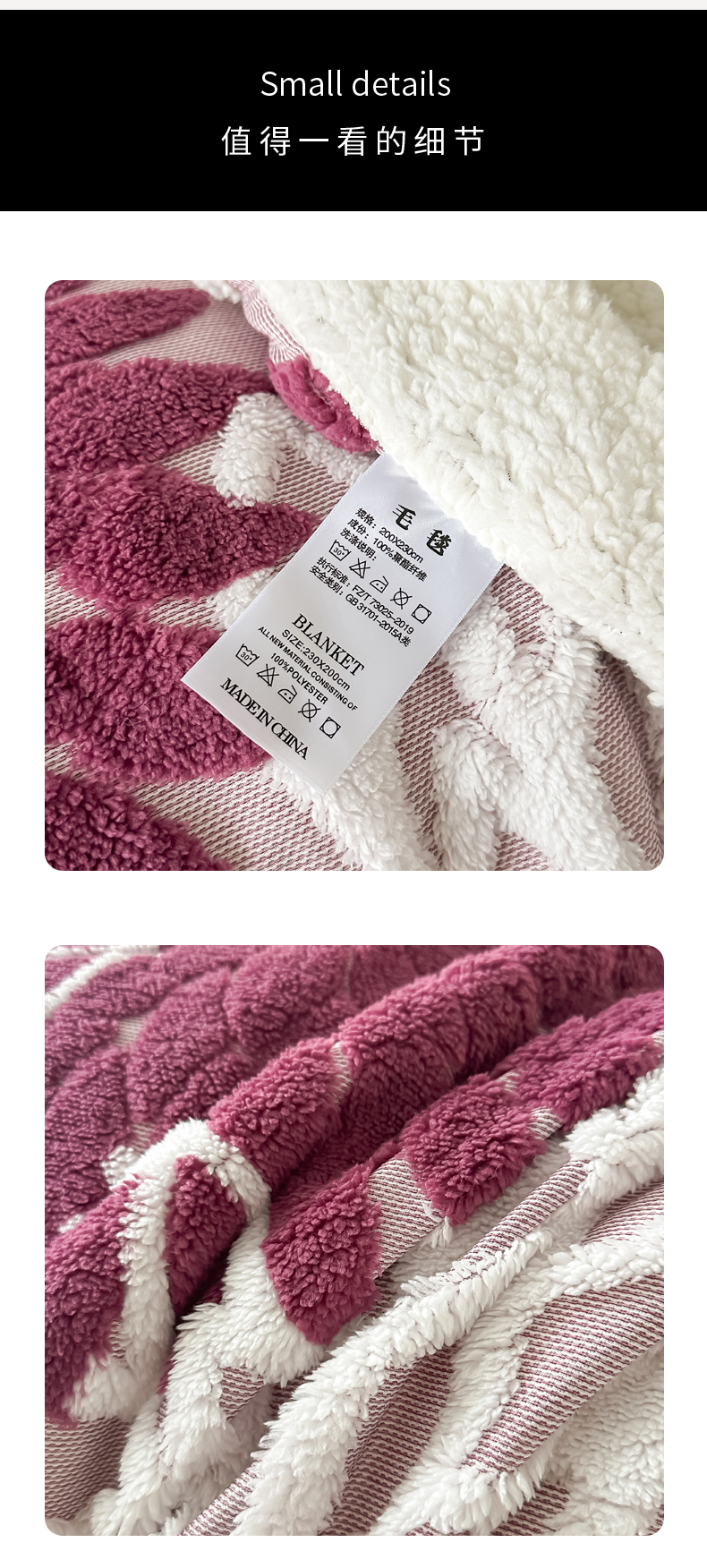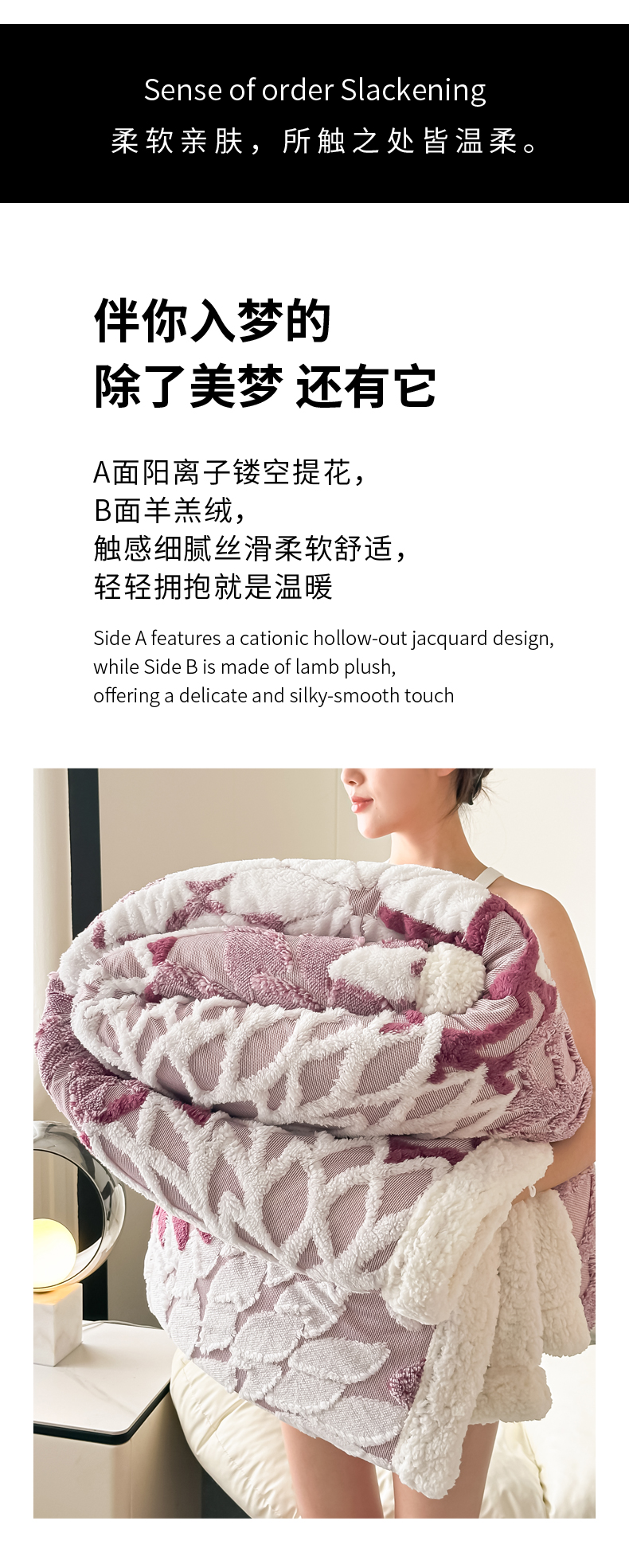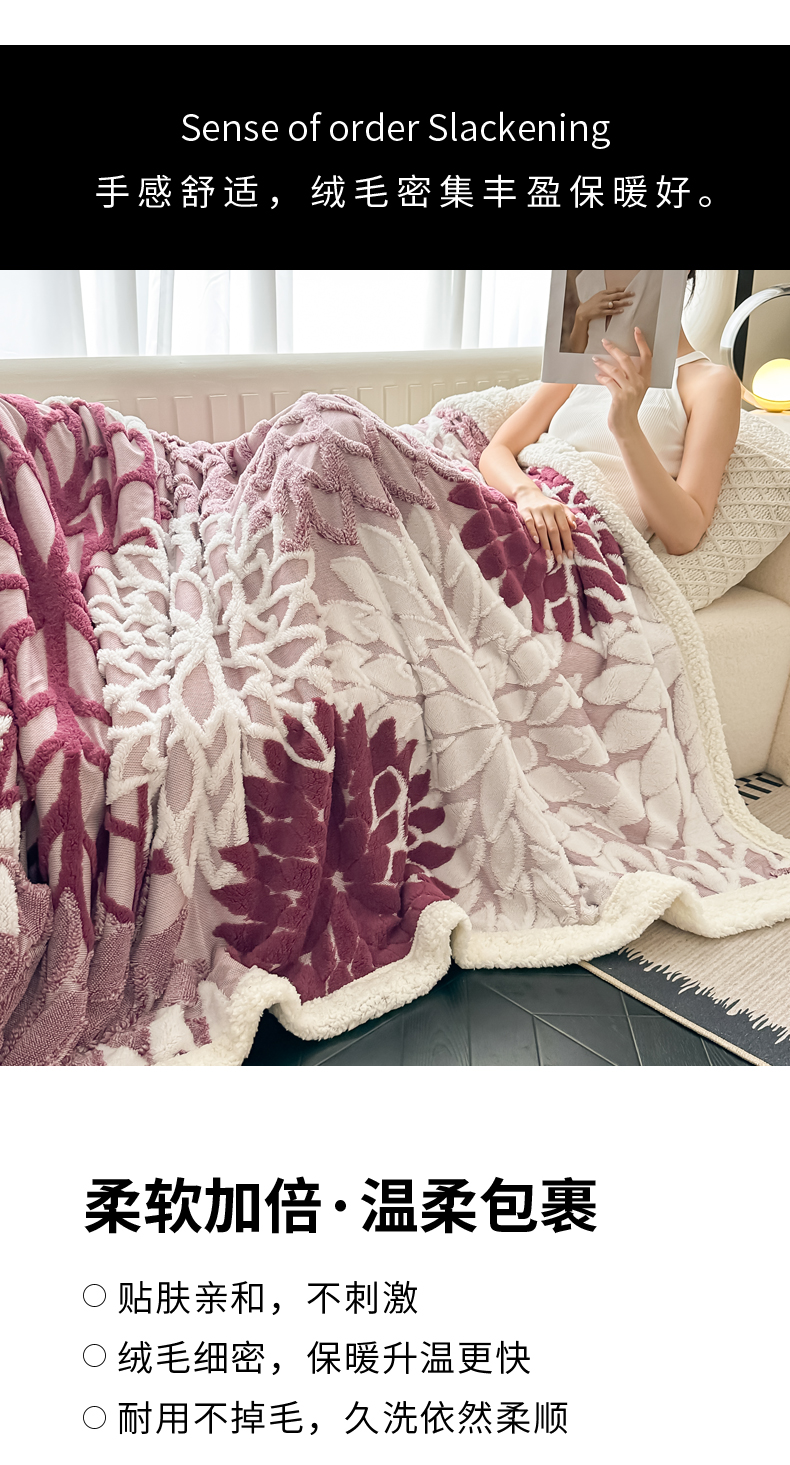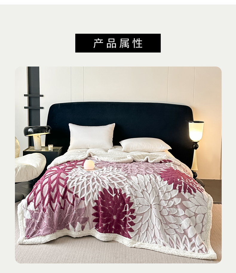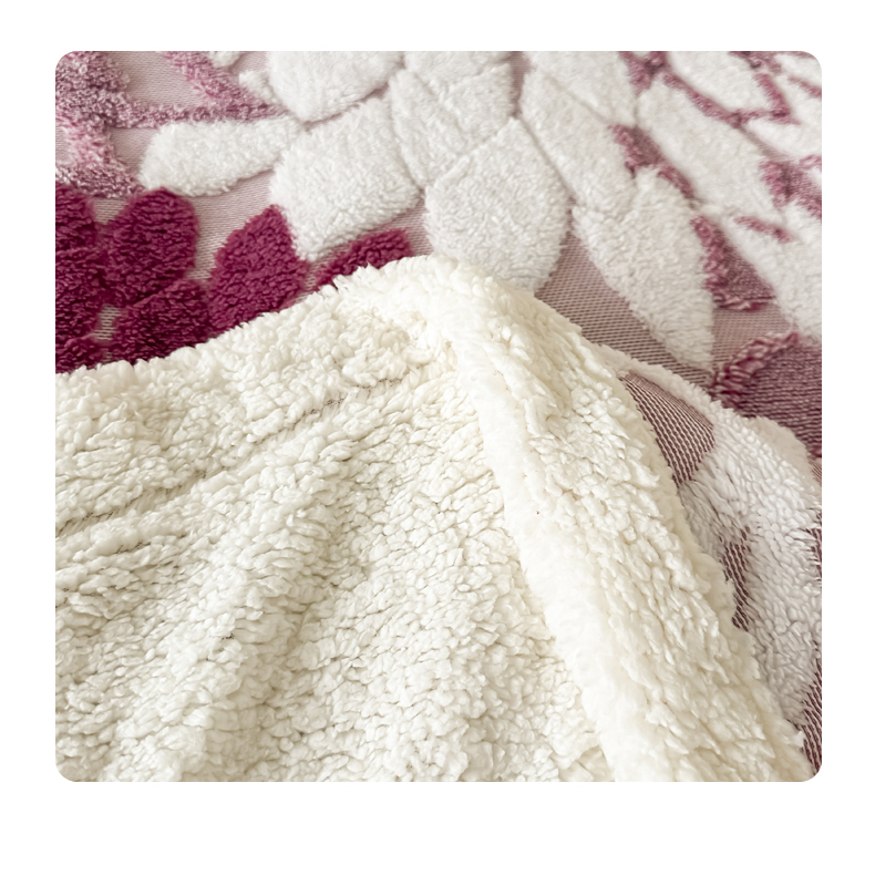 商品名称:丹本家纺 2025新款阳离子提花镂空色织多功能盖毯塔芙绒羊羔绒毛毯毯子 绽放-紫红
