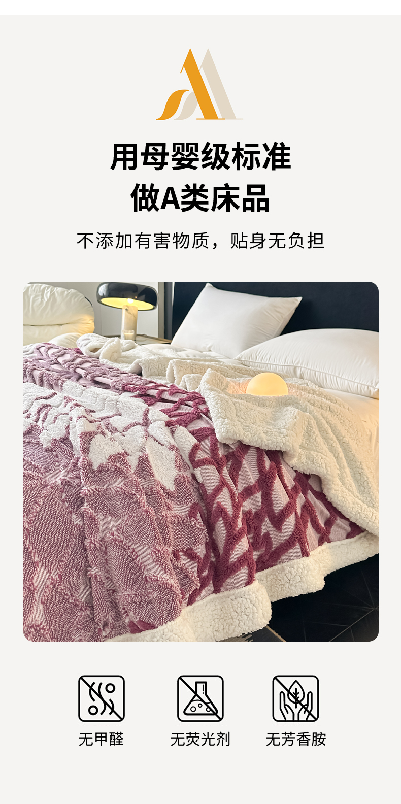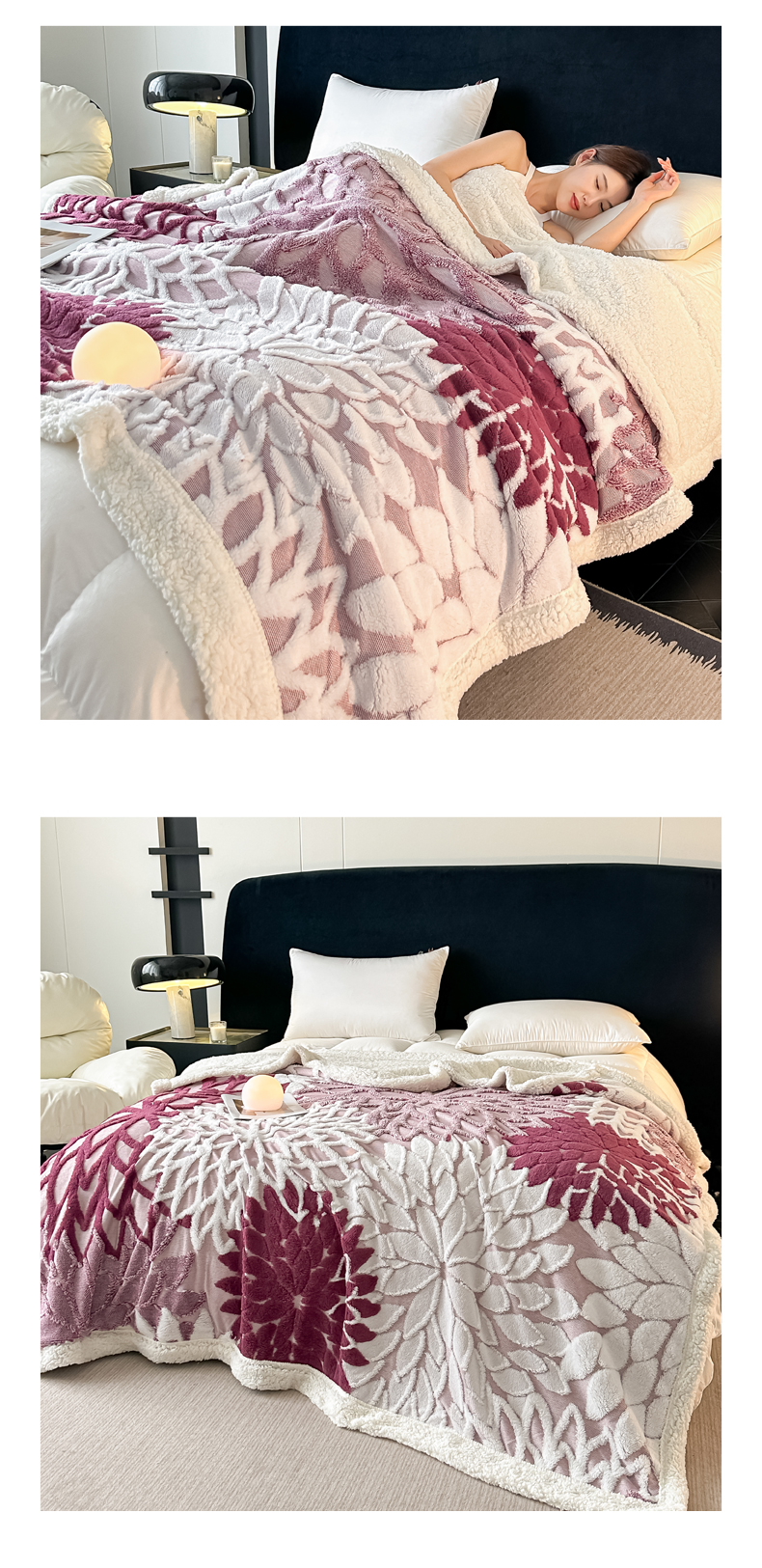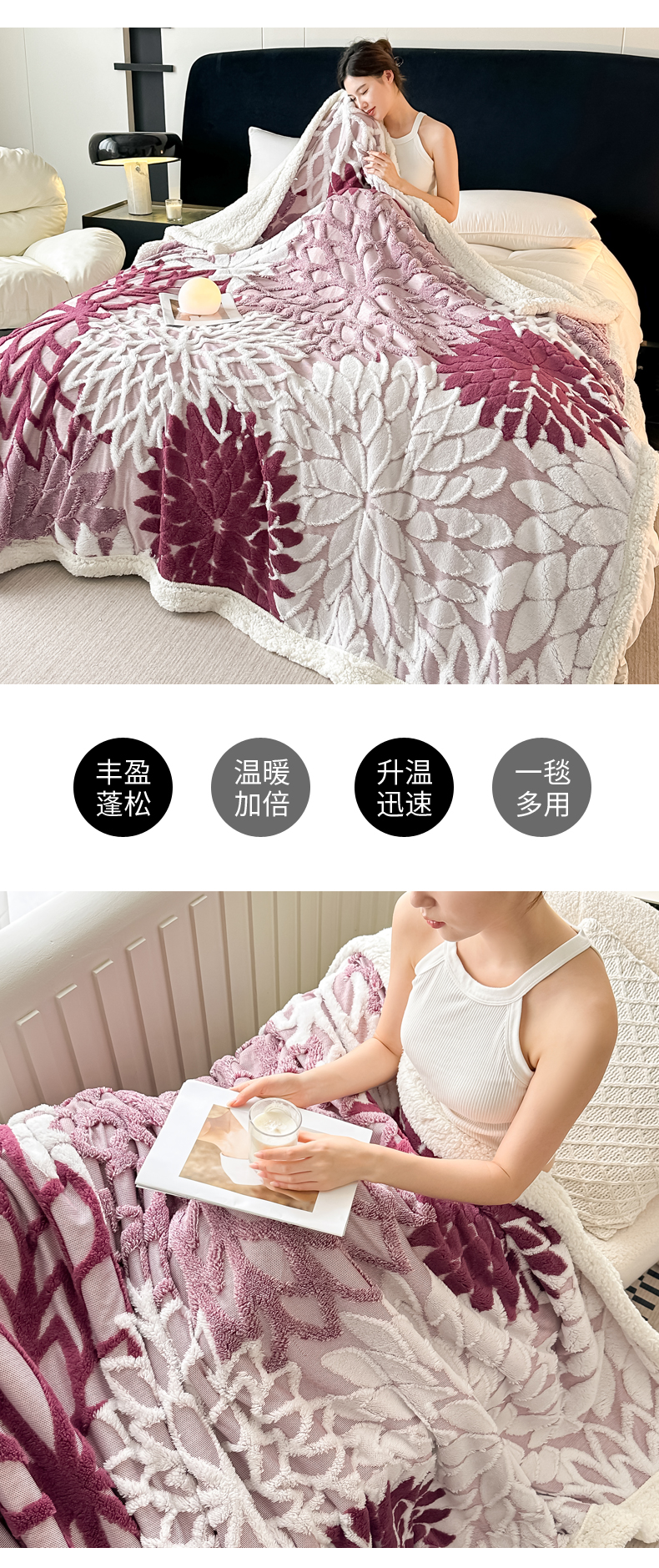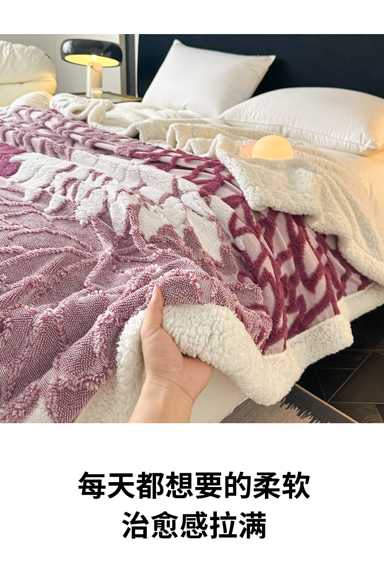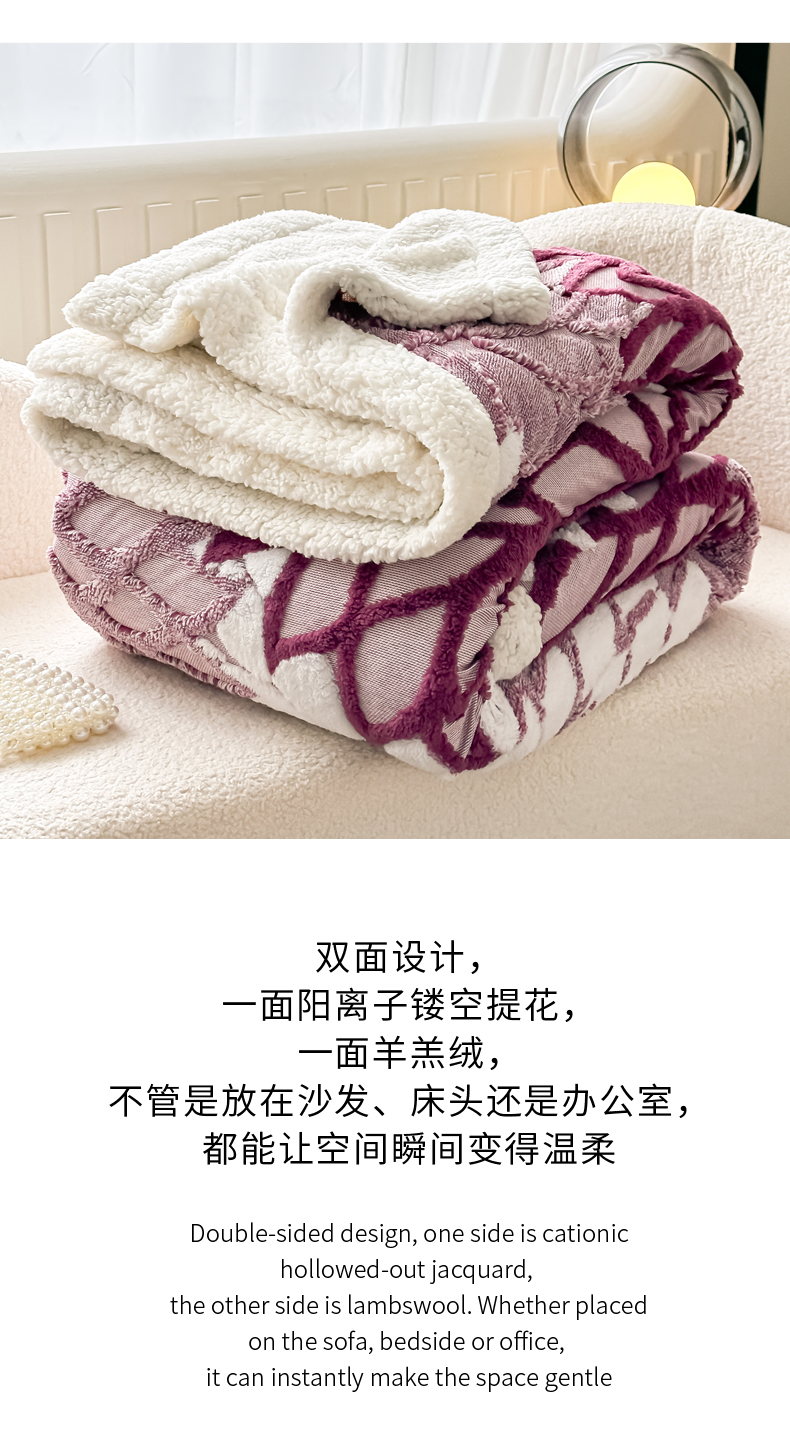 丹本家纺 2025新款阳离子提花镂空色织多功能盖毯塔芙绒羊羔绒毛毯毯子 绽放-紫红