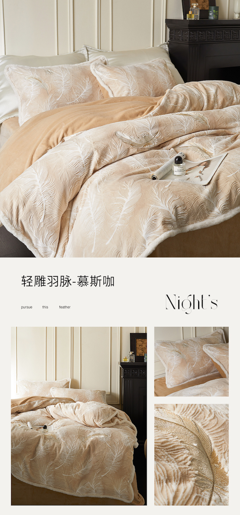 当前位置: 91家纺网 > 商品网购 > 床品套件 > 四件套 > 牛奶绒四件套 > 风向标家纺 2025新款A类立体烂花牛奶绒四件套-羽脉系列(风格一) 轻雕羽脉-慕斯咖