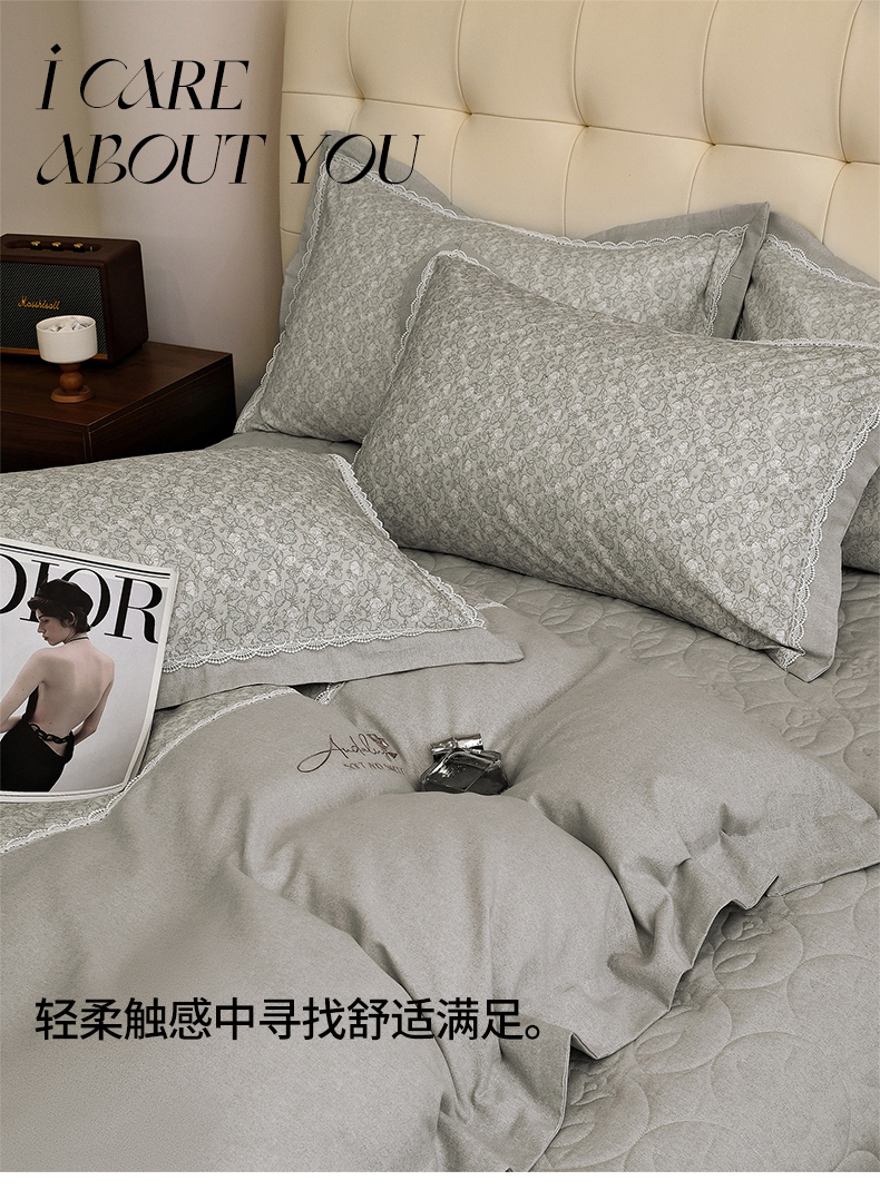 (总)OL家纺 2021居家全棉羊绒保暖亲肤色织蕾丝四件套,海蓝,玫红,活力橙,绅士灰,桃红,熏衣紫,奶茶色,粉玉,薄荷绿,柠檬黄