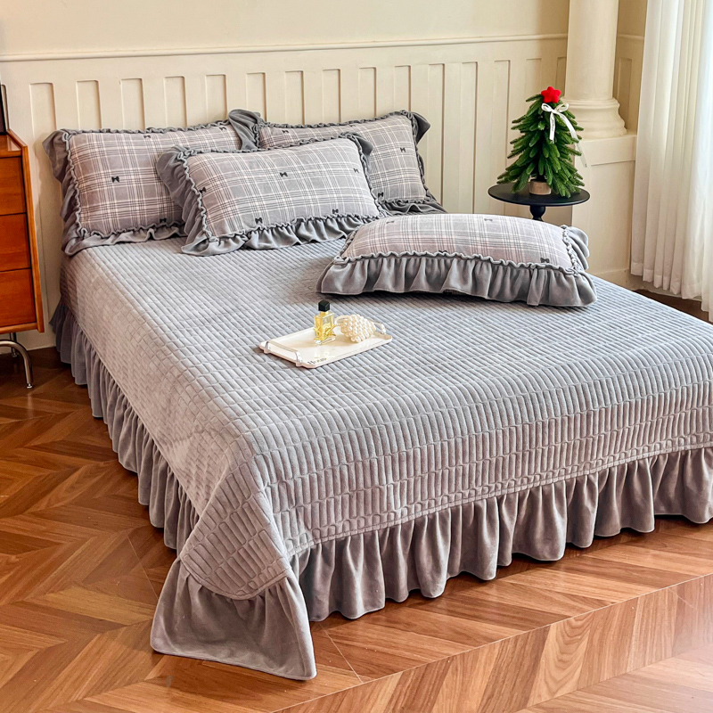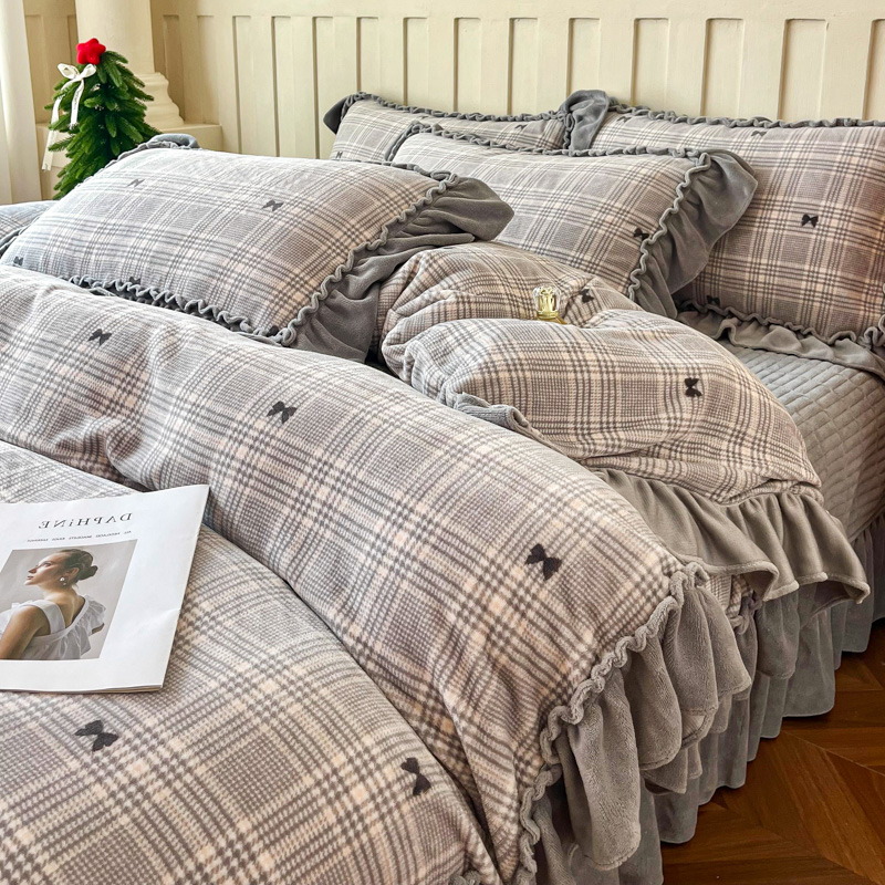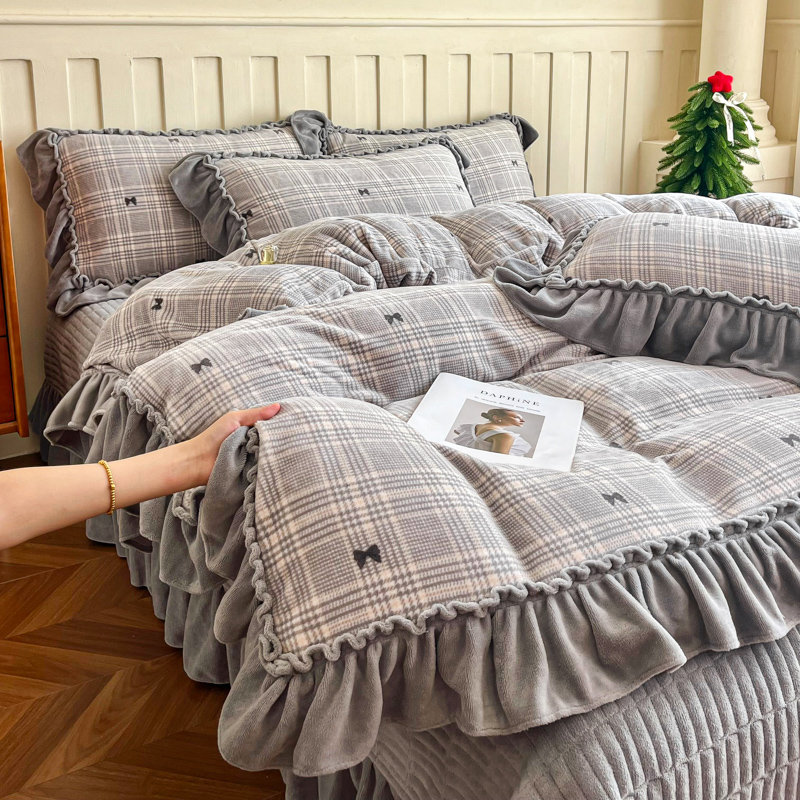 梦可莱家居 2025冬季新款复古风印花牛奶绒大花边床盖四件套 复古风格调灰