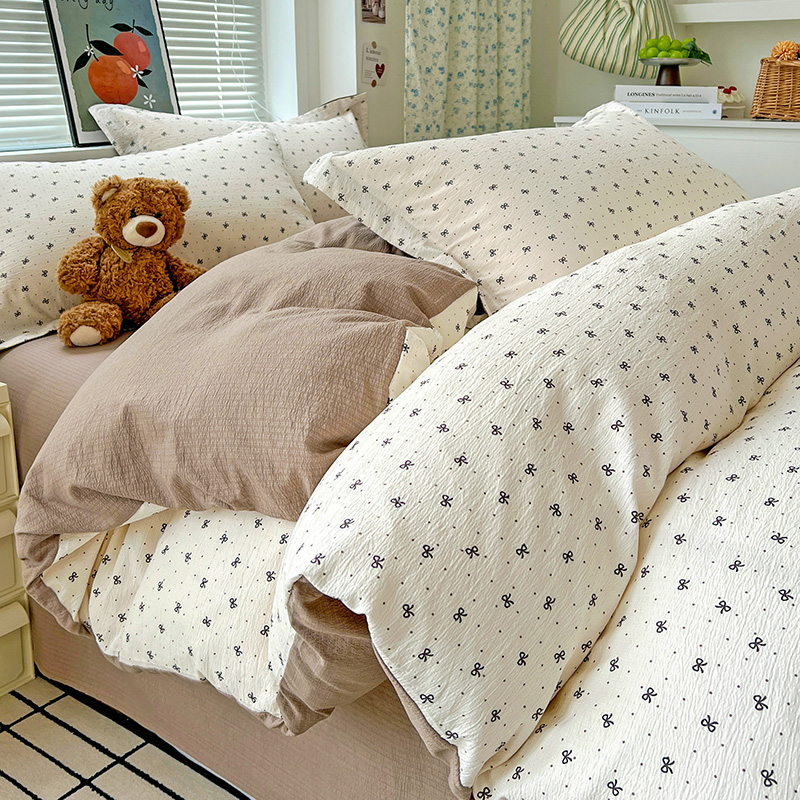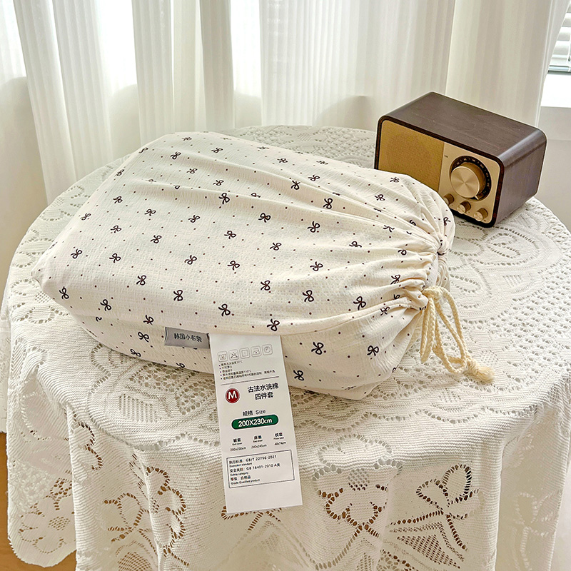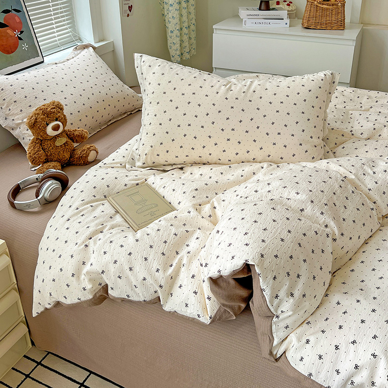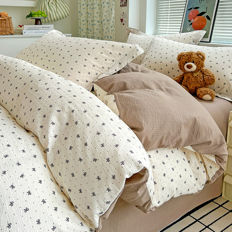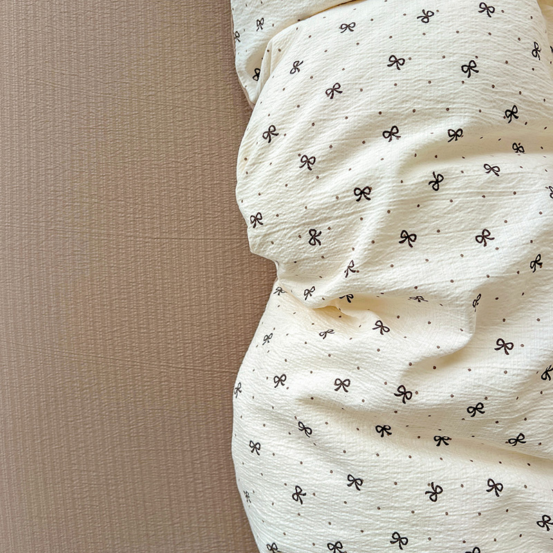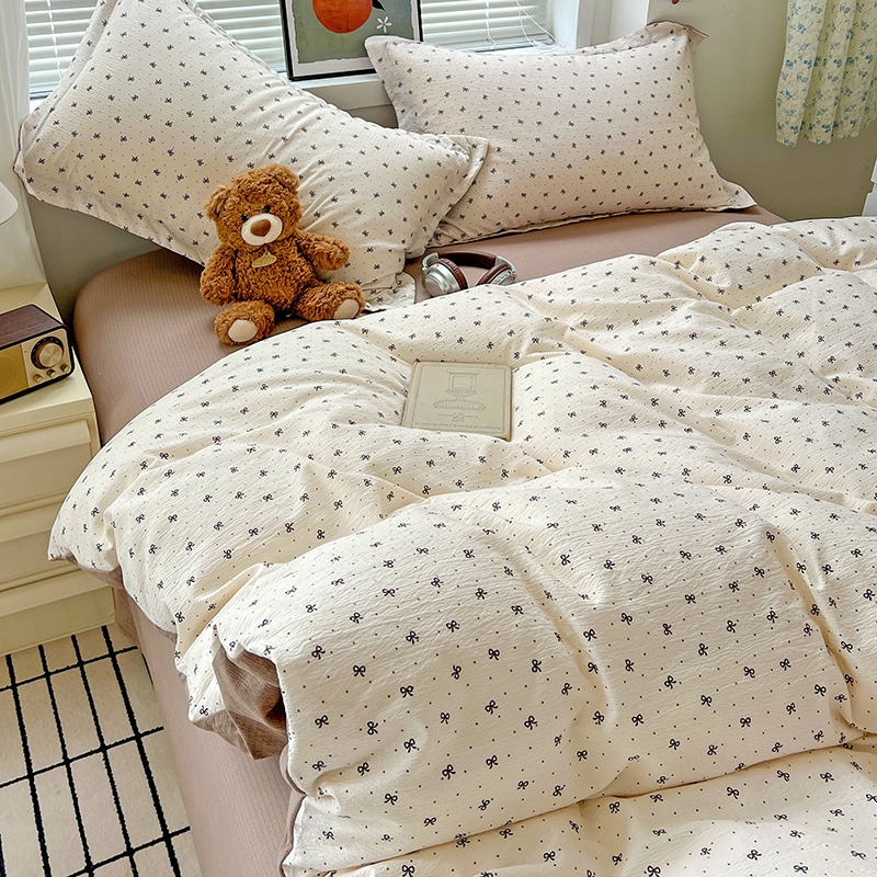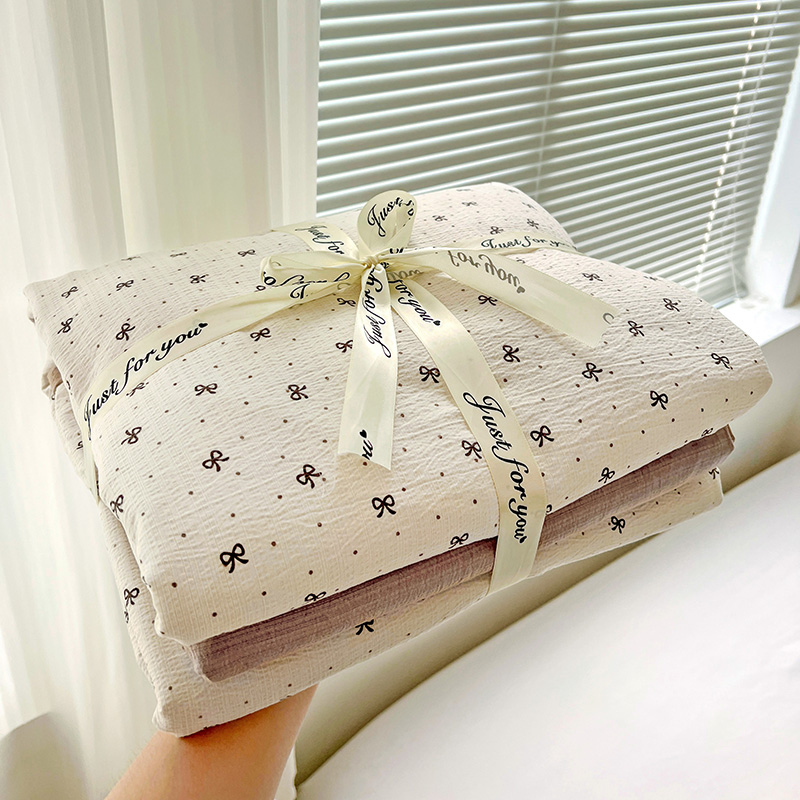 一比一 2025新款古法水洗棉小布袋高克重云柔棉四件套 蝴蝶结点点- 咖