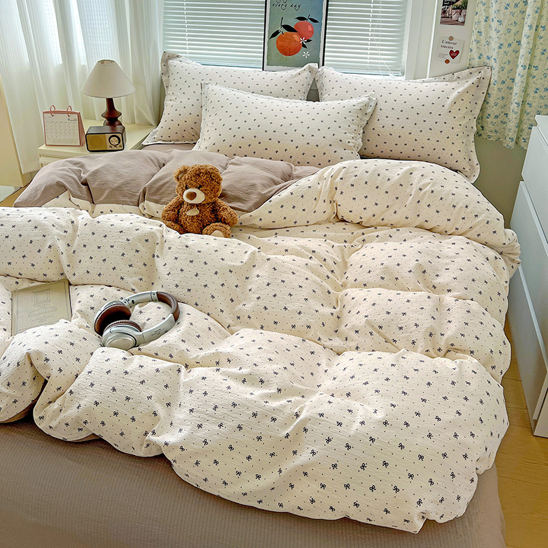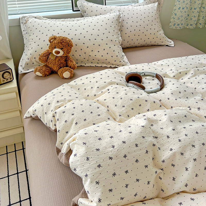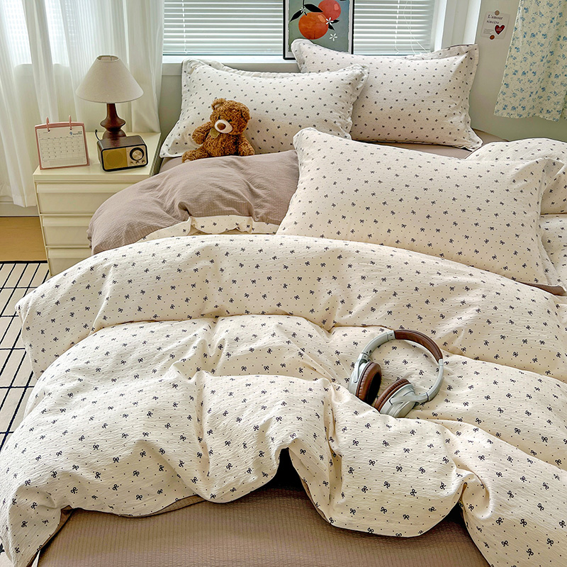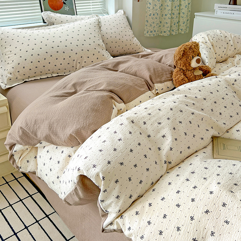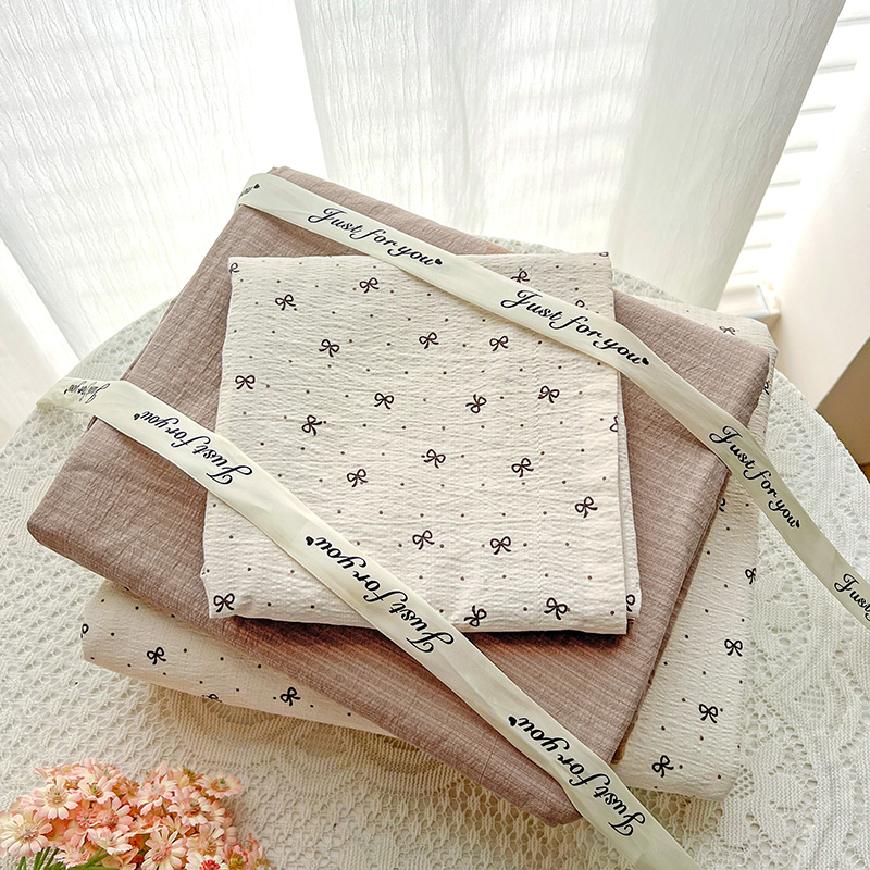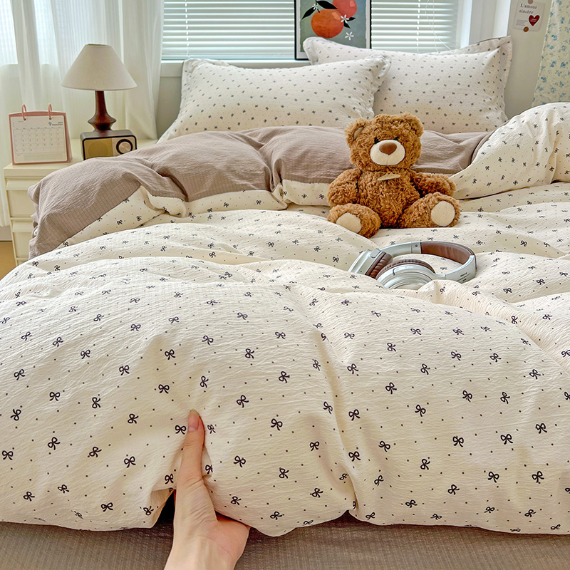 一比一 2025新款古法水洗棉小布袋高克重云柔棉四件套 蝴蝶结点点- 咖