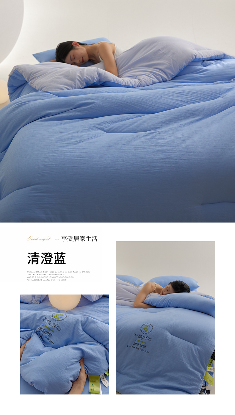 • 91家纺网 家纺一手货源 找家纺 头等舱 2025新款深睡 零压 软糯 净植力抗菌 防螨 防霉 低致敏 秋冬被(模特图) 清澄蓝