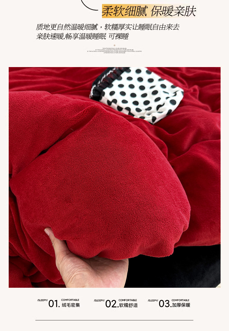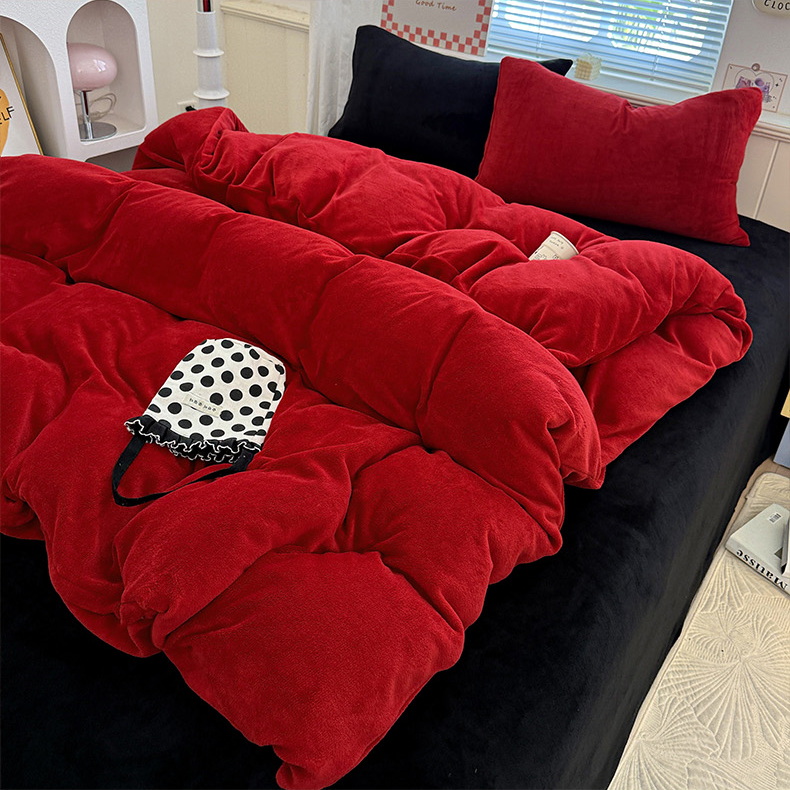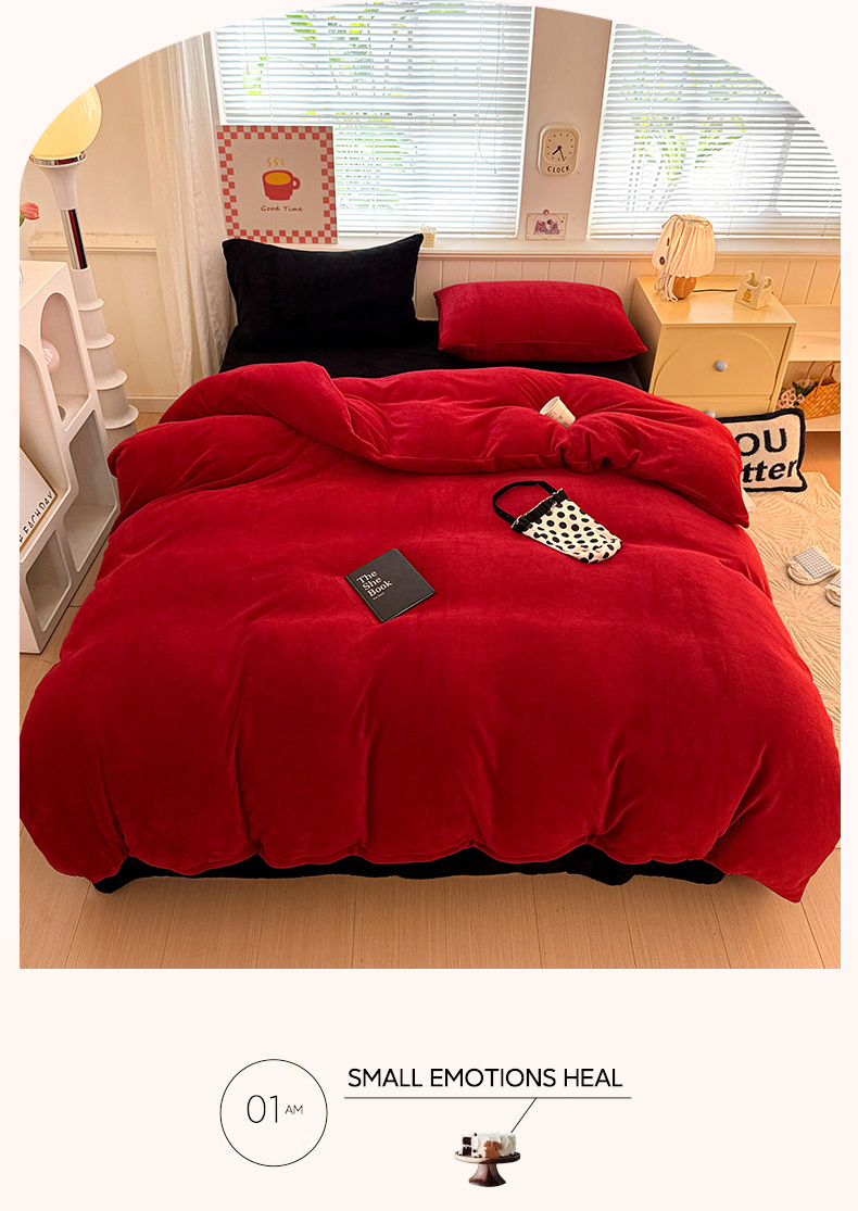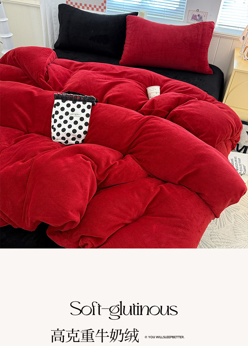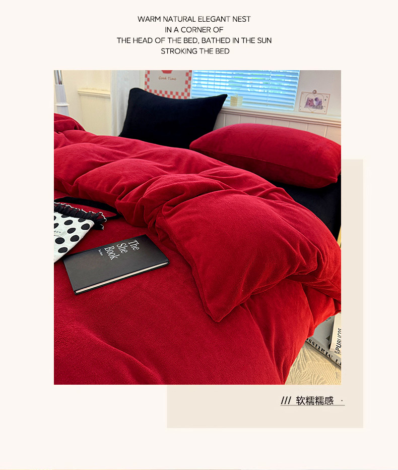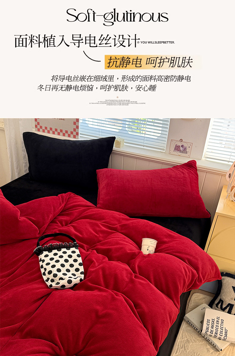 当前位置: 91家纺网 > 商品网购 > 床品套件 > 四件套 > 牛奶绒四件套 > 童颜 2025新款高克重拼色保暖牛奶绒四件套 酒红黑