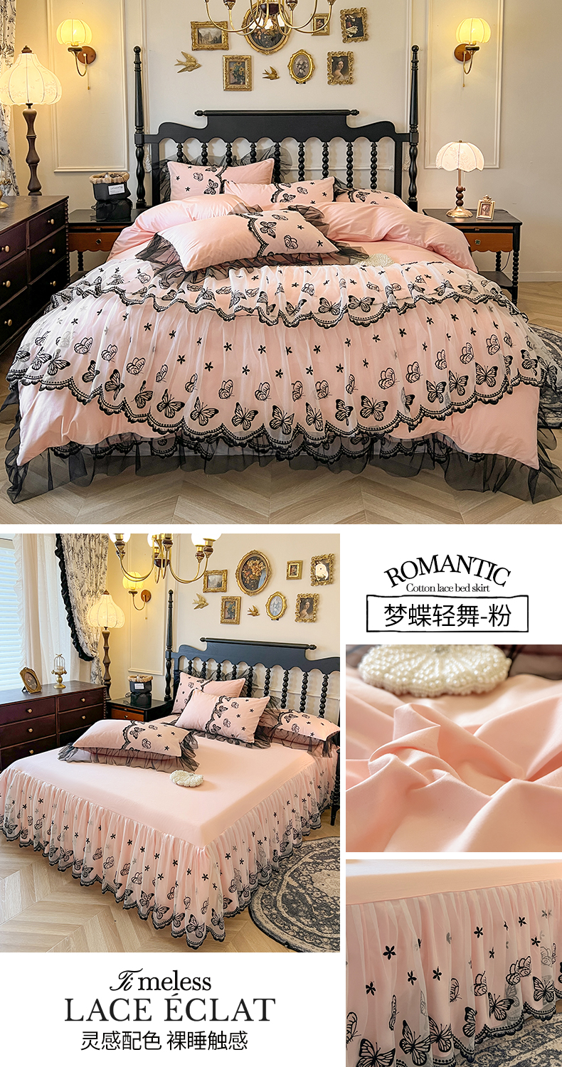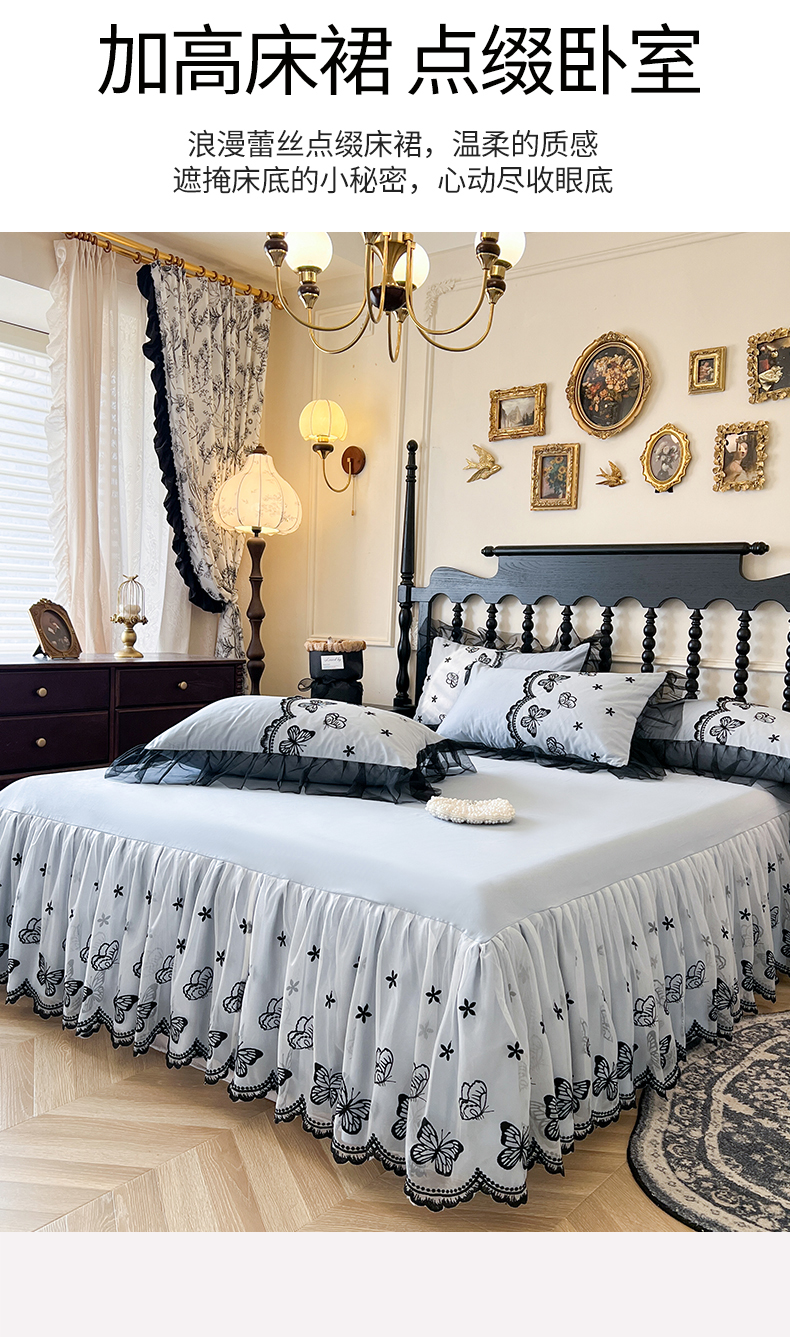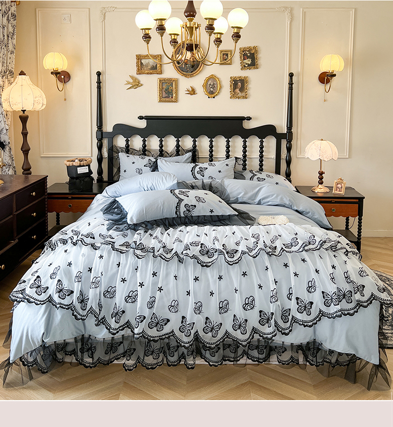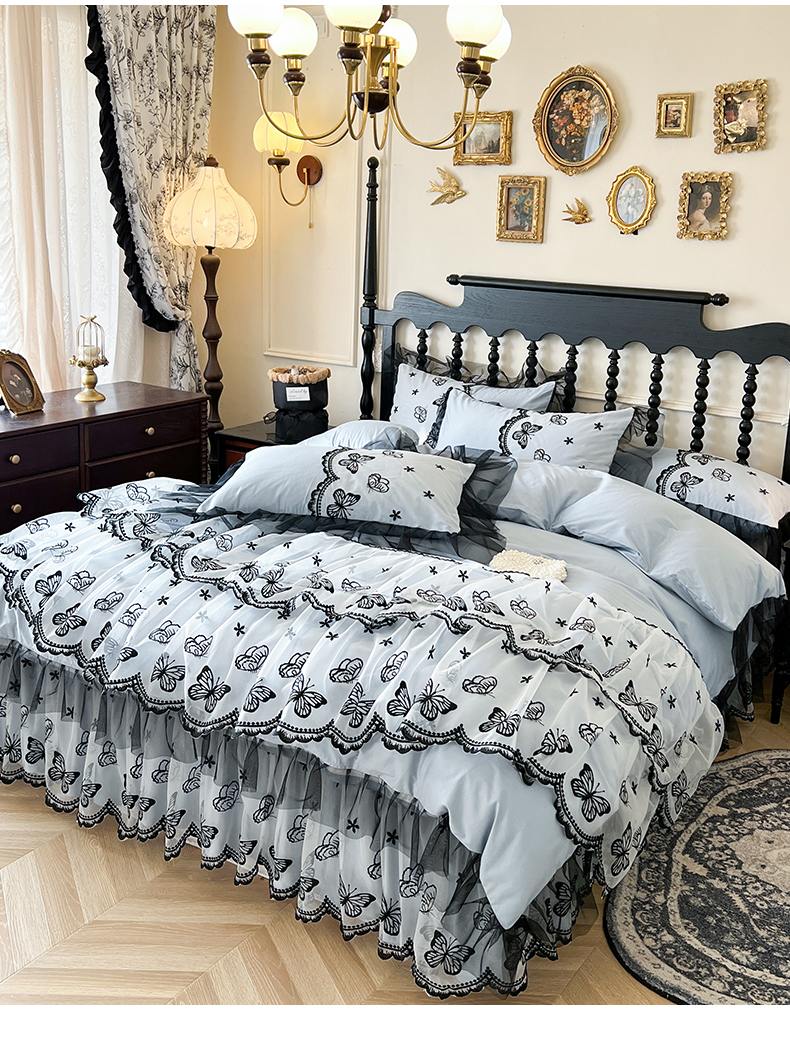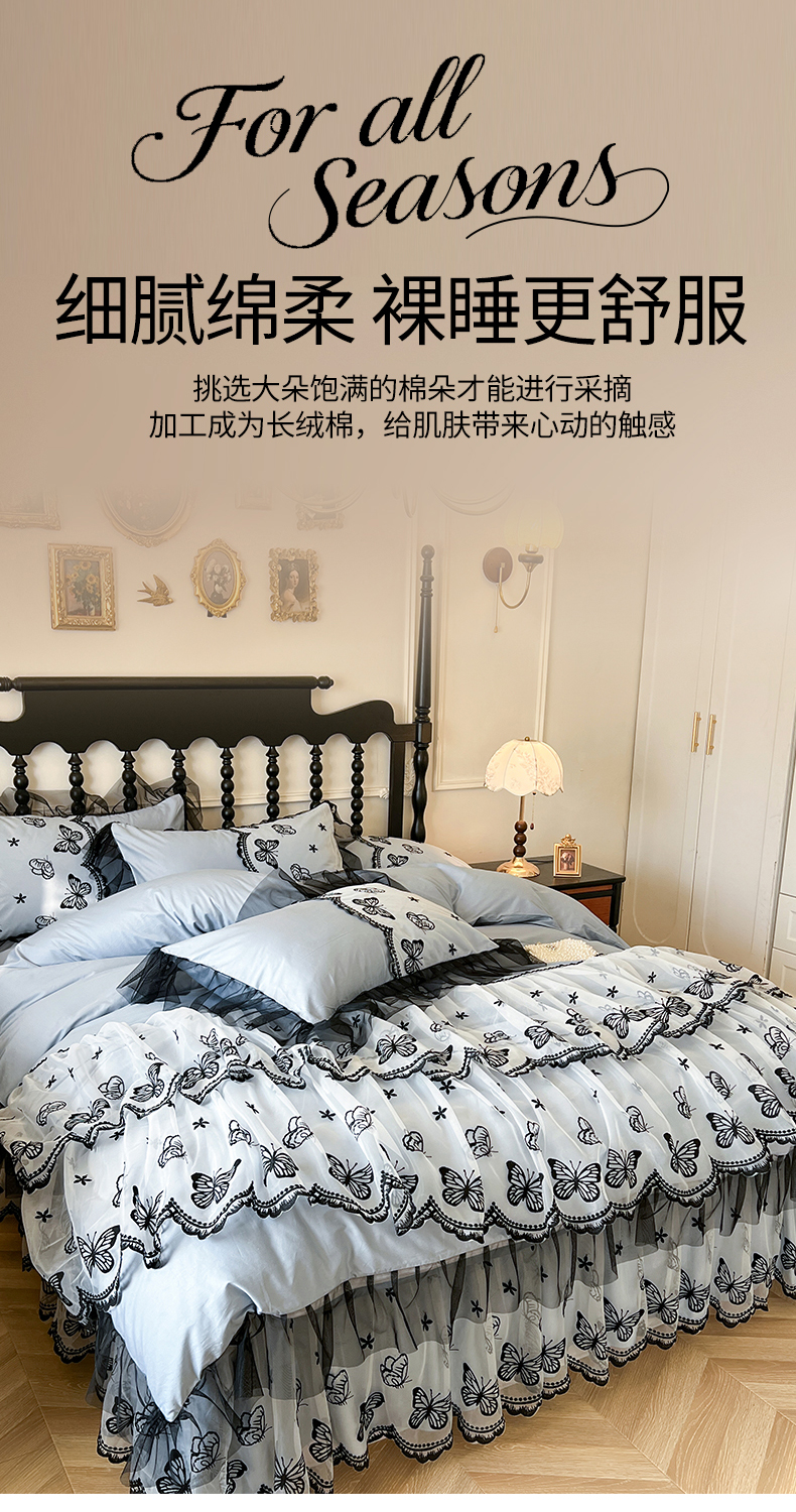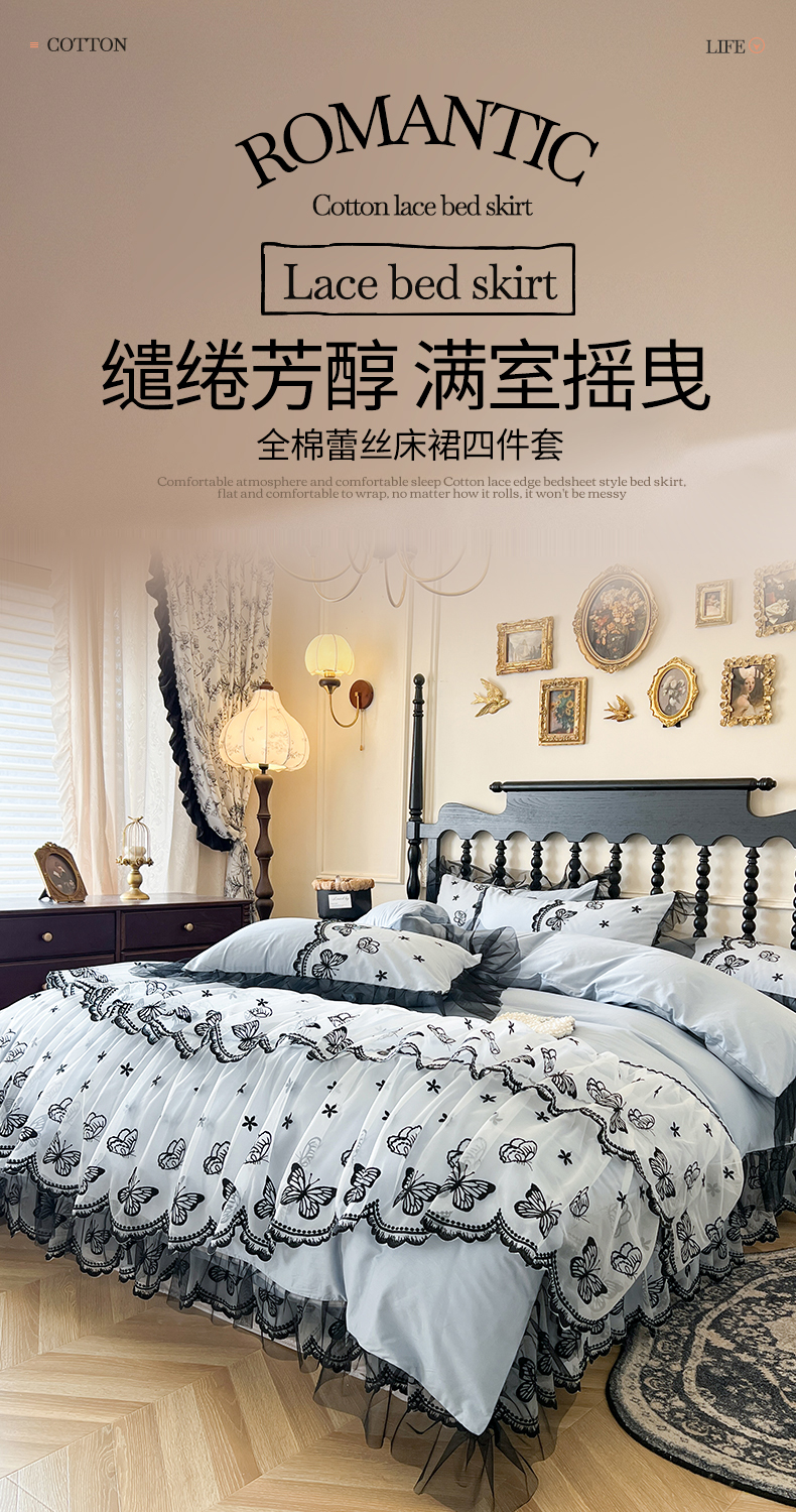 当前位置: 91家纺网 > 商品网购 > 床品套件 > 四件套 > 全棉普通四件套 > 网红馆(ck家纺) 2025新款全棉纯棉蕾丝边床裙款四件套-梦蝶轻舞 梦蝶轻舞-蓝