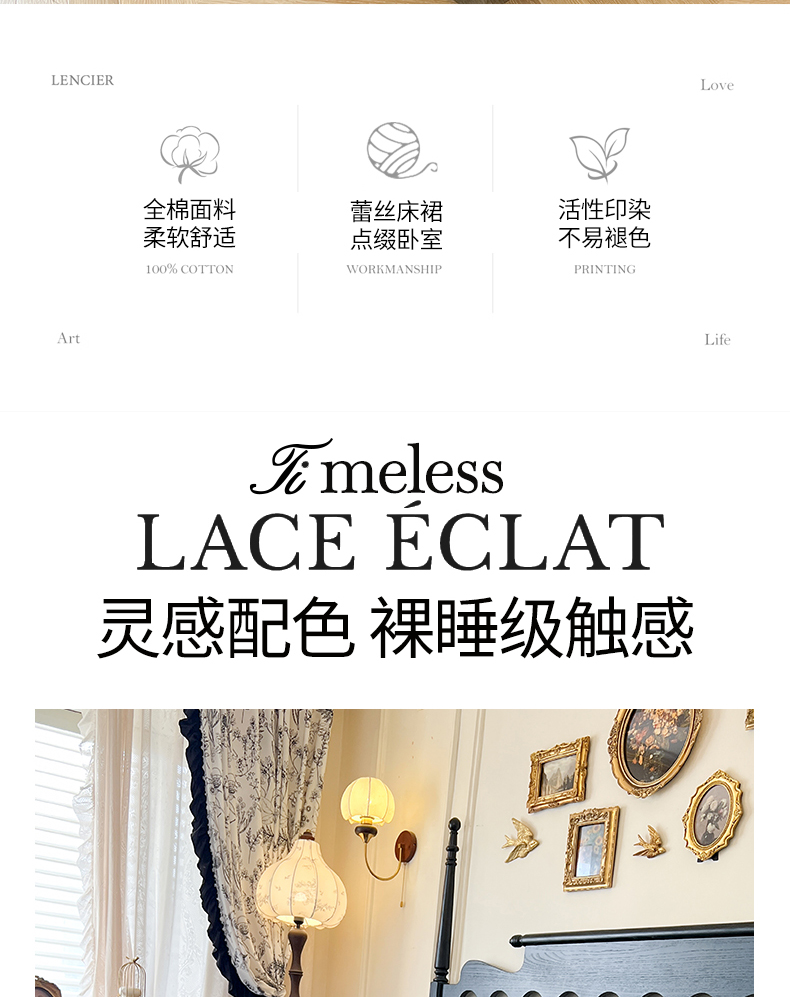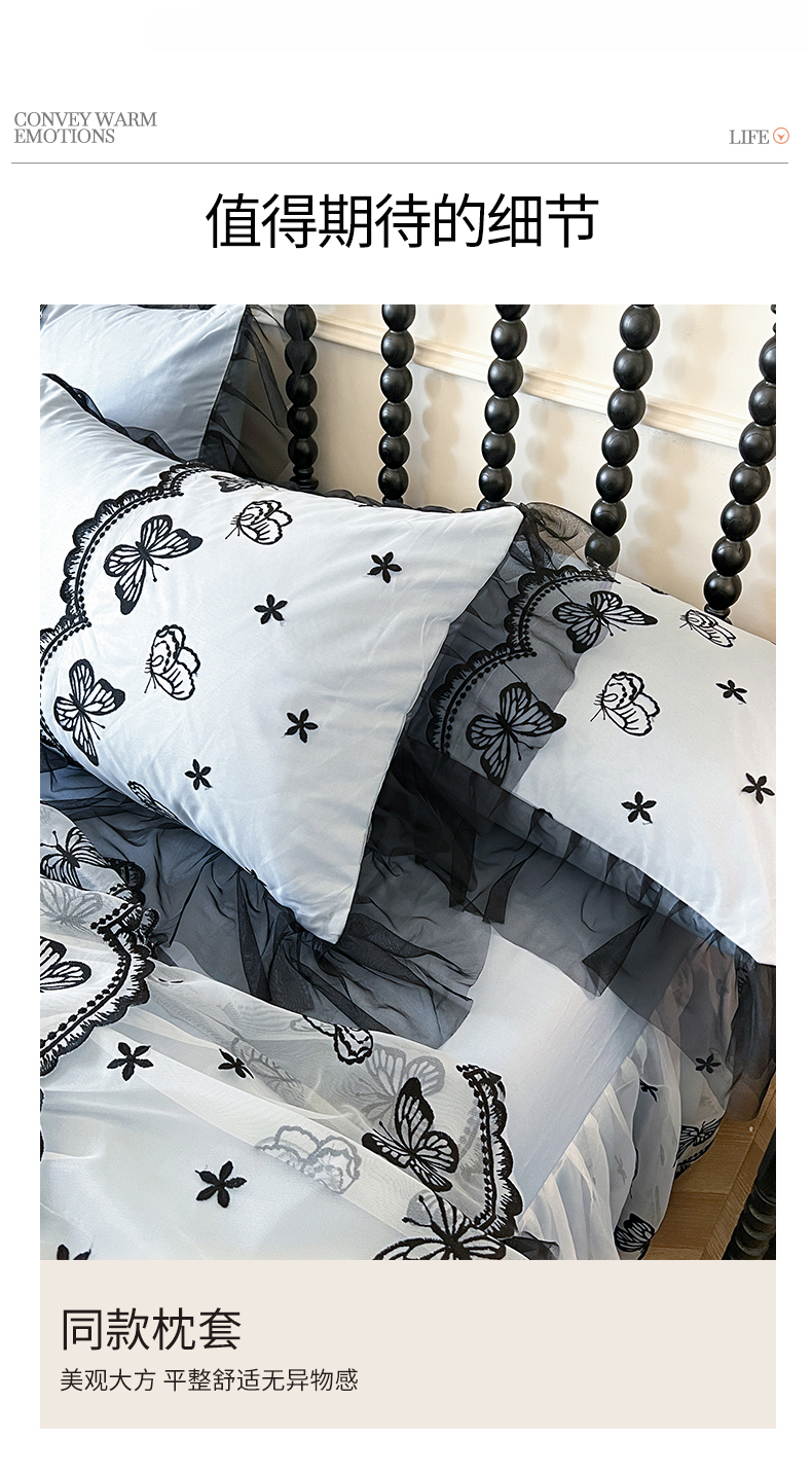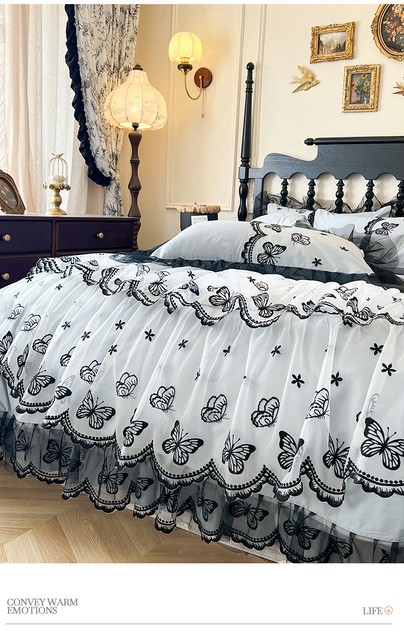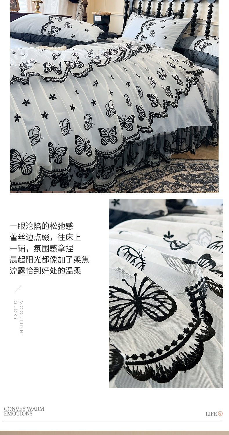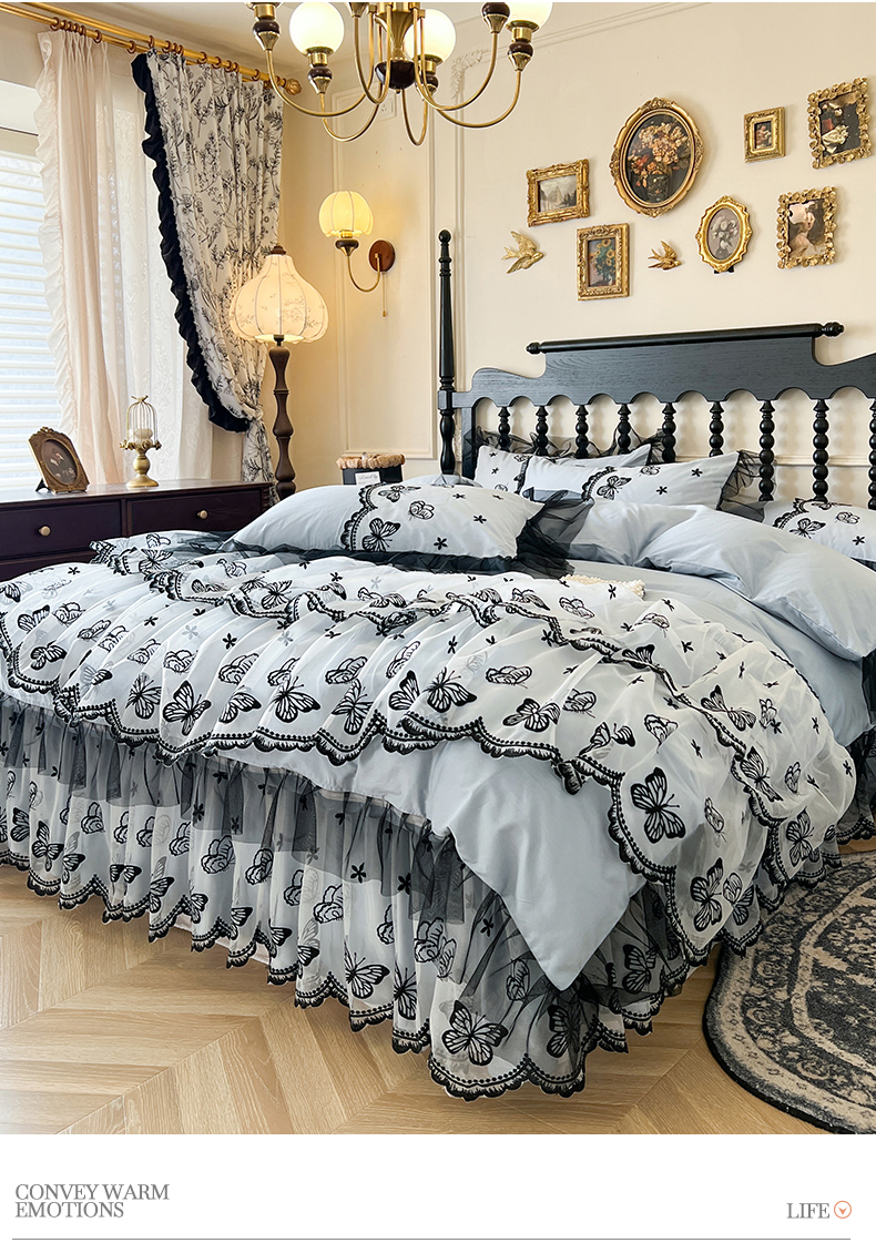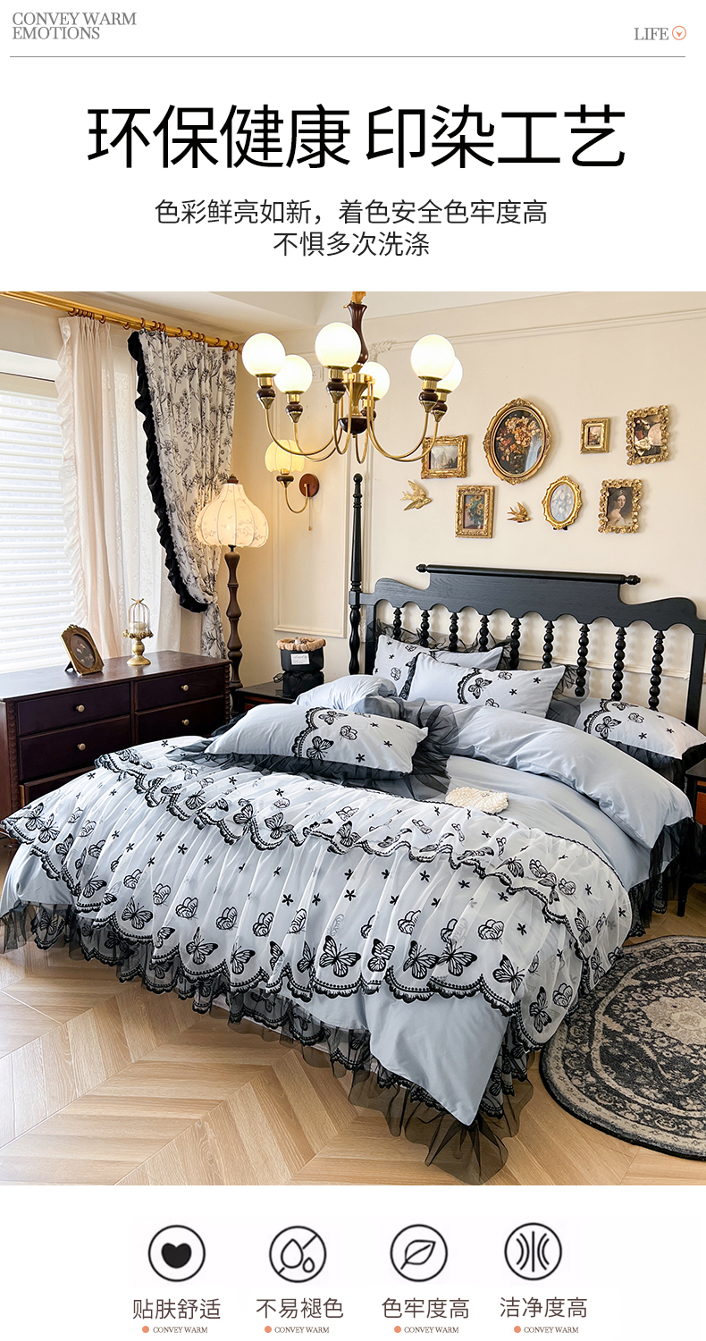 当前位置: 91家纺网 > 商品网购 > 床品套件 > 四件套 > 全棉普通四件套 > 网红馆(ck家纺) 2025新款全棉纯棉蕾丝边床裙款四件套-梦蝶轻舞 梦蝶轻舞-蓝