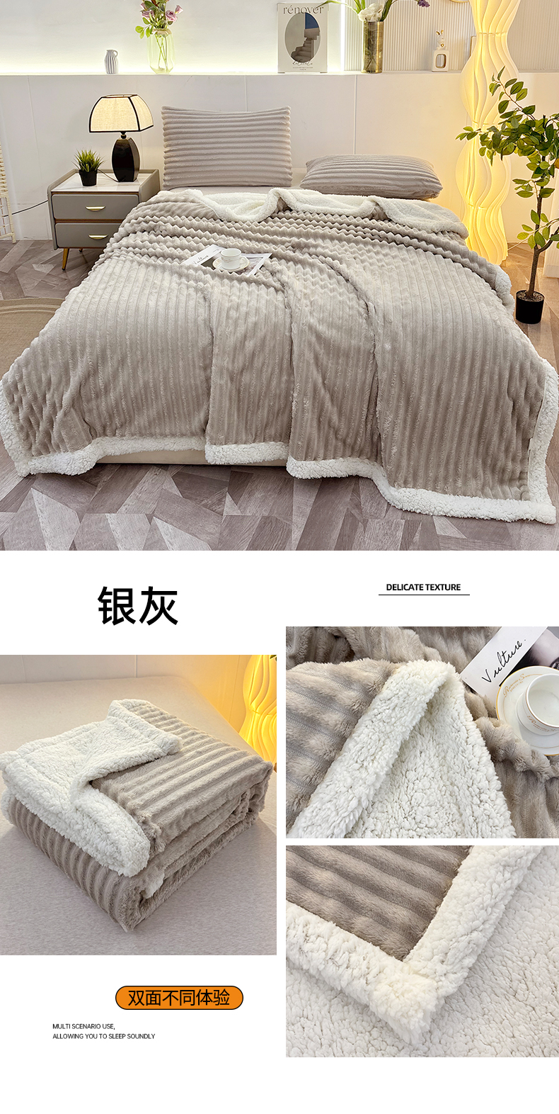 商品名称:枋梢家纺 2025新款仿兔毛绒大抽条羊羔绒毛毯反包双层条纹羊羔绒法兰绒毛毯跨境外贸 银灰