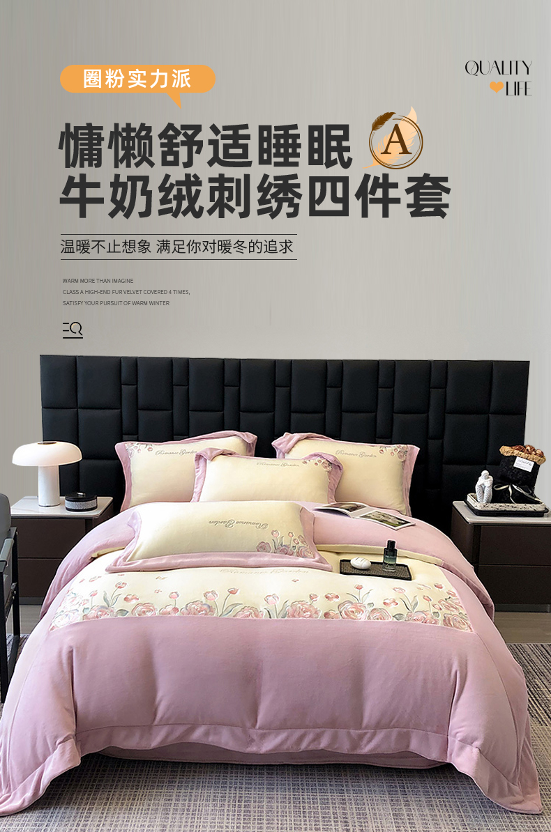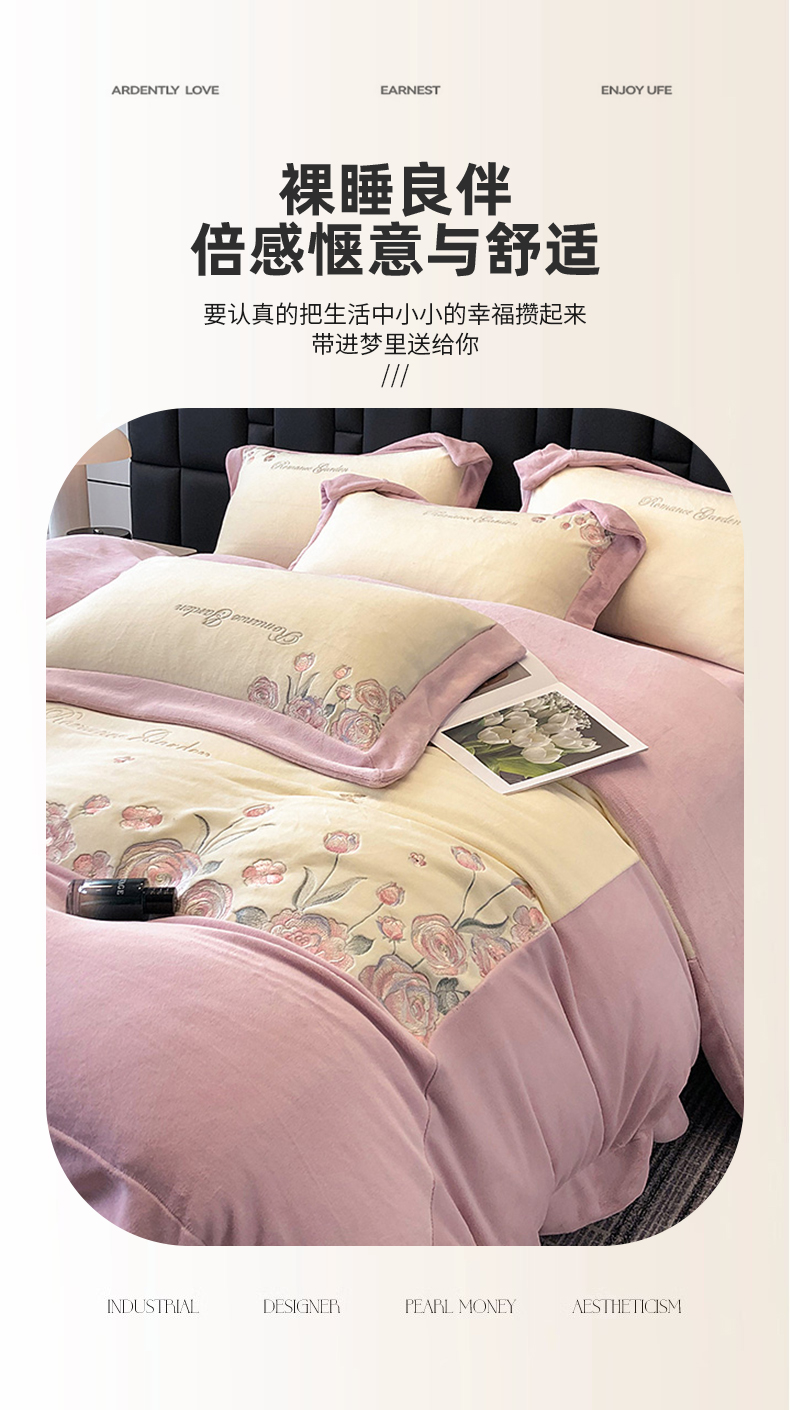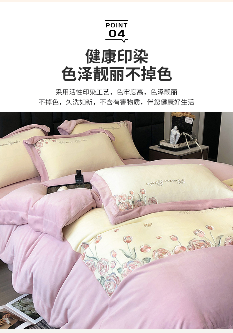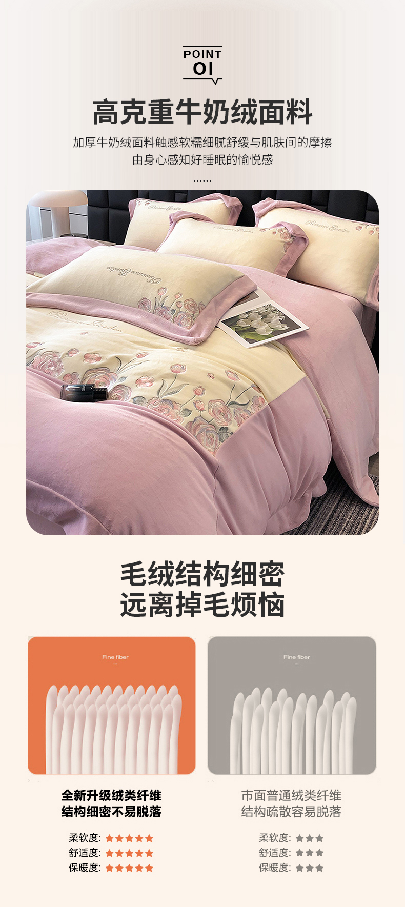 商品名称:家居1号家纺 2025新款230克A类全消光牛奶绒四件套-花海 花海-粉豆沙