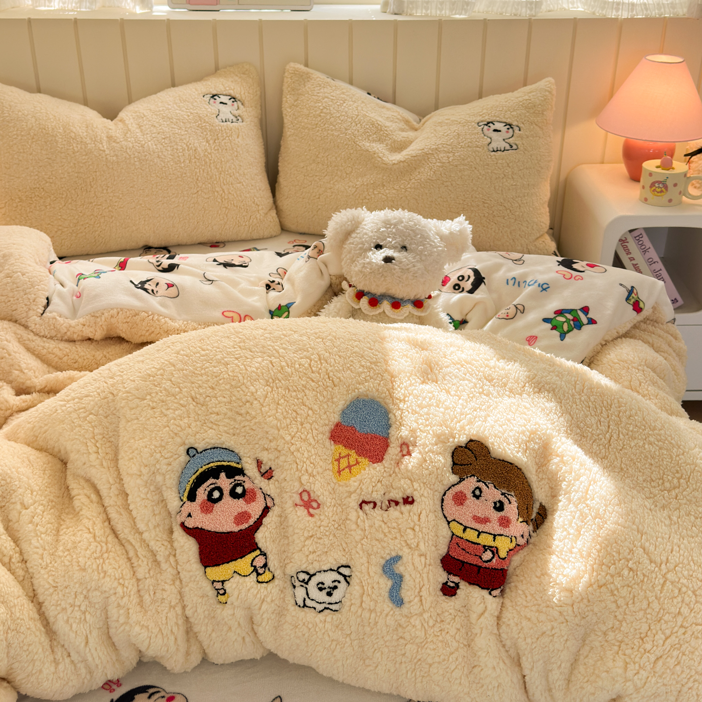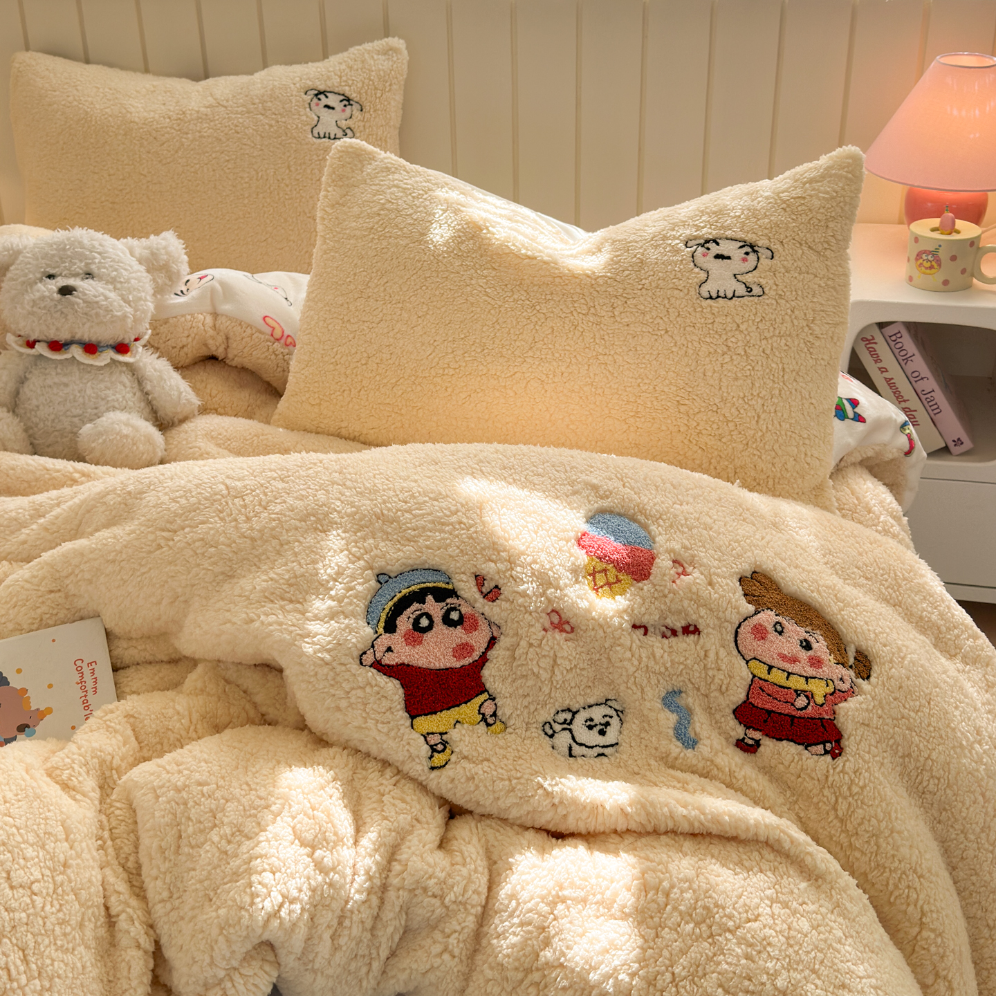 (总)乐童家纺 2025新款高克重牛奶绒床盖款毛巾绣四件套,吹泡泡黄色,吹泡泡蓝色,过生日的海宝和派派,晚安小新,小新大白