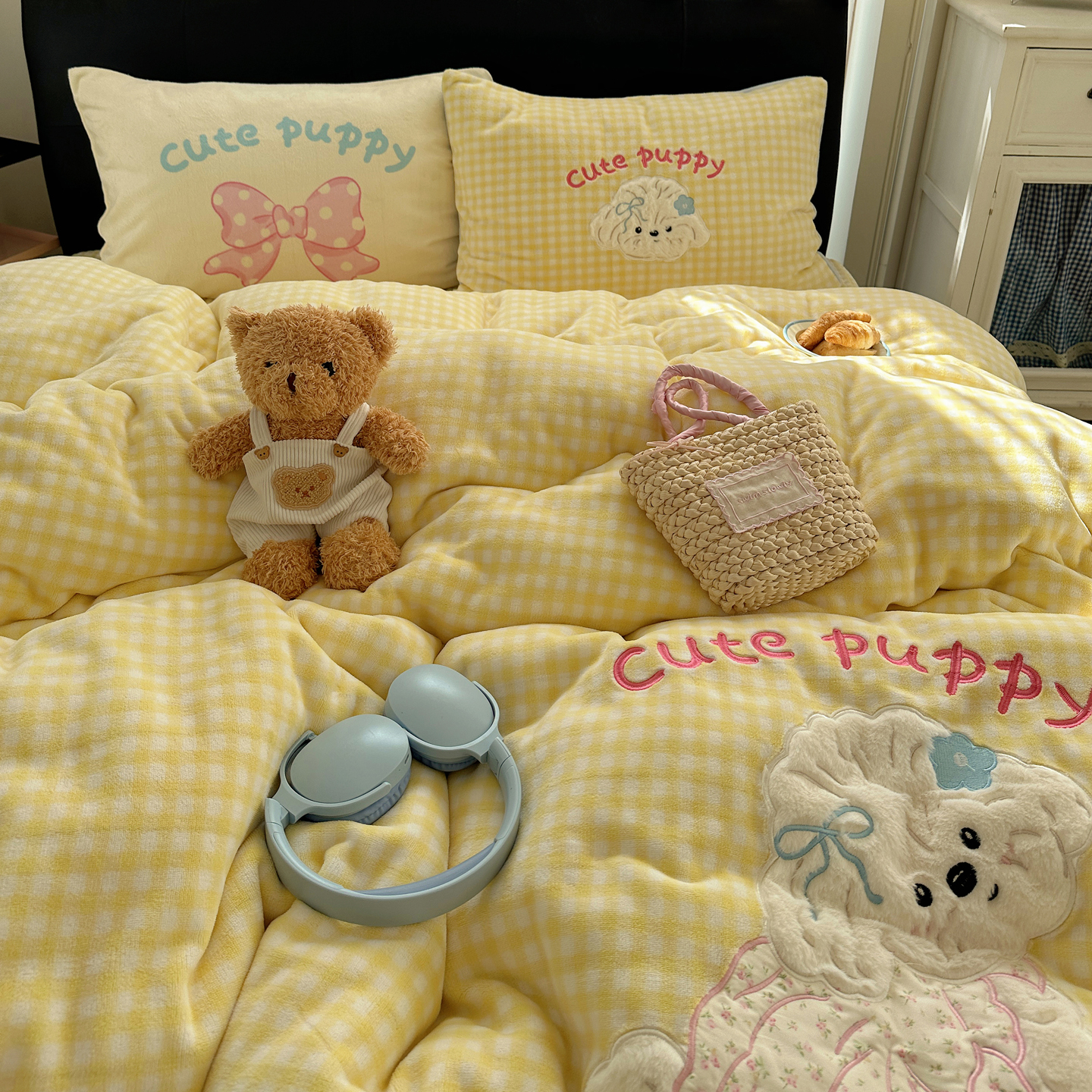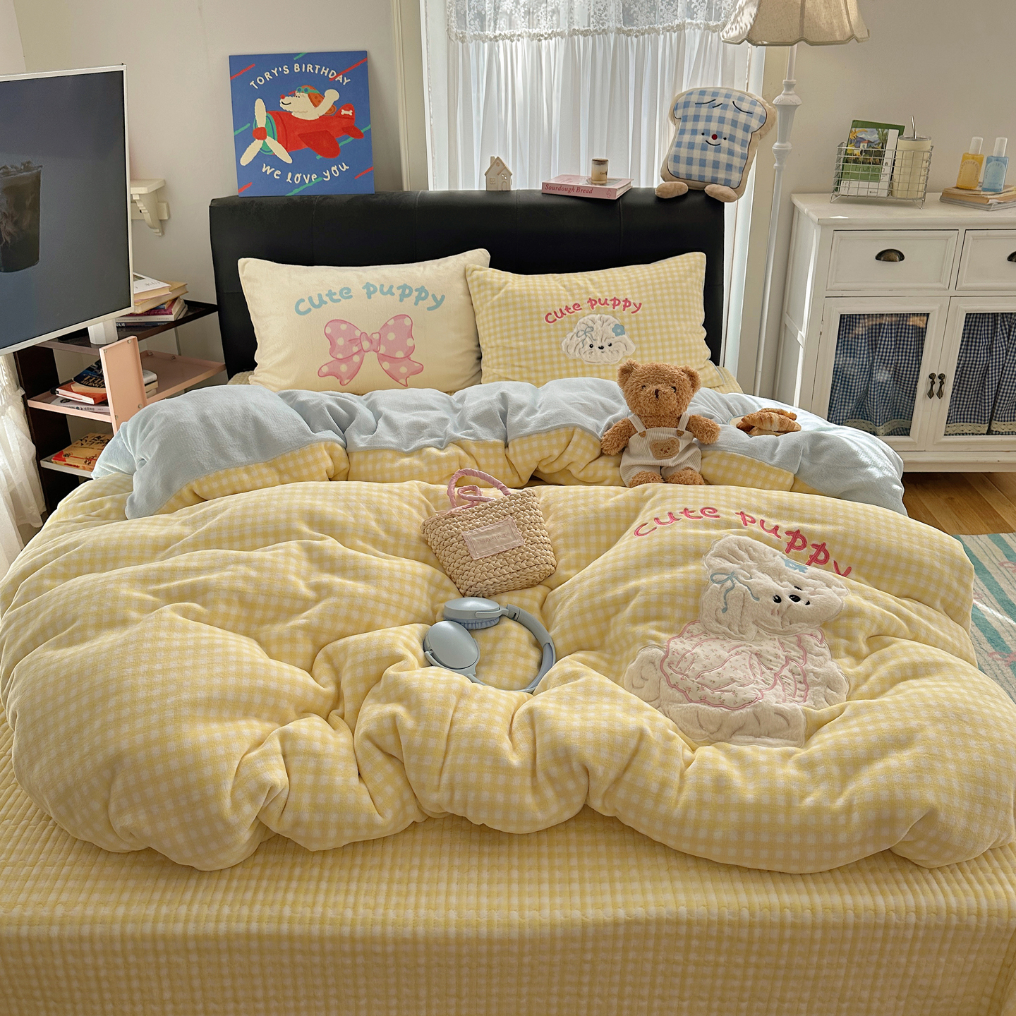 觅糖家纺 2025新款大版卡通牛奶绒床盖四件套 甜心哈基米