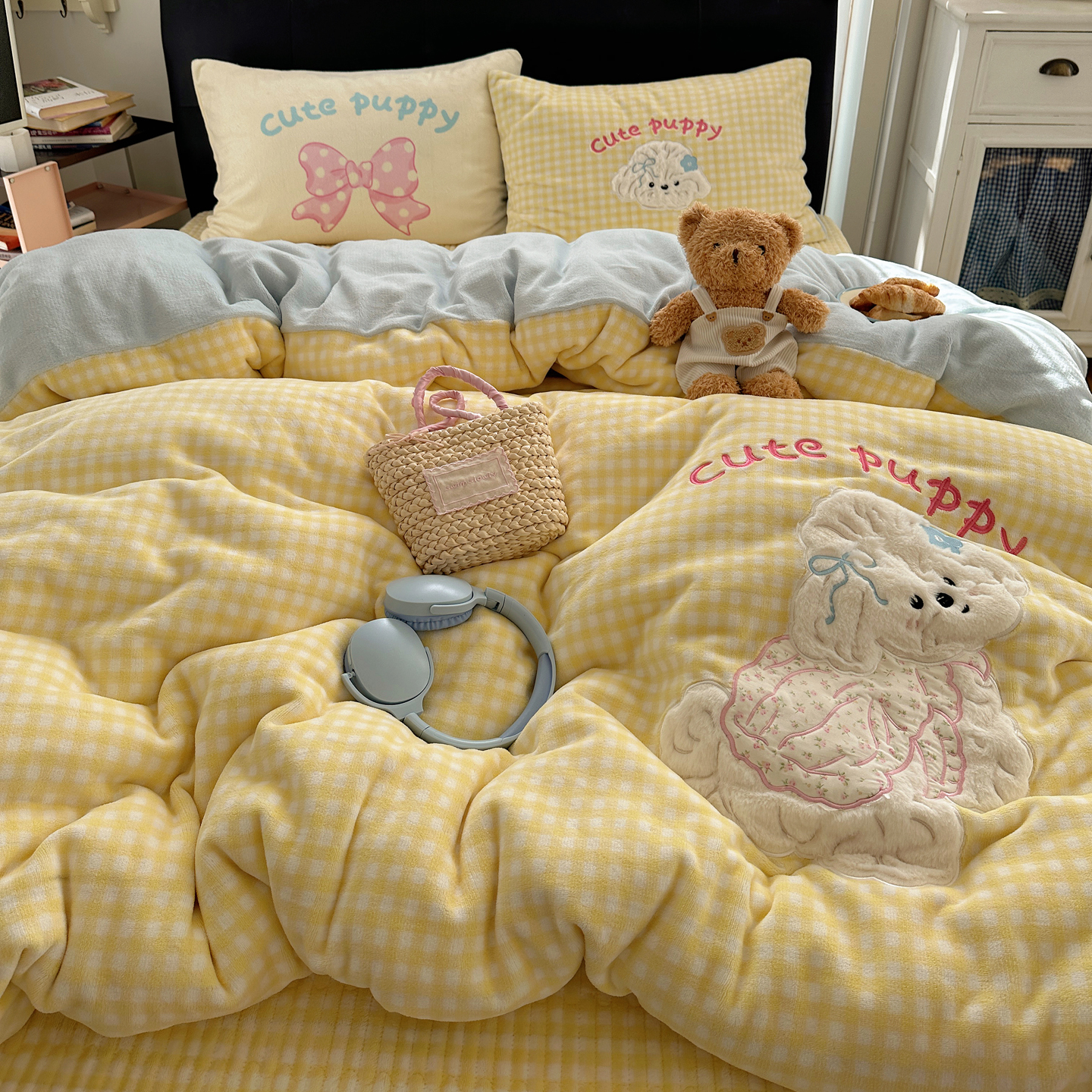 (总)觅糖家纺 2025新款双面泰迪绒卡通毛巾绣系列四件套,彩色蝴蝶结,欢乐腊肠狗,咖啡屋,奶呼西高地,企鹅咕噜,晚安熊仔