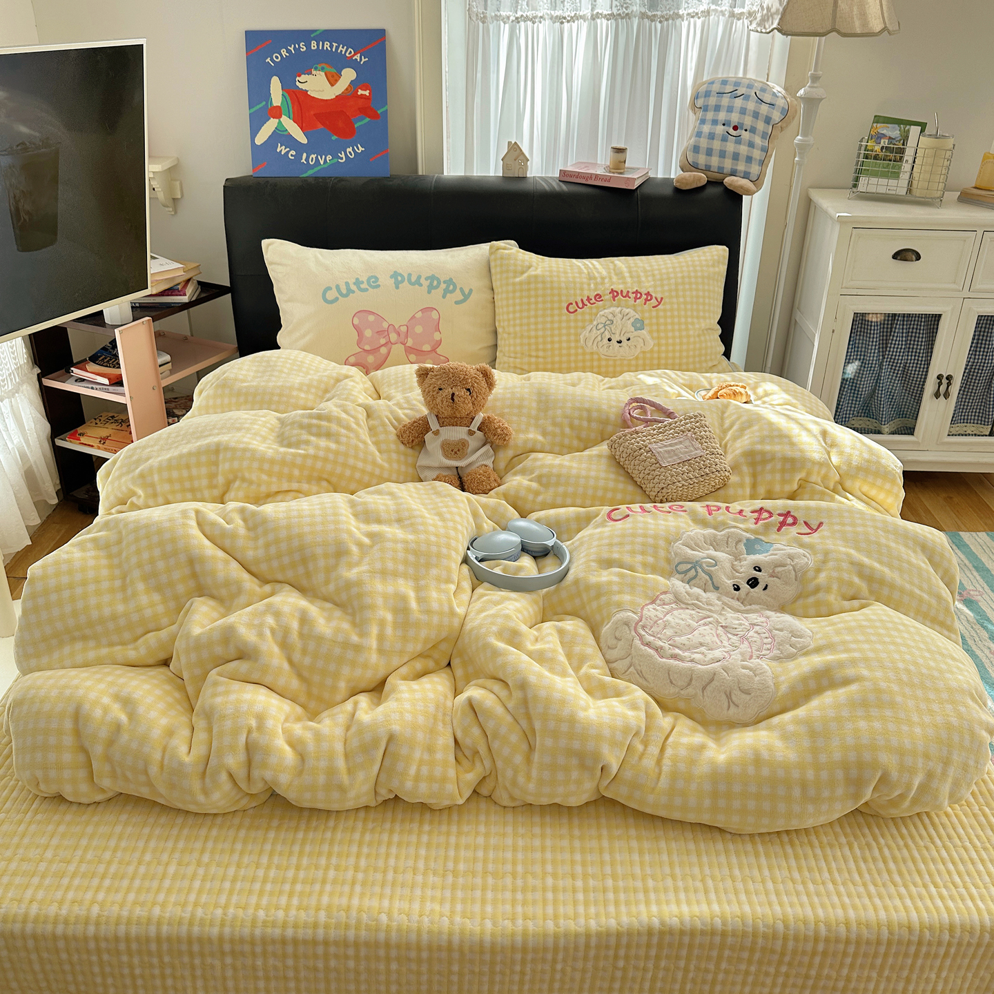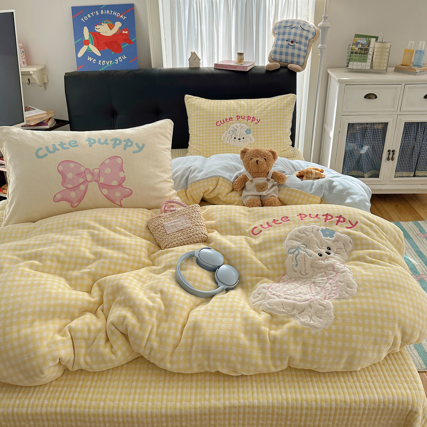 (总)觅糖家纺 2024新款牛奶绒印花小版毛巾绣四件套,爱心蝴蝶结,格子企鹅,马戏团,奶酪派对,扭扭蛋仔,苹果小猫,许愿星,黑白兔兔,咖啡猫,可爱熊粉,快乐小熊蓝,绿色大眼怪,奶牛小狗