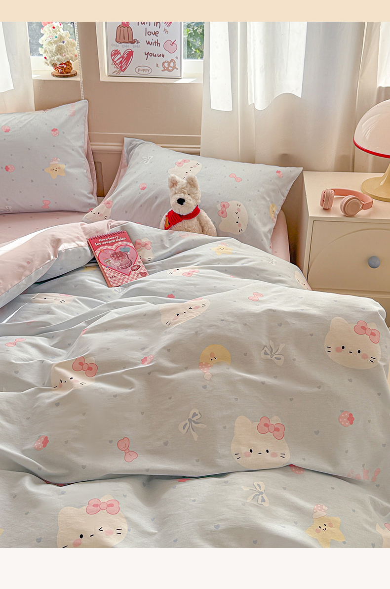 (总)曼之夏 2025新款全棉纯棉40支学生季卡通印花四件套,椰蓝小腊肠,茶茶狗,格子猫,嗨皮狗,开心屋,可爱多,可可汪,玛奇朵,奶昔小熊,泡芙小象,曲奇小狗,趣味熊,甜甜圈,甜心猫咪,童画,小狗日记,樱桃熊仔