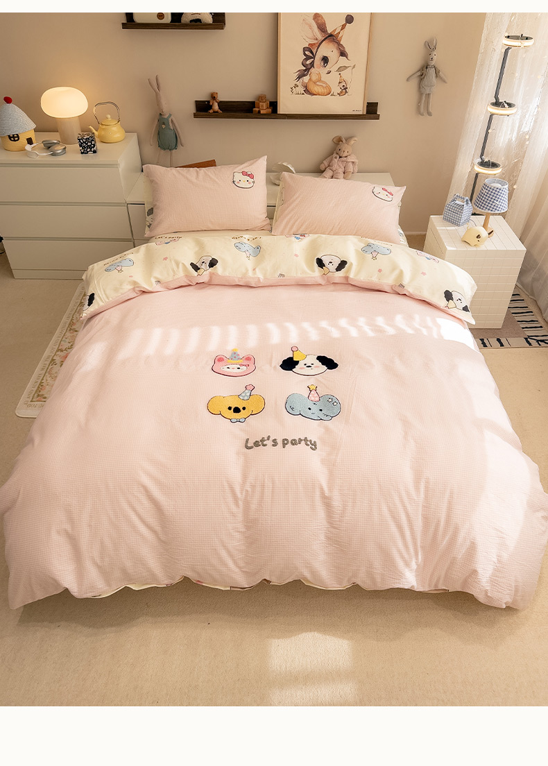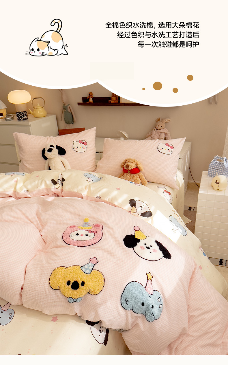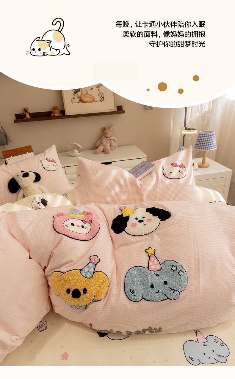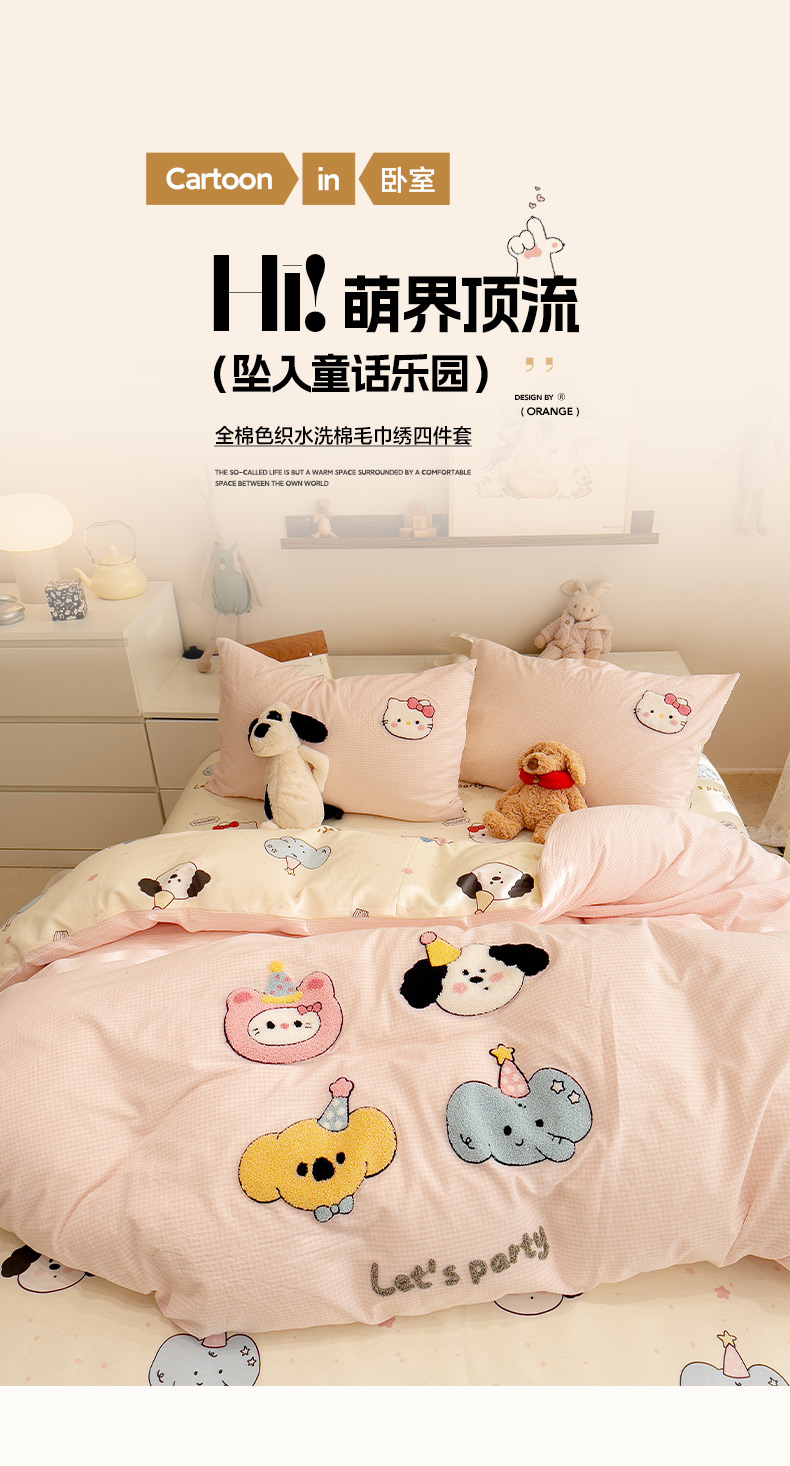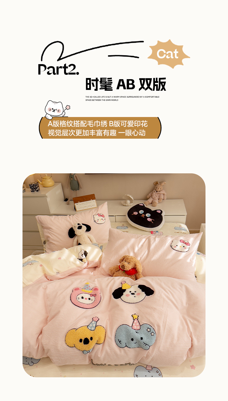 (总)雅居纺家纺 2026新款全棉双层纱毛巾绣四件套,蛋糕猫咪,红苹果小狗,萌宠甜品,早安兔兔