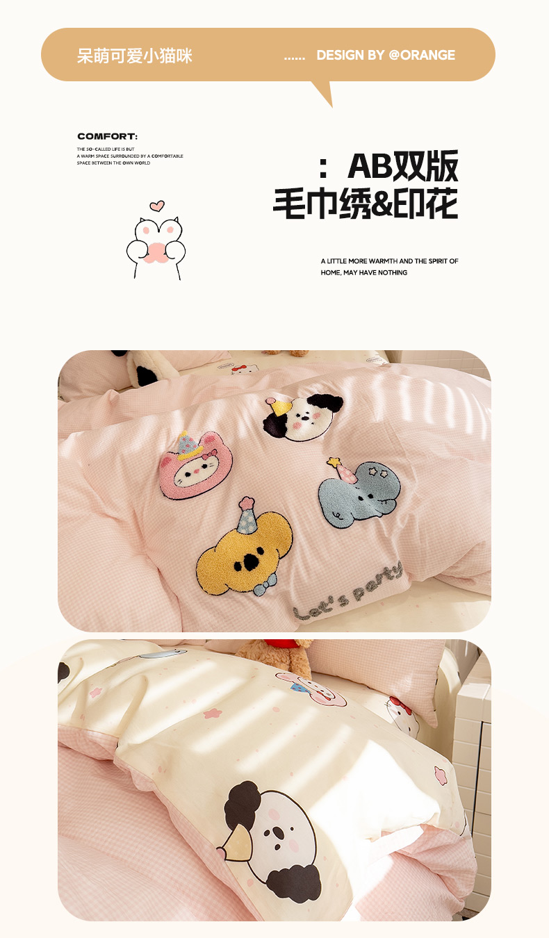 雅居纺家纺 2026新款全棉色织水洗棉毛巾绣猫咪四件套 派对小猫