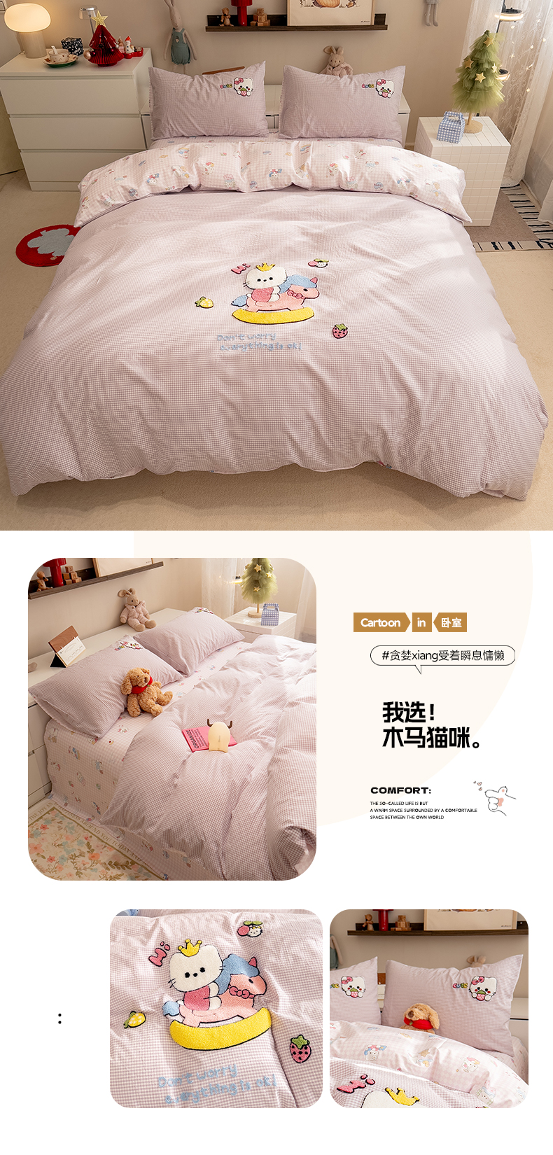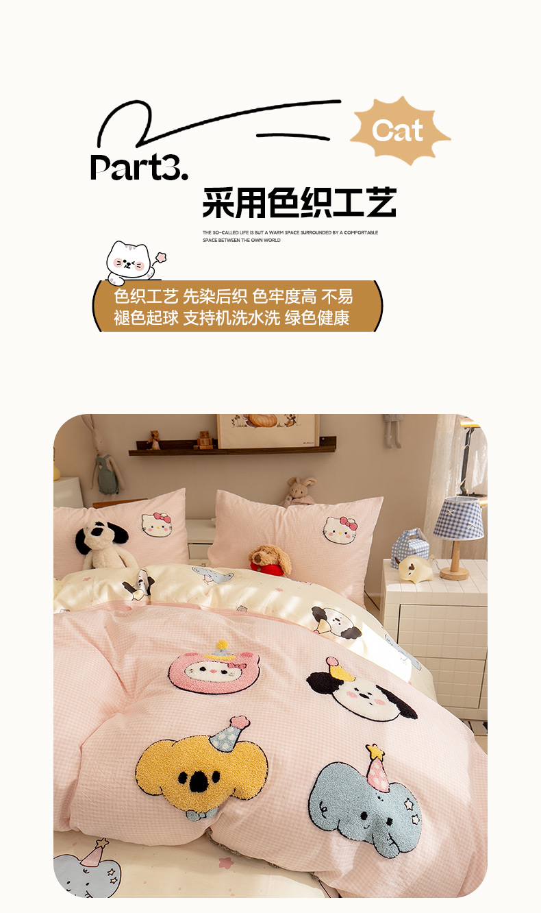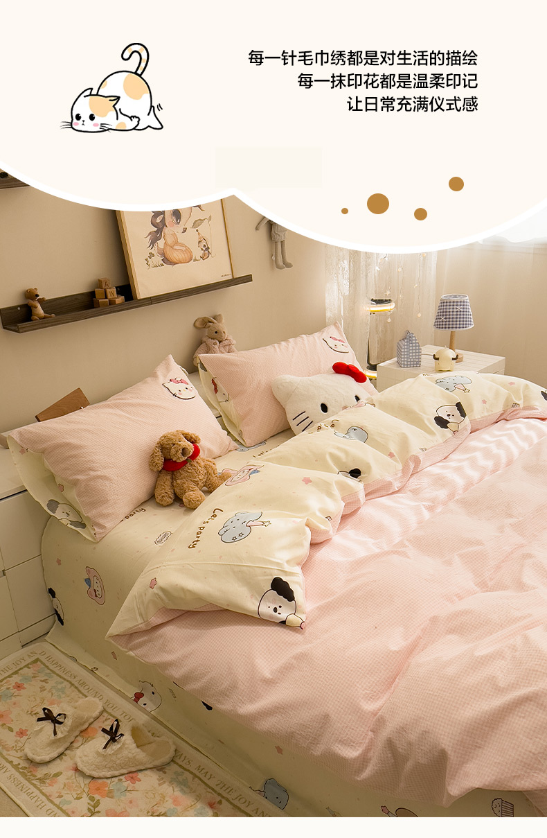 商品名称:雅居纺家纺 2026新款全棉色织水洗棉毛巾绣猫咪四件套 派对小猫