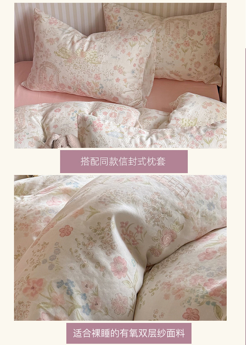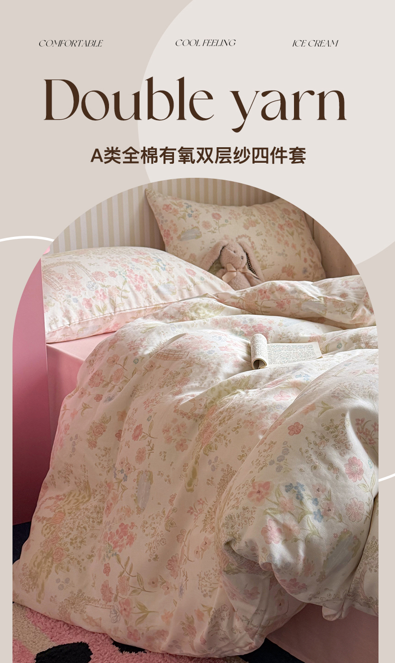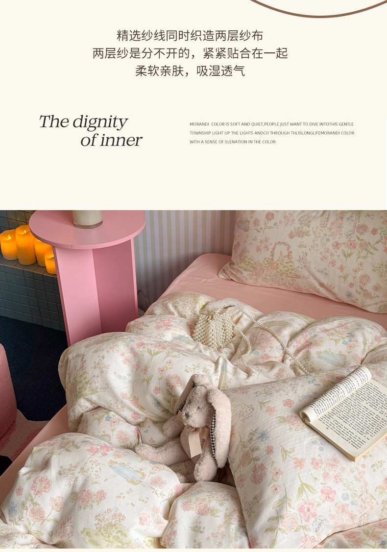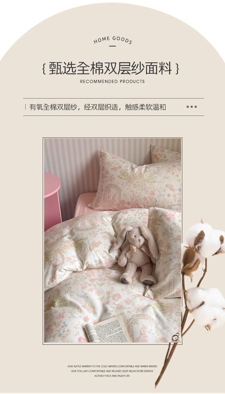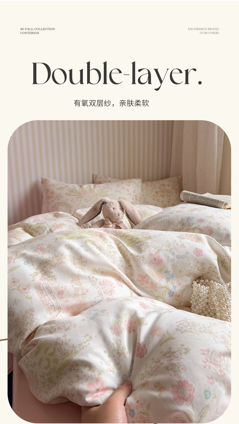 当前位置: 91家纺网 > 商品网购 > 床品套件 > 四件套 > 双层纱四件套 > 麦伦家居 2026春夏新品全棉有氧双层纱印花系列简约款四件套 花间兔语