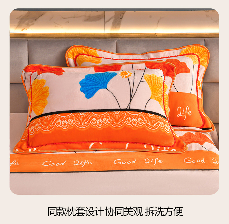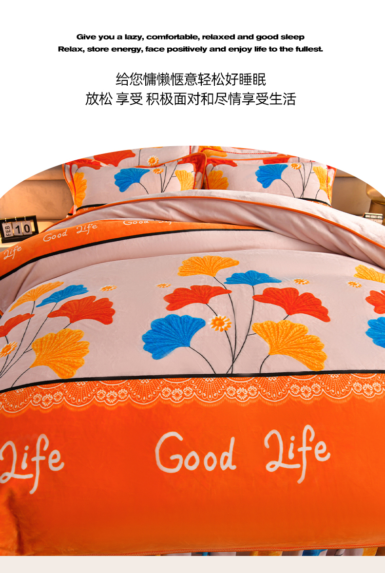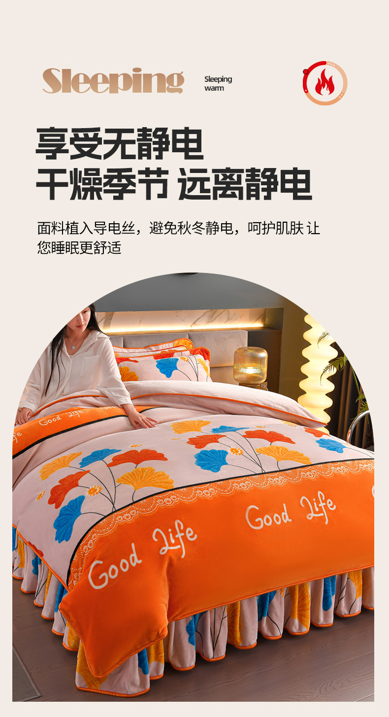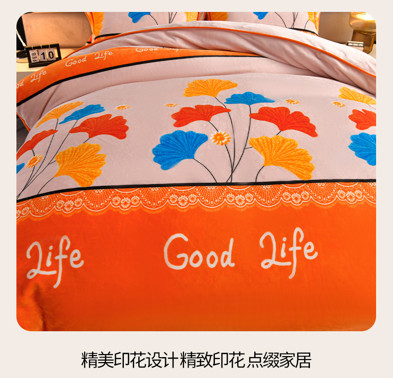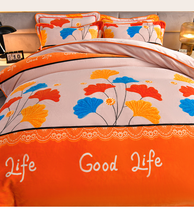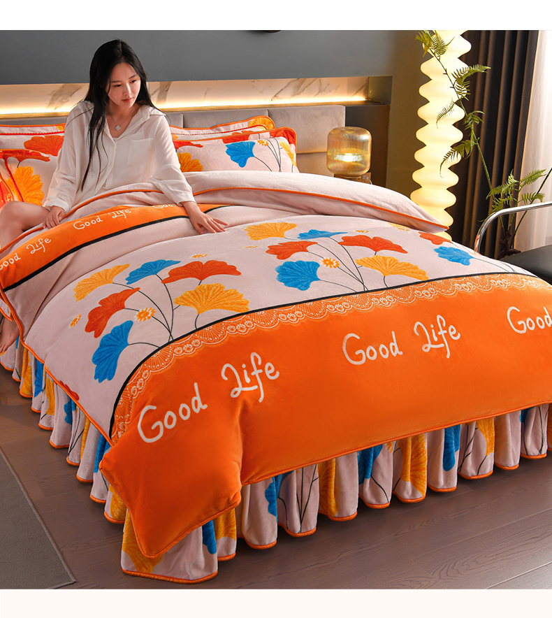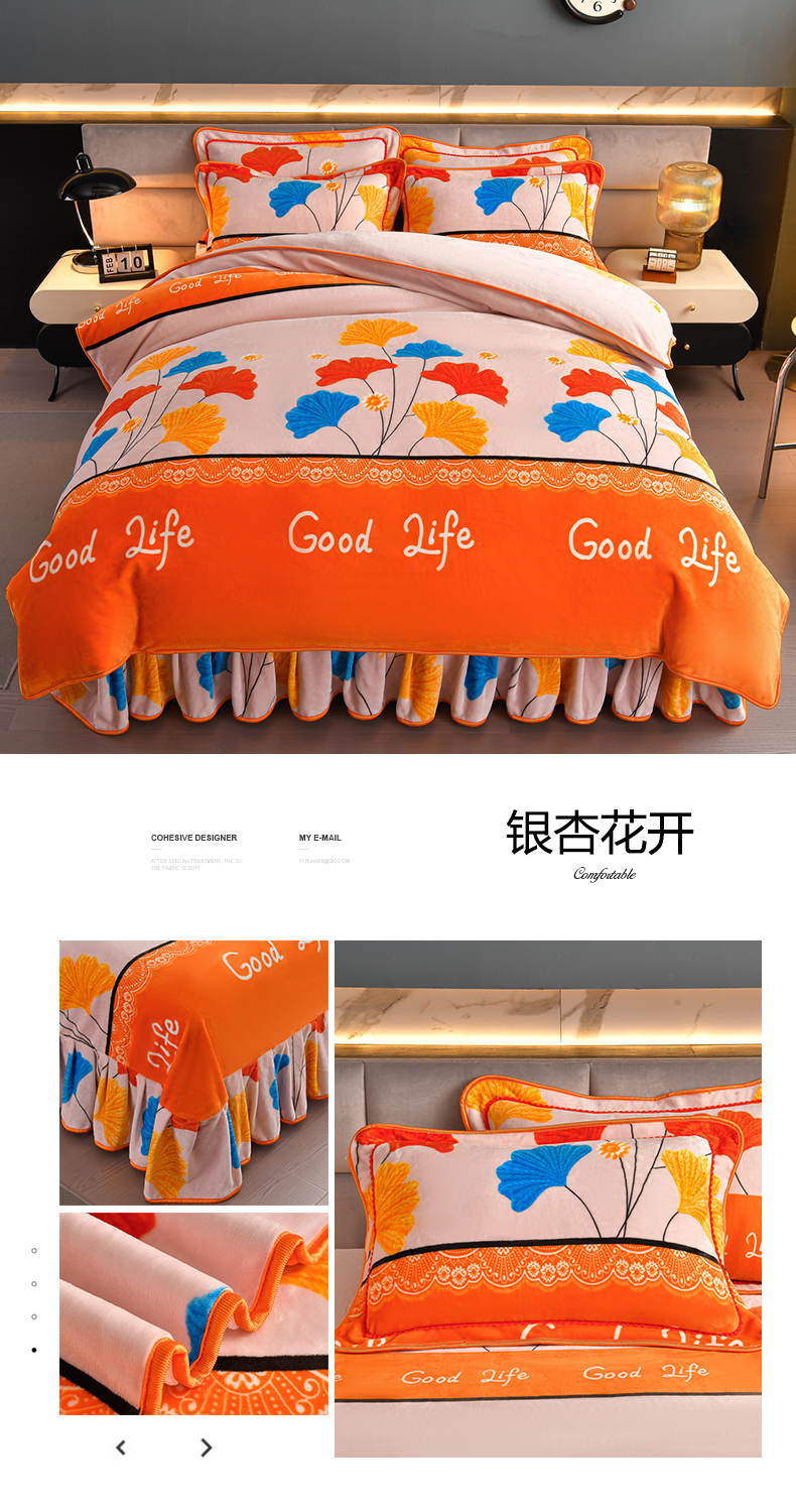 商品名称:董成龙家纺 20256新款高克重9-10斤加厚印花超柔牛奶绒爆款法莱绒金貂绒床裙四件套控价 银杏花开