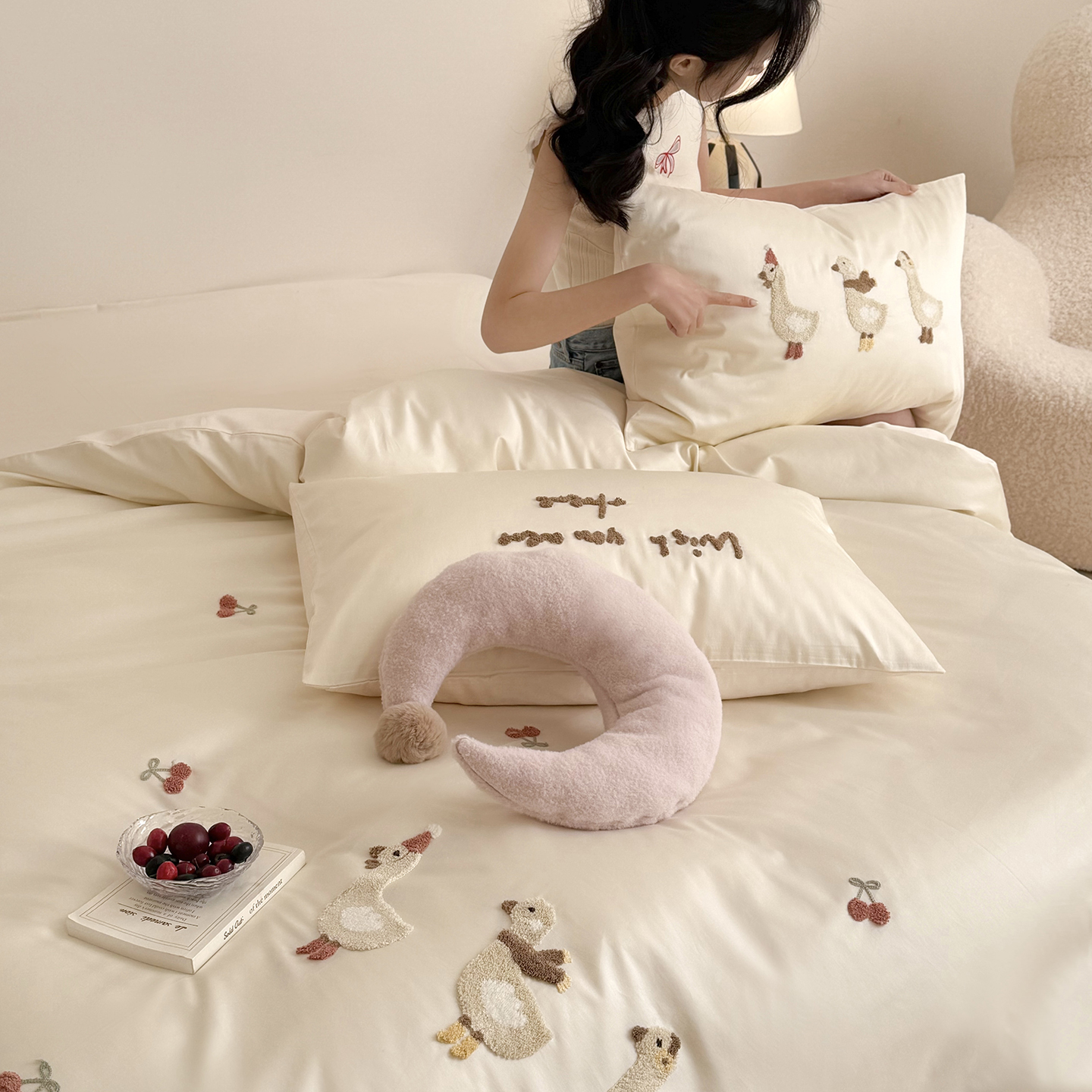 商品名称:鹿班家居 2026春季新品100S长绒棉毛巾绣系列四件套-野游去鸭(标准会员-20元) 野游去鸭-奶白