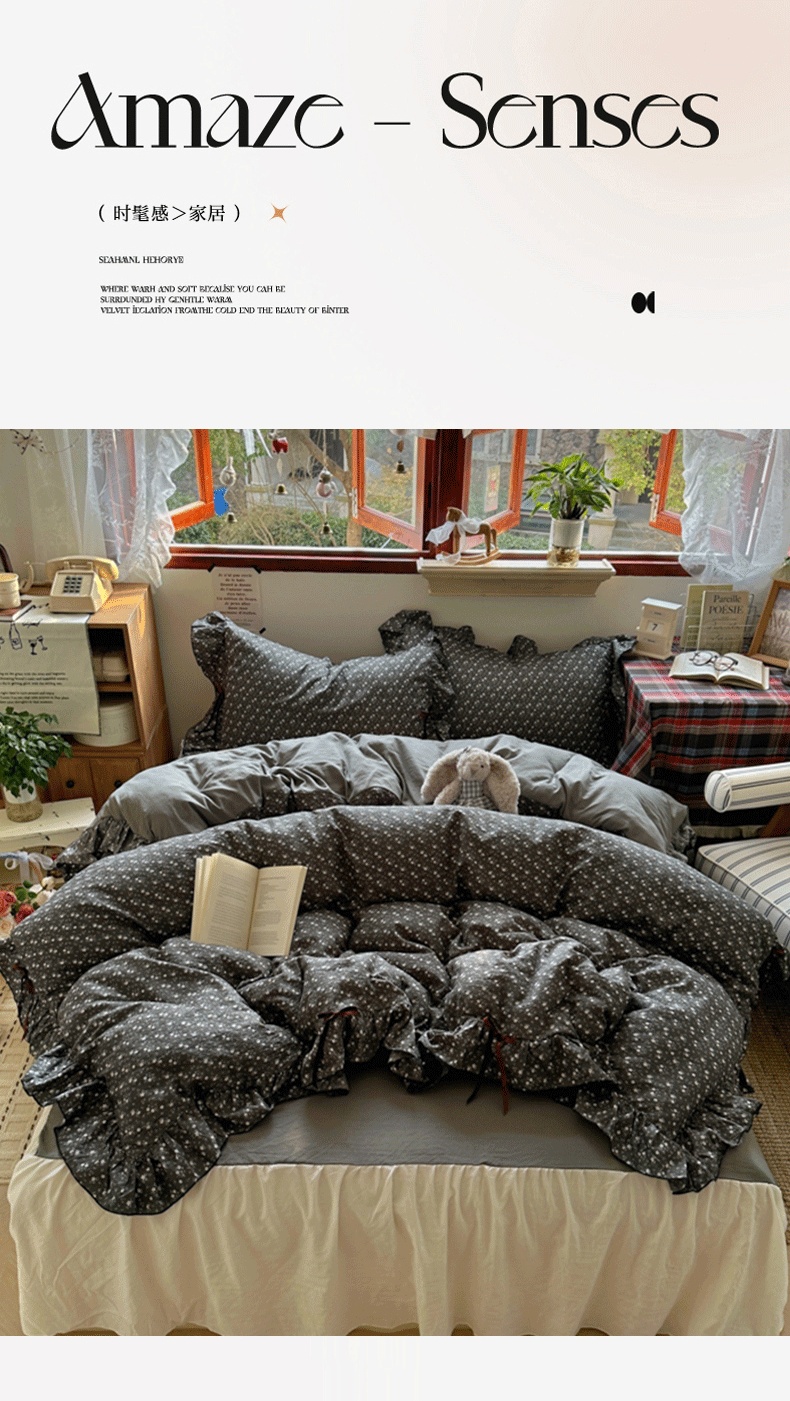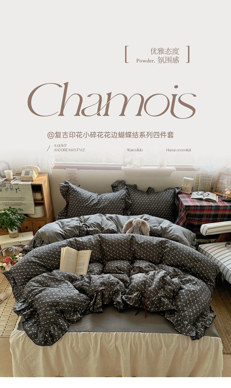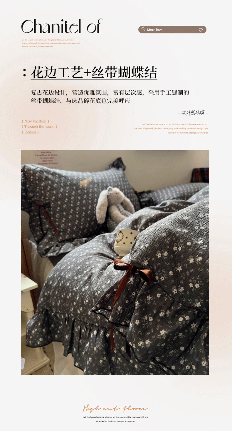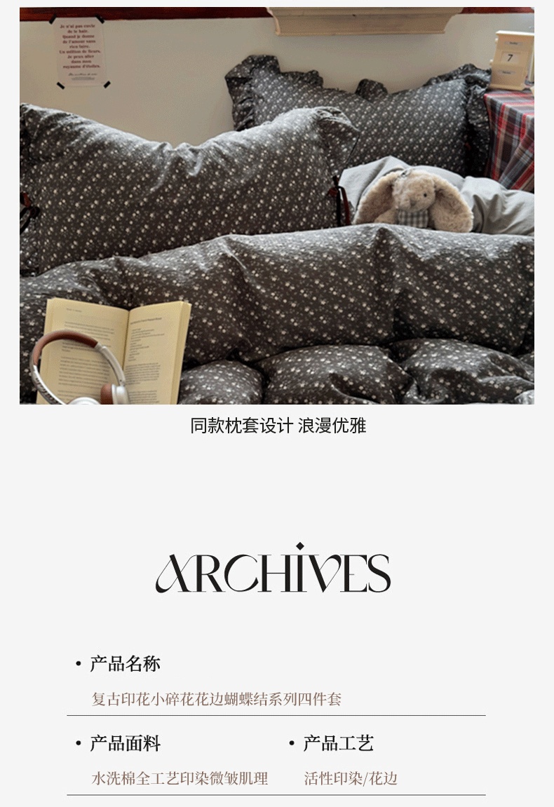 当前位置: 91家纺网 > 商品网购 > 床品套件 > 四件套 > 其它四件套 > 阿曼达 2026新款日韩系复古印花小碎花花边蝴蝶结系列四件套 复古蝴蝶结-松月间-灰【专版花型】