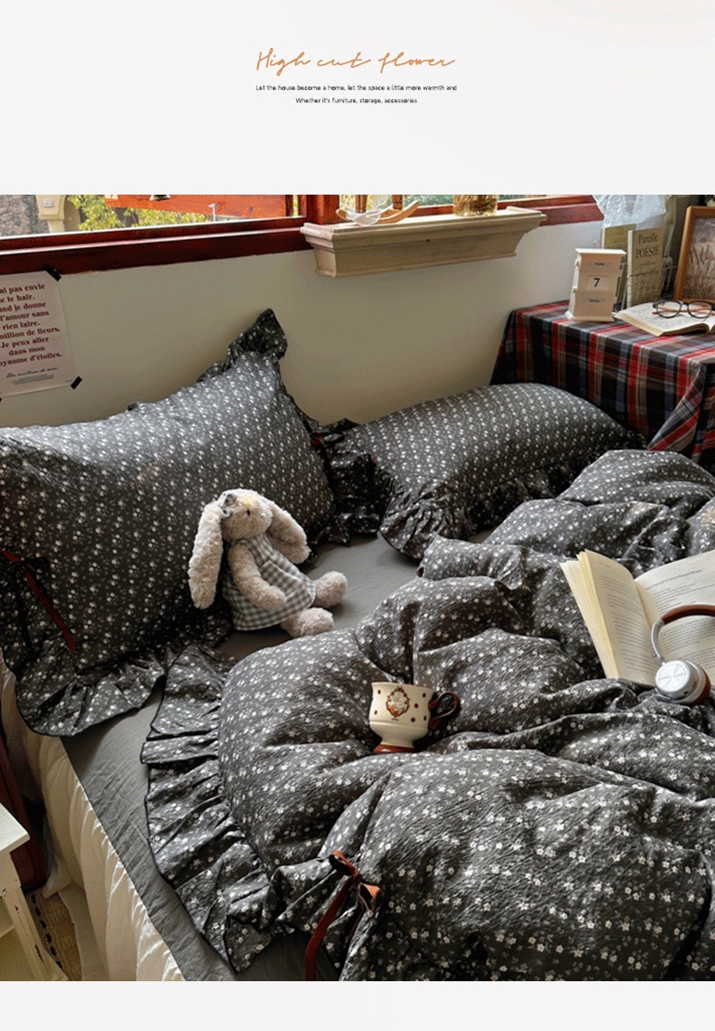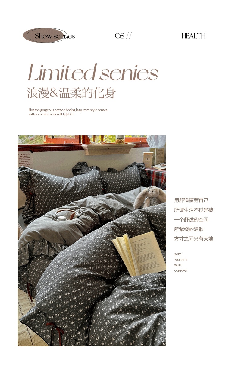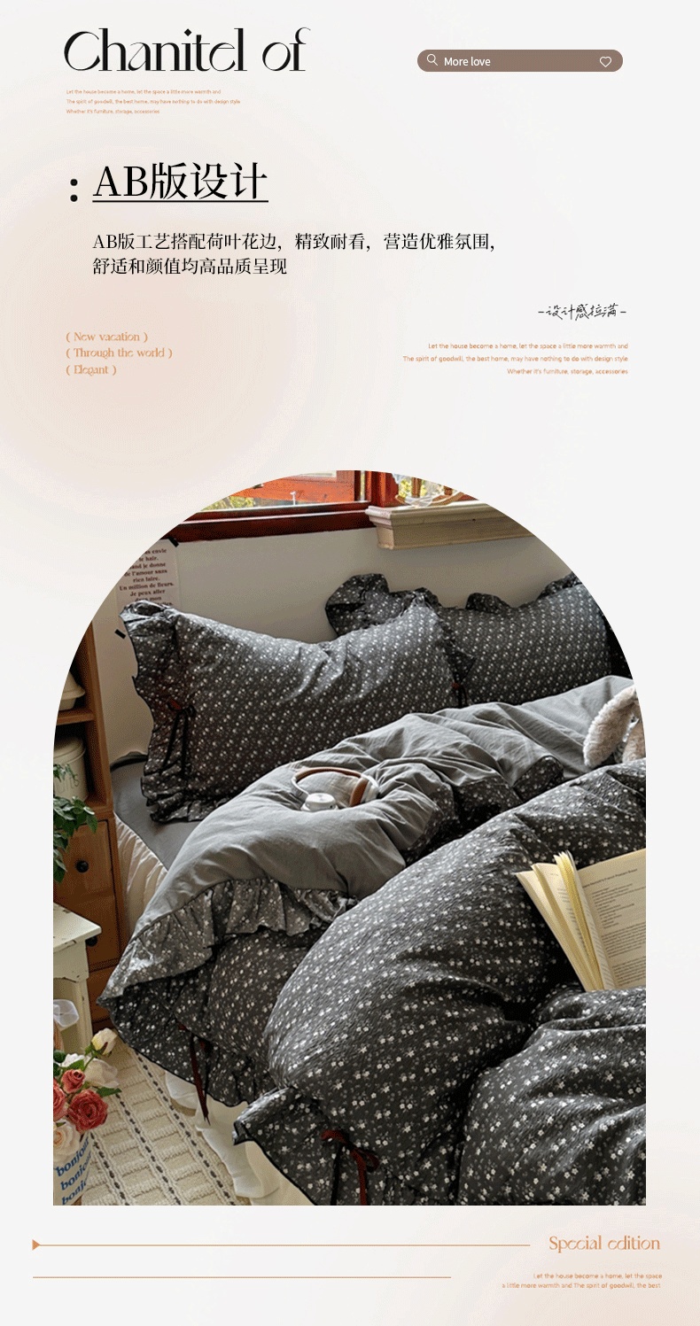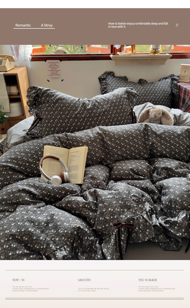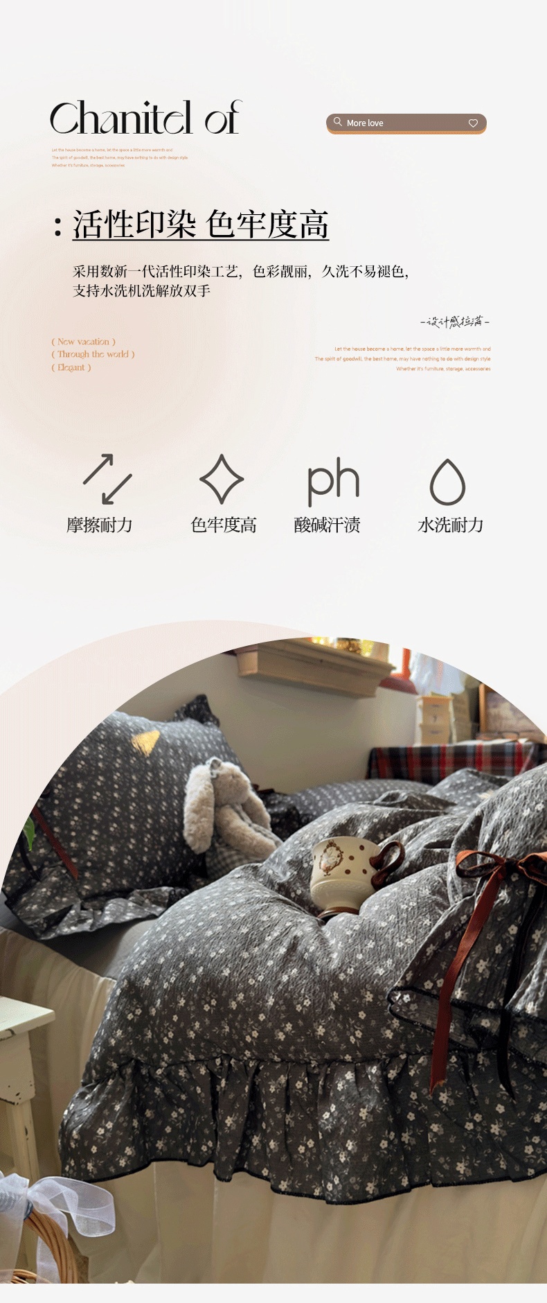 当前位置: 91家纺网 > 商品网购 > 床品套件 > 四件套 > 其它四件套 > 阿曼达 2026新款日韩系复古印花小碎花花边蝴蝶结系列四件套 复古蝴蝶结-松月间-灰【专版花型】