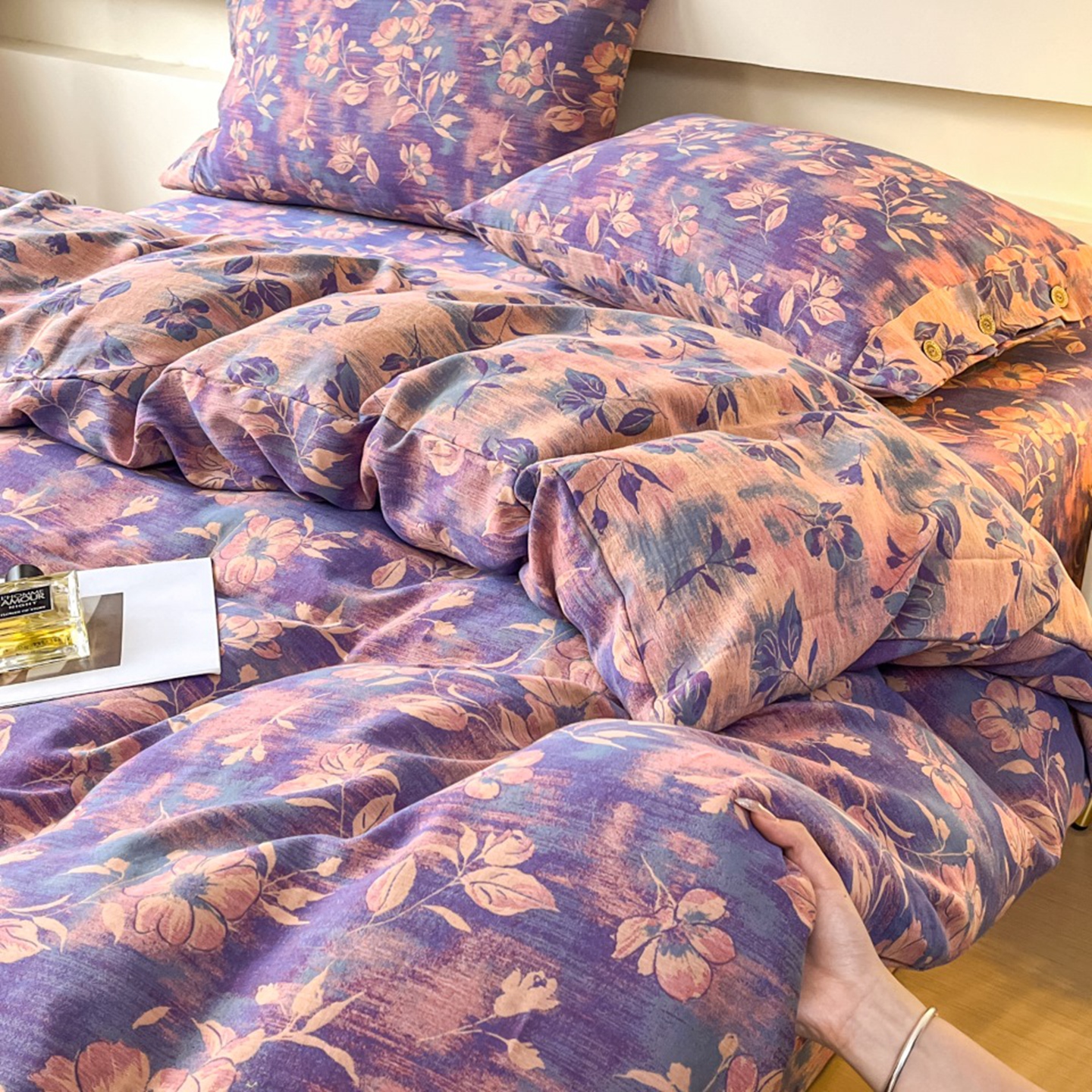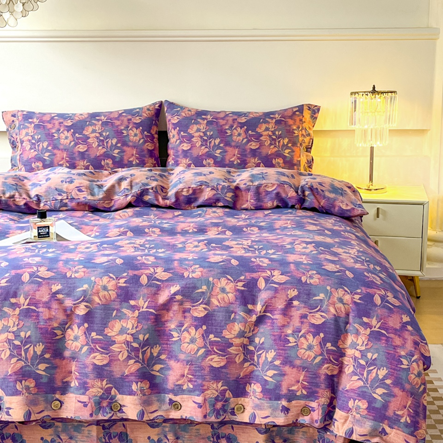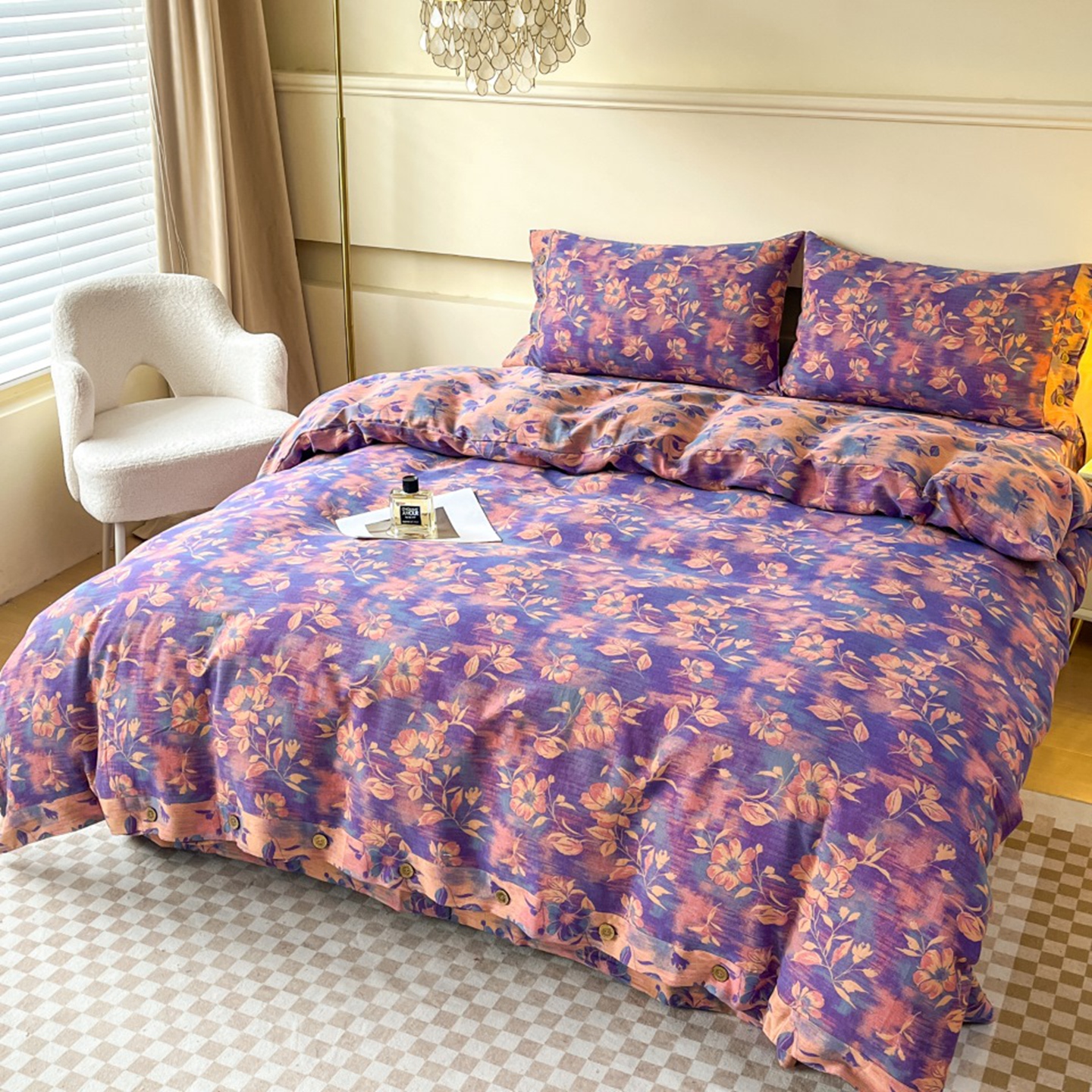 (总)双层纱家居 2026新款花海全棉纯棉色织提花双层纱纽扣款四件套