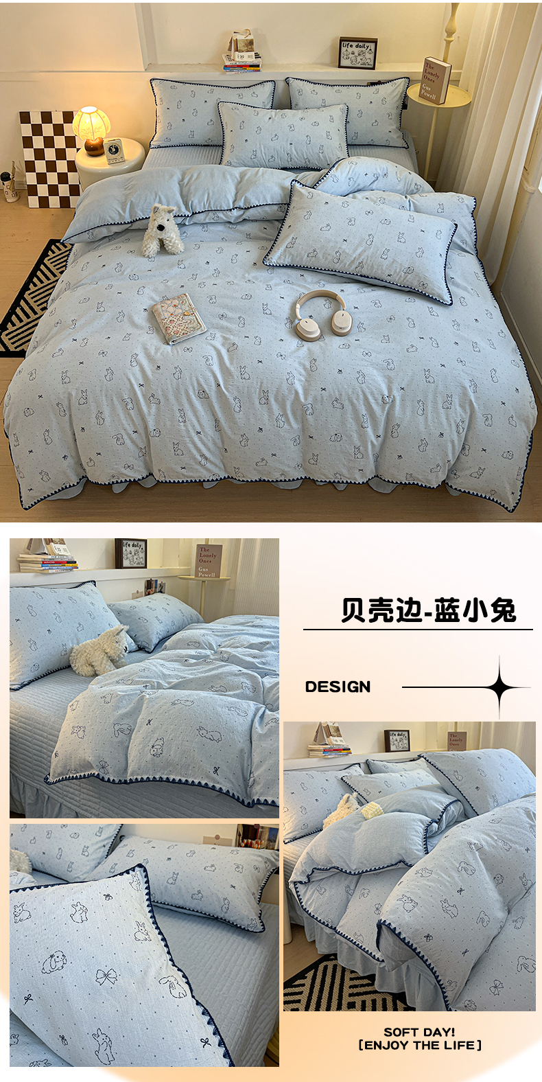 当前位置: 91家纺网 > 商品网购 > 床品套件 > 四件套 > 色织四件套 > 富米莱(原臻工厂) 2026春夏新款色织提花贝壳边床盖床裙四件套 贝壳边-蓝小兔