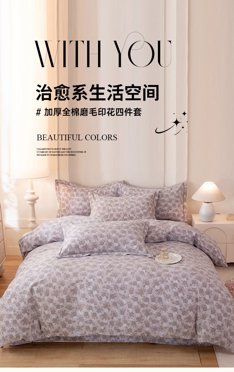 (总)磨毛世家家纺 2026新款铂金磨毛纯棉加厚全棉磨毛四件套,波点-粉,波点-灰,城南往事-紫,风信紫,哥伦比亚-蓝,花团锦簇-灰,华丽之都-桔,静初-灰,玫瑰之心-灰,上林春色-蓝,香雪海-粉,香雪海-蓝,永恒之羽-灰,永恒之羽-蓝