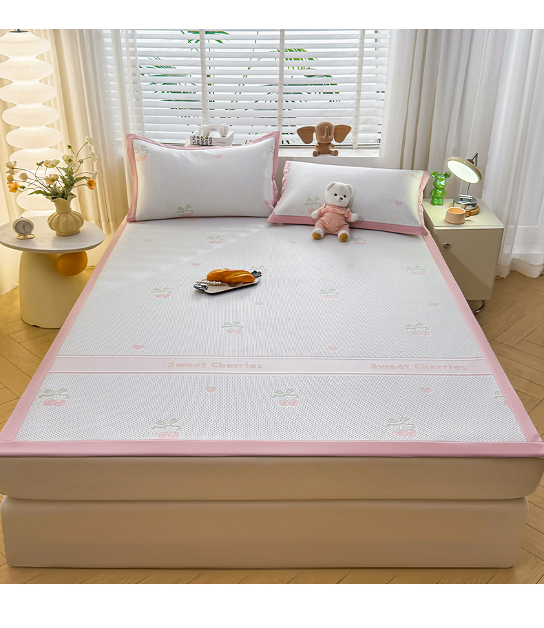 (总)凯罗 2026新款凉感提花冰丝床笠床席三件套冰感抗菌床席床笠三件套--床席款,简约生活--粉