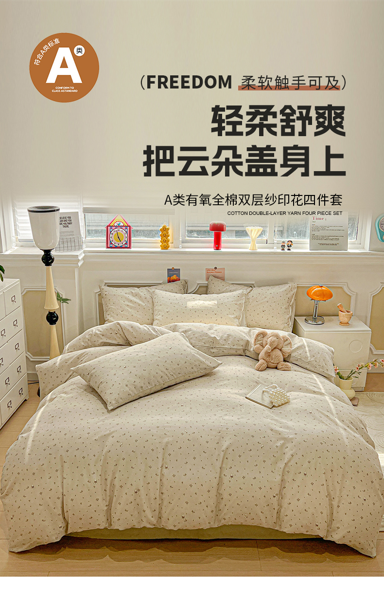 当前位置: 91家纺网 > 商品网购 > 床品套件 > 四件套 > 双层纱四件套 > 亿梵家居 2026新款A类母婴级有氧纯棉印花双面全棉双层纱四件套-床拍图春夏气息
