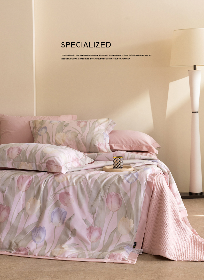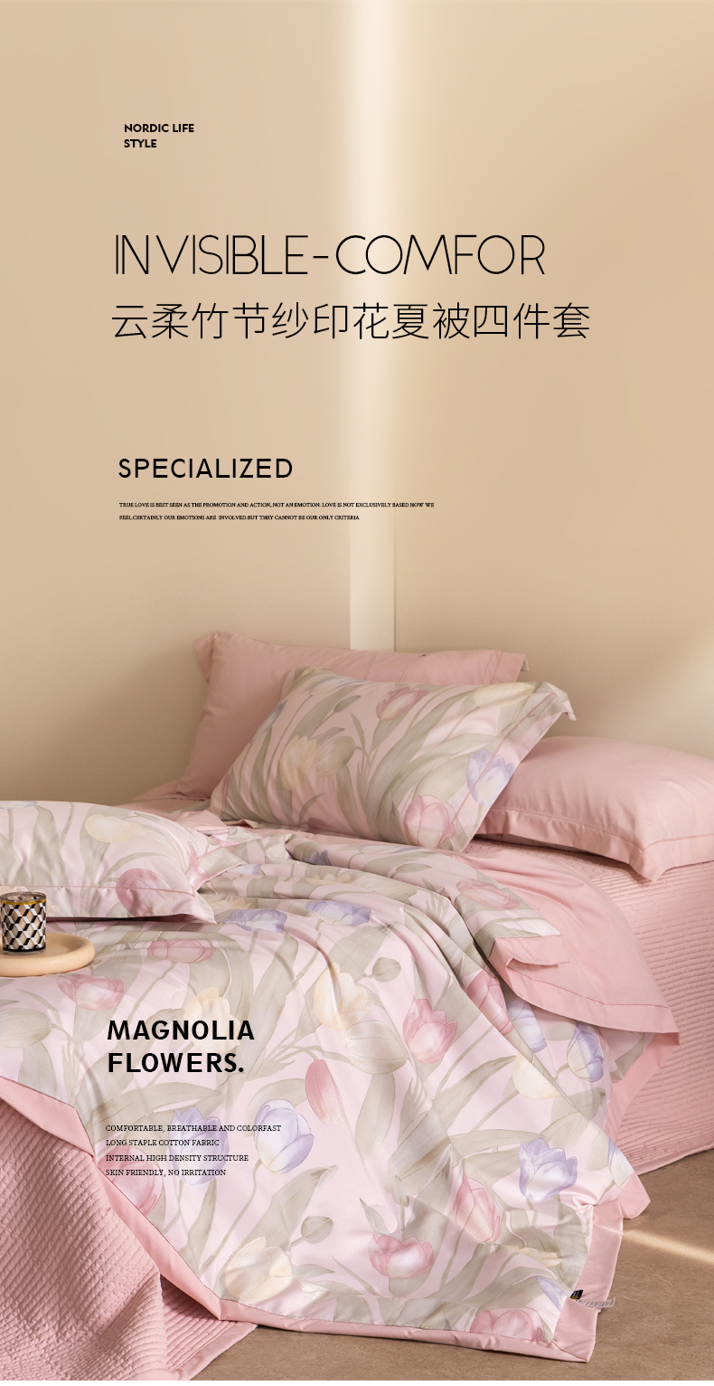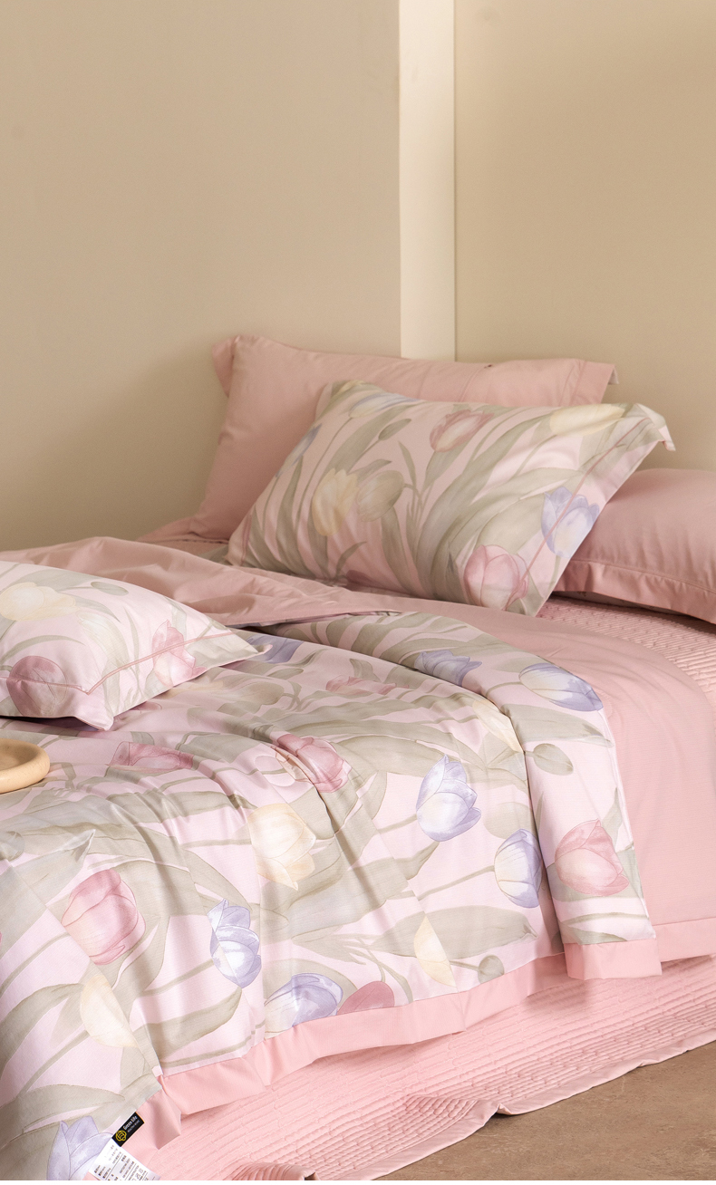 • 91家纺网 家纺一手货源 找家纺 立奥被业 2026新品冰丝棉夏被四件套竹节纱夏被四件套 翠袖黄冠-粉