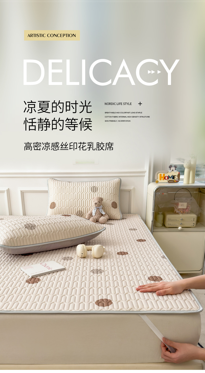 (总)丝羽坊 2026新款高密凉感丝印花乳胶凉席-床笠款,雾蓝花影,萌宠拼格,粉黛萌兔,格纹蝶影,奶白萌犬,浅蓝熊趣,糖果猫咪,彩糖点点,林间私语,薄荷甜心,爱的圈圈,春意盎然,奶绿汪仔,小白兔,小企鹅,小兔派对,星月