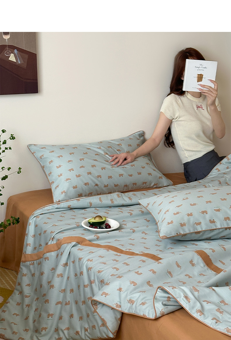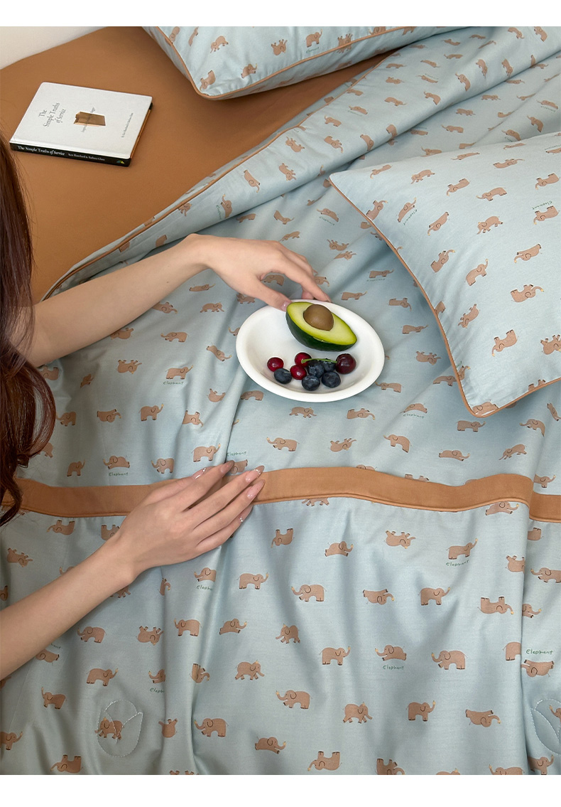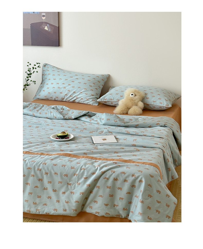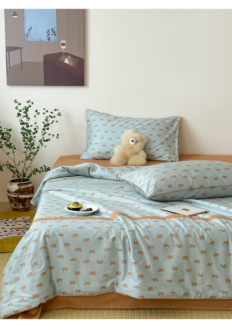 • 91家纺网 家纺一手货源 找家纺 一加一 2026新款活性印花透气工艺大豆夏被夏凉被空调被四件套-棉花叙 麦田小象 绿