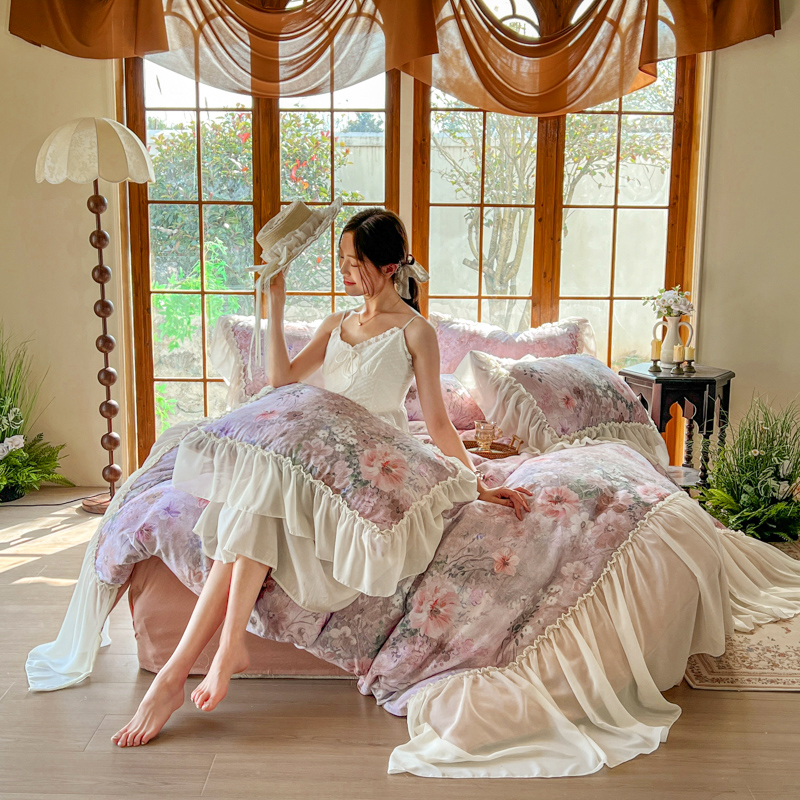当前位置: 91家纺网 > 商品网购 > 床品套件 > 四件套 > 全棉普通四件套 > 疆东 2026高端韩版法式公主复古油画风纯棉双层纱四件套赫本浪漫荷叶花边仙女全棉双层纱四件套床上用品被套 青青子衿
