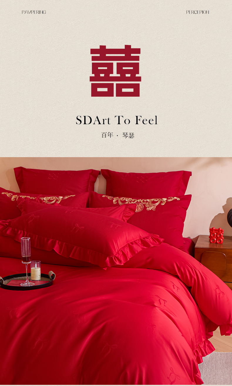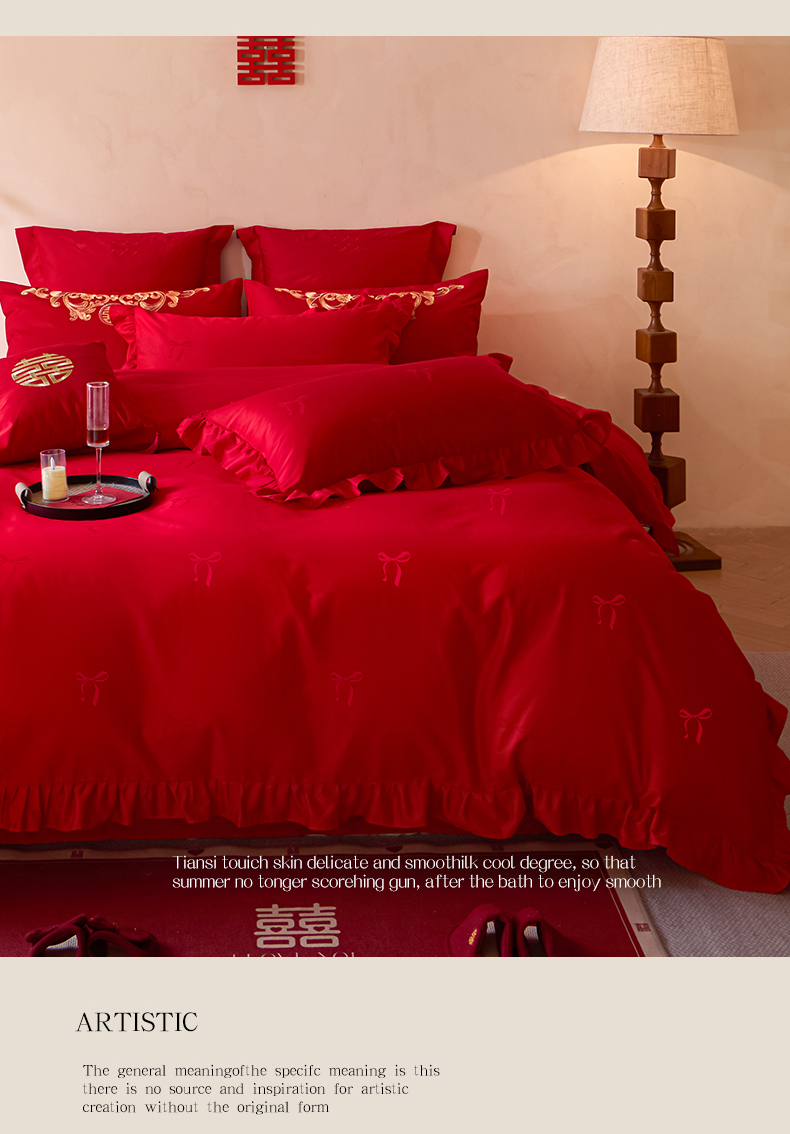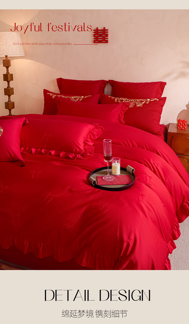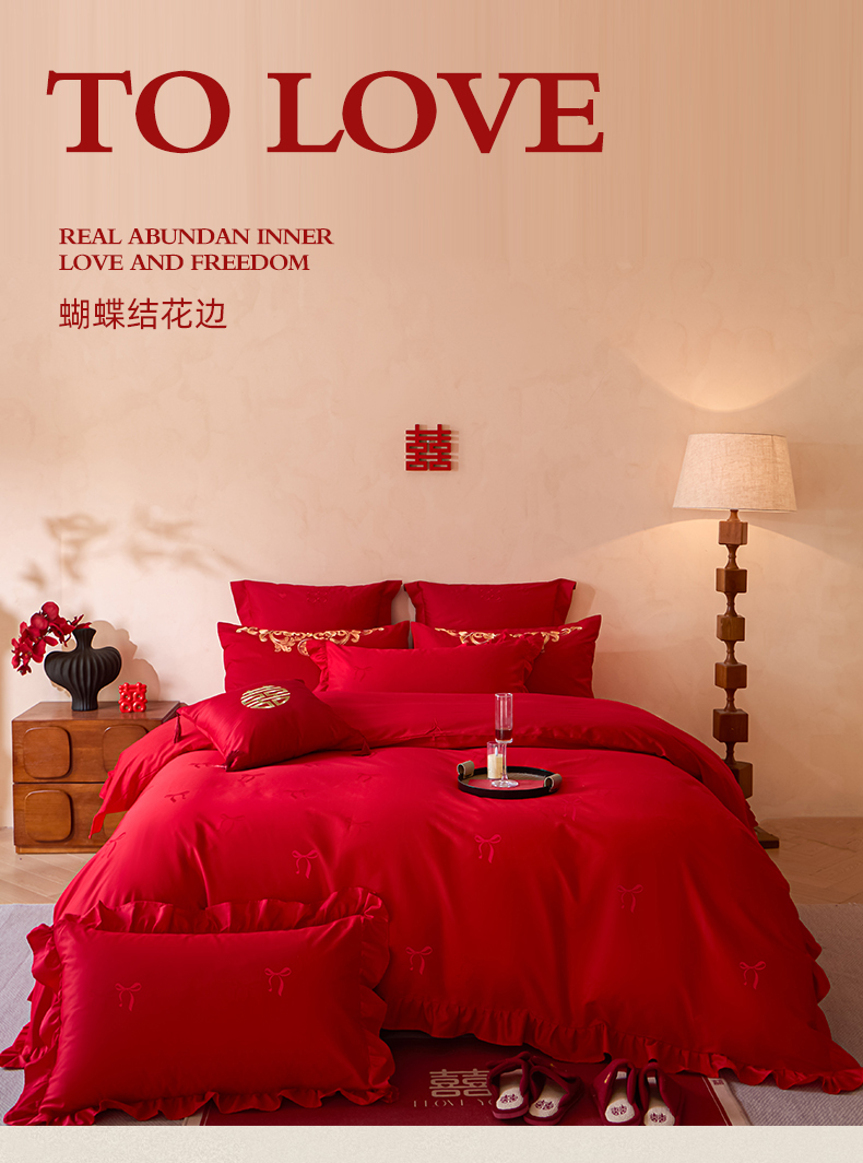 当前位置: 91家纺网 > 商品网购 > 床品套件 > 多件套 > 多件套 > 东方合美(原:皇家传奇) 2026新款长绒棉轻奢婚庆四件套 蝴蝶结花边