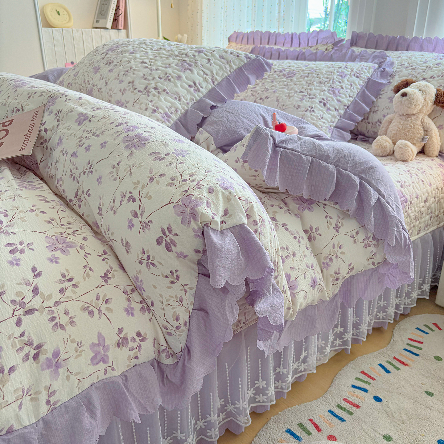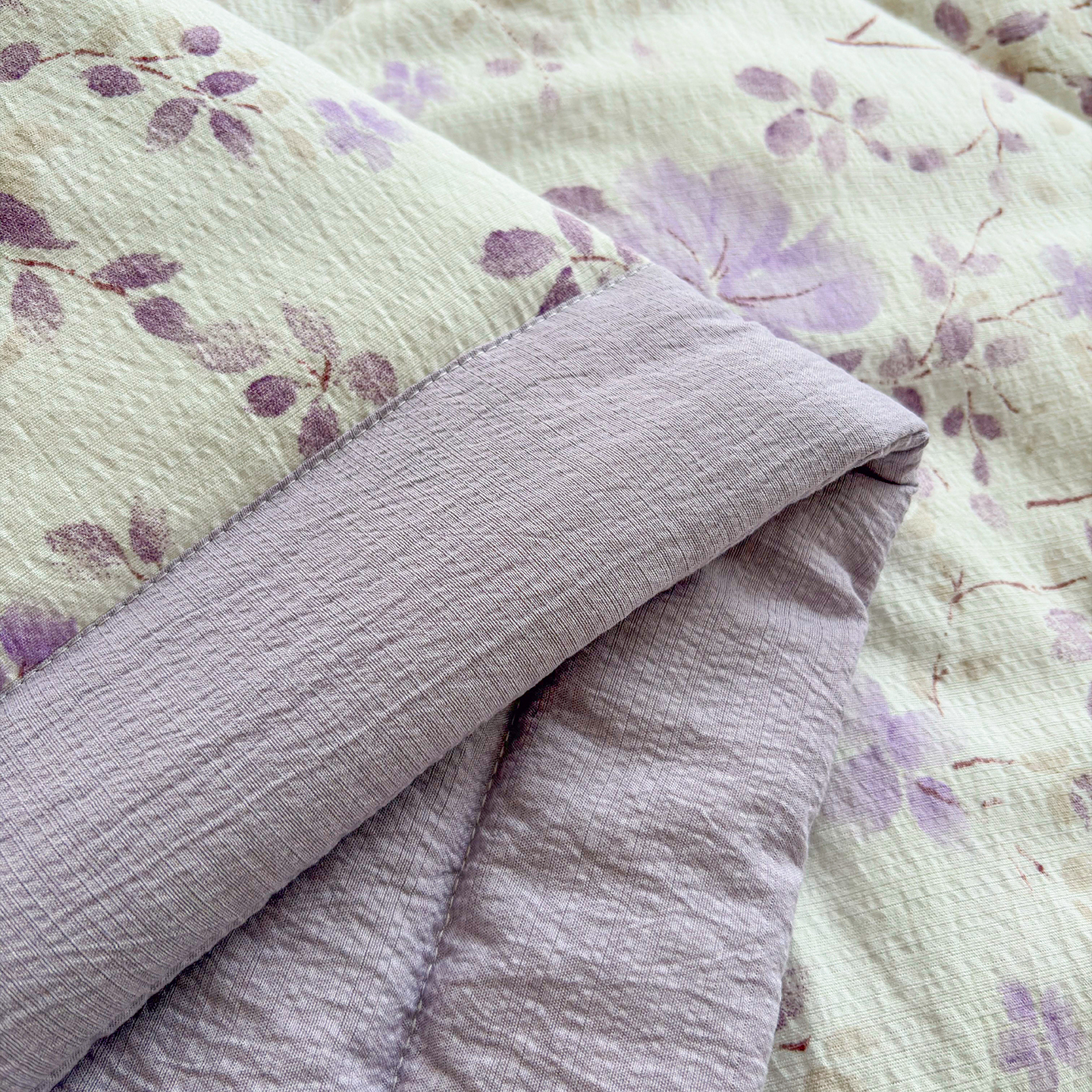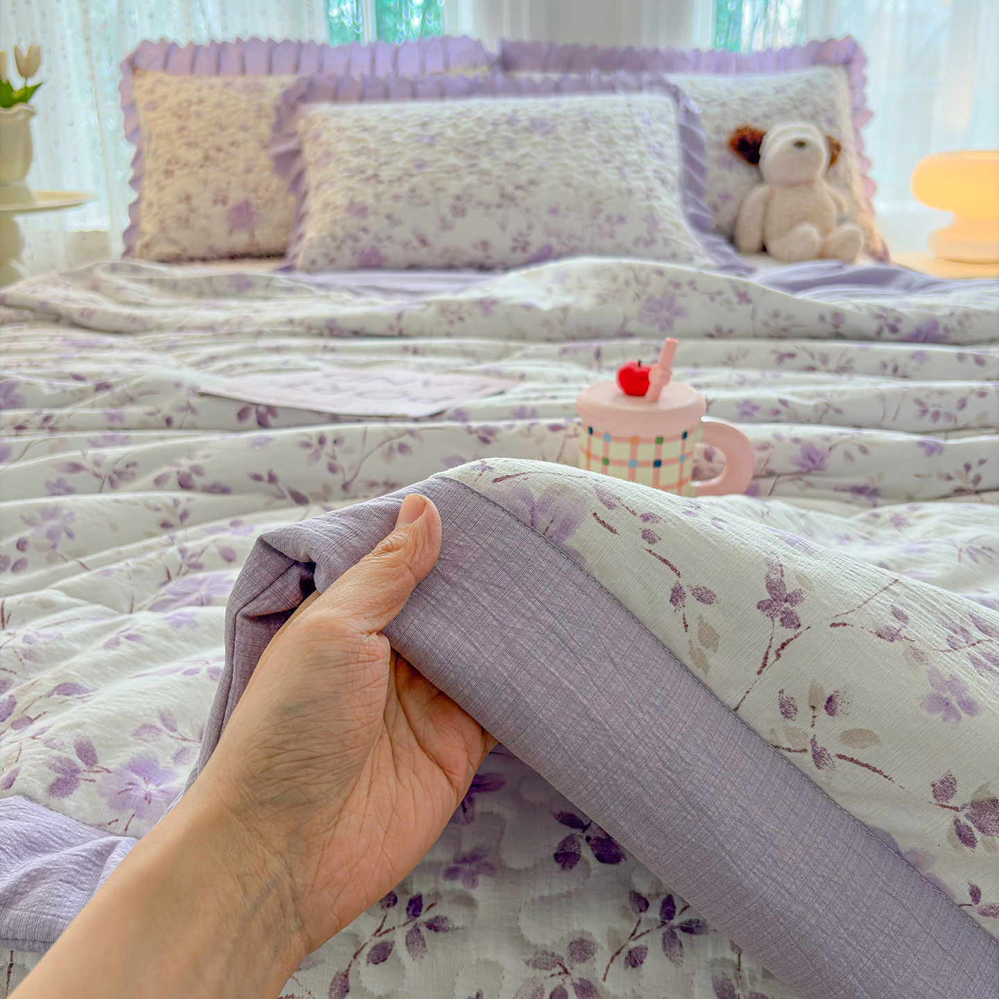 当前位置: 91家纺网 > 商品网购 > 床品套件 > 四件套 > 夏被四件套 > 绒耀家纺 2026春夏直播爆款泡芙棉云感双层纱皱皱纱韩式花边夏被四件套 紫薇