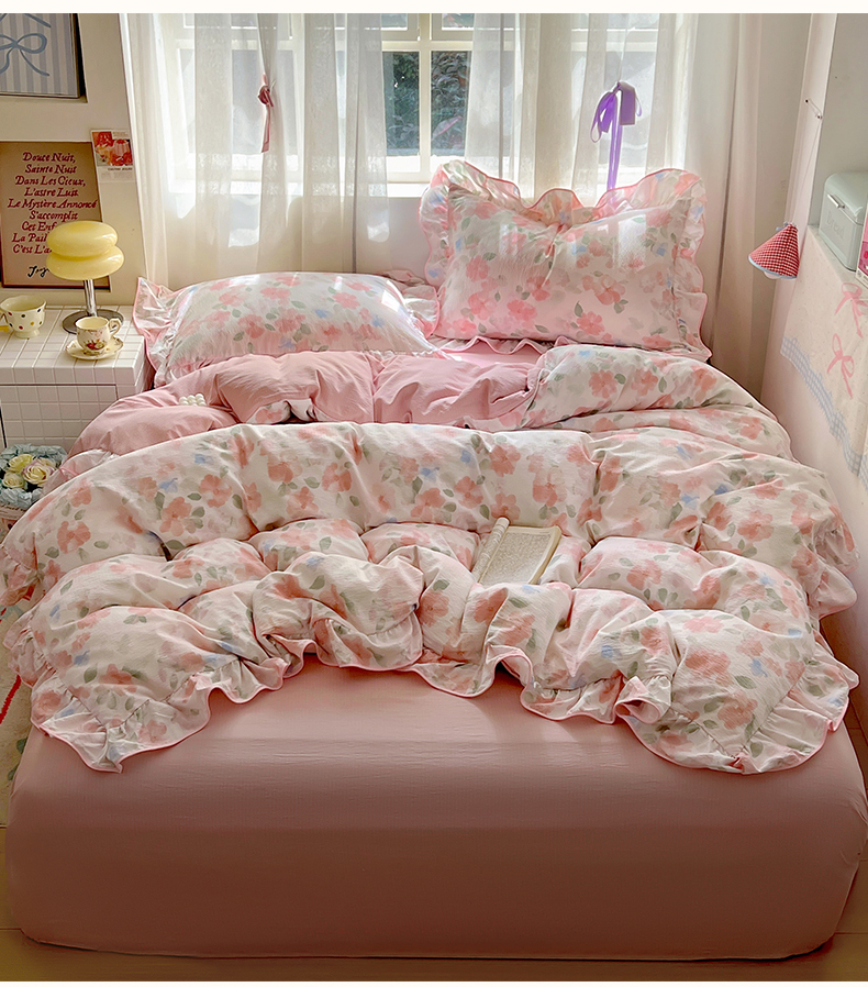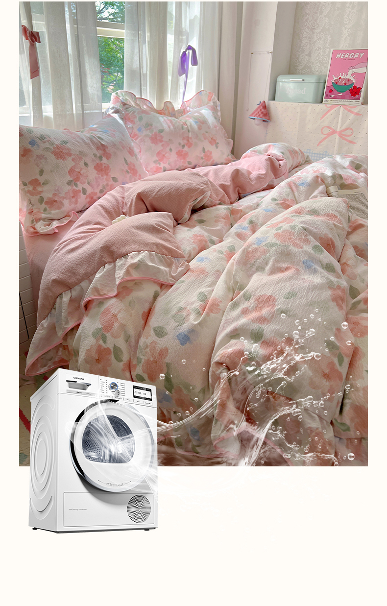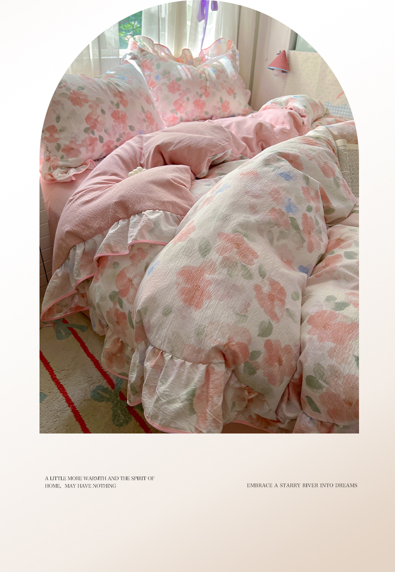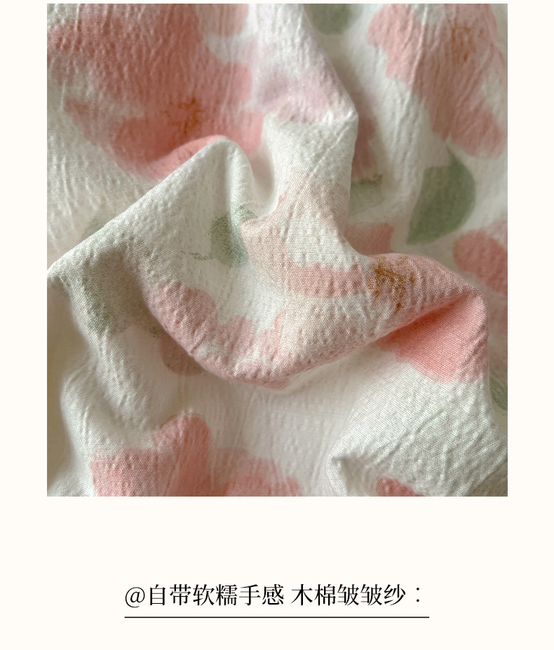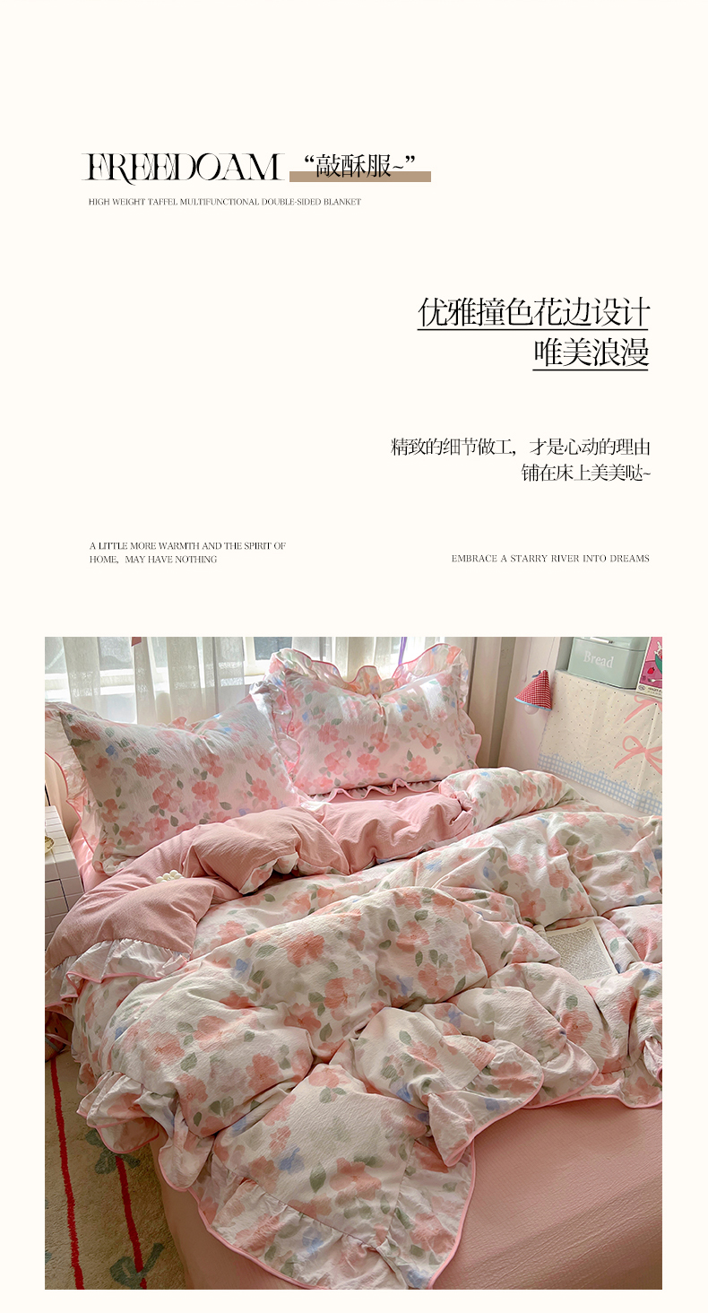 (总)睡美美家纺 2026新款水洗云朵棉亲肤花边款四件套,岛屿,蝴蝶,花序,花影,桃枝,田园,小碎花,星星人