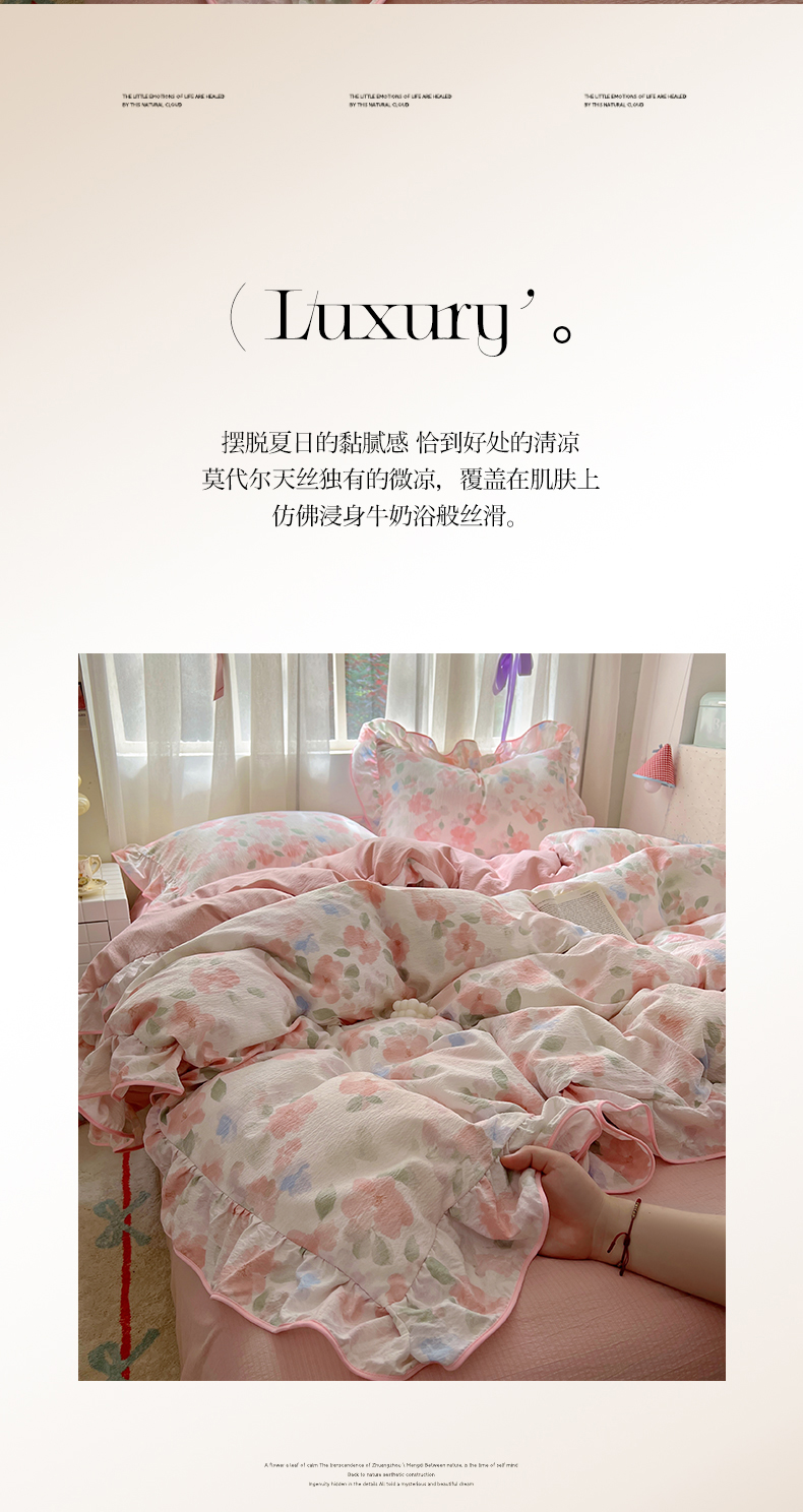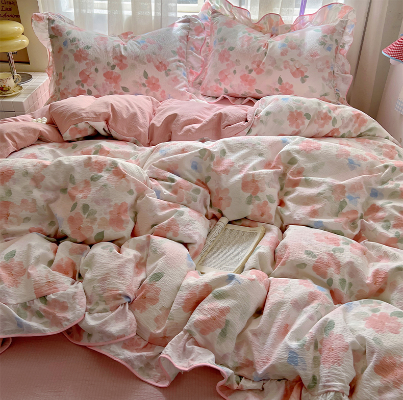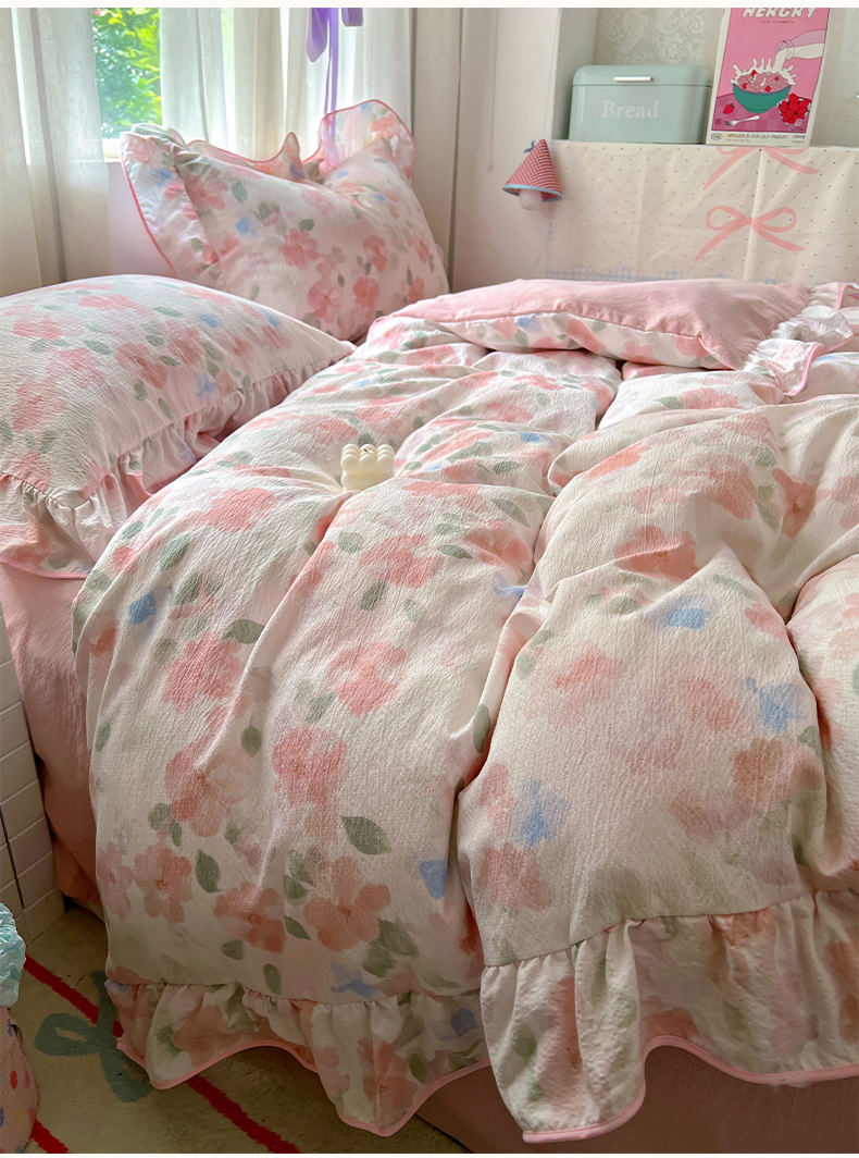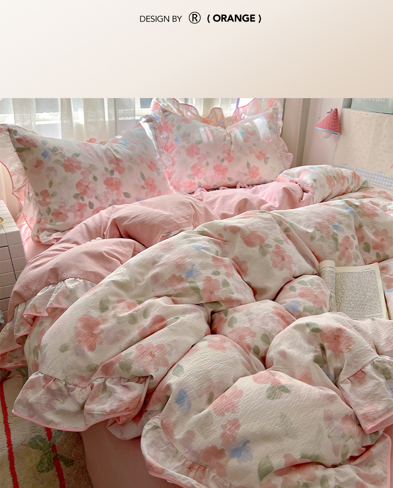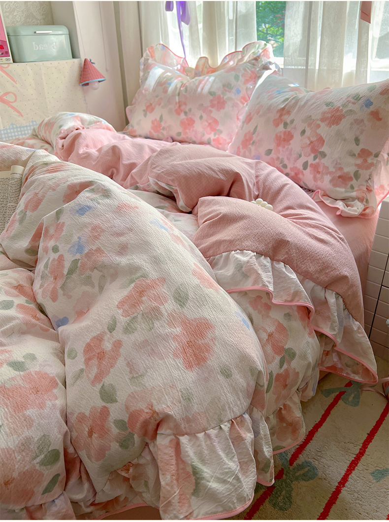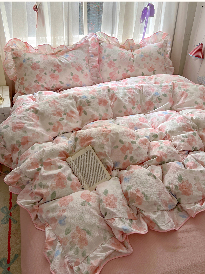 (总)睡美美家纺 2026新款水洗云朵棉亲肤花边款四件套,岛屿,蝴蝶,花序,花影,桃枝,田园,小碎花,星星人
