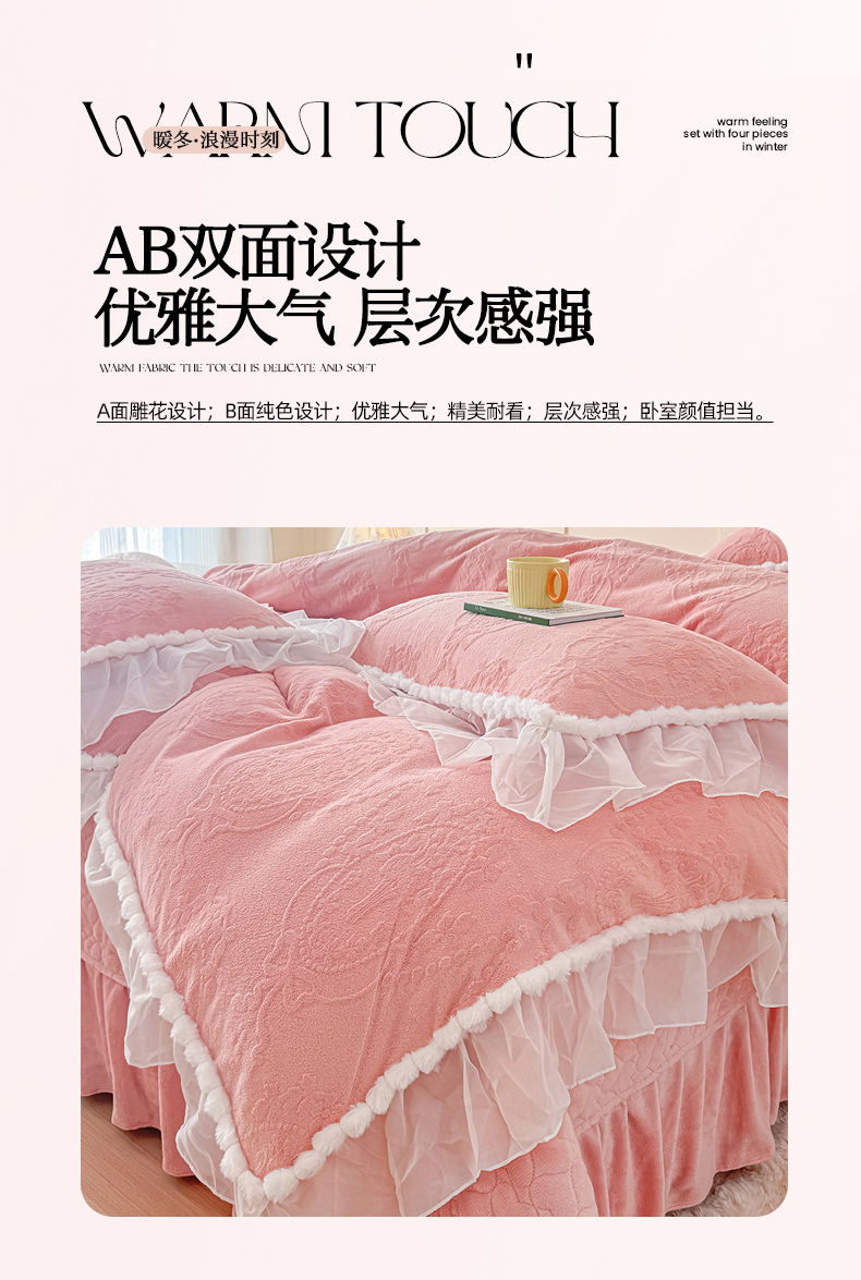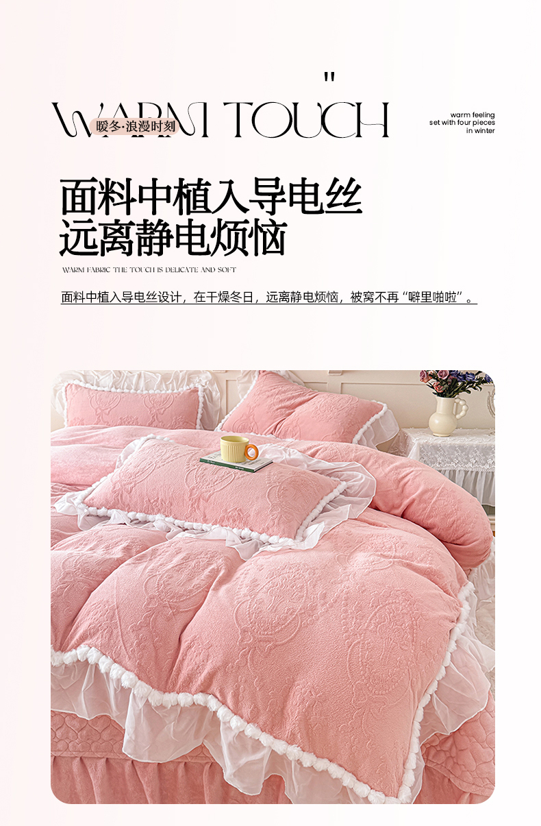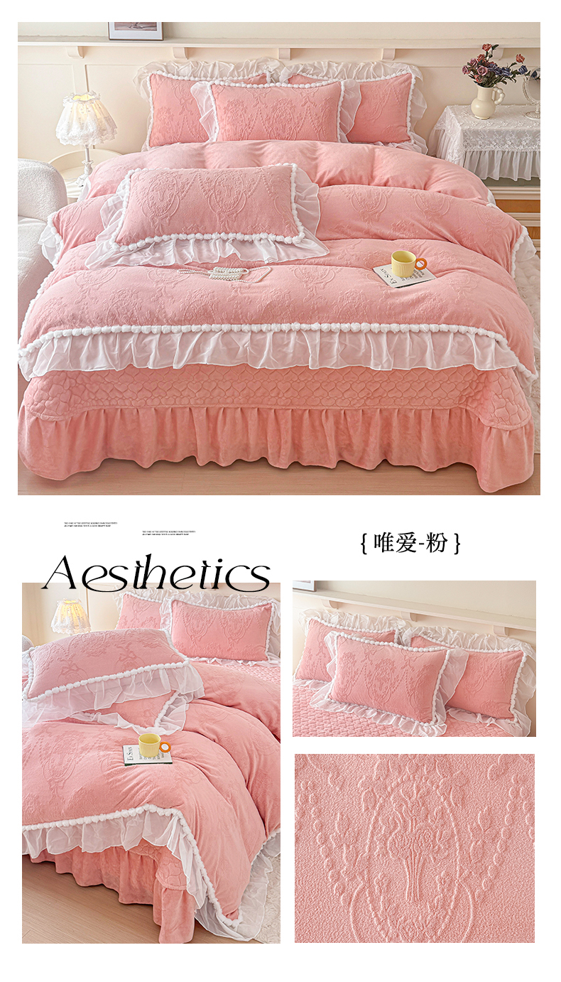 当前位置: 91家纺网 > 商品网购 > 床品套件 > 四件套 > 牛奶绒四件套 > 莉迪娅 2026新款230克全消光立体雕花牛奶绒夹棉床盖四件套法式大花边兔毛绒毛球加棉加厚保暖三四件套-唯爱 唯爱-粉